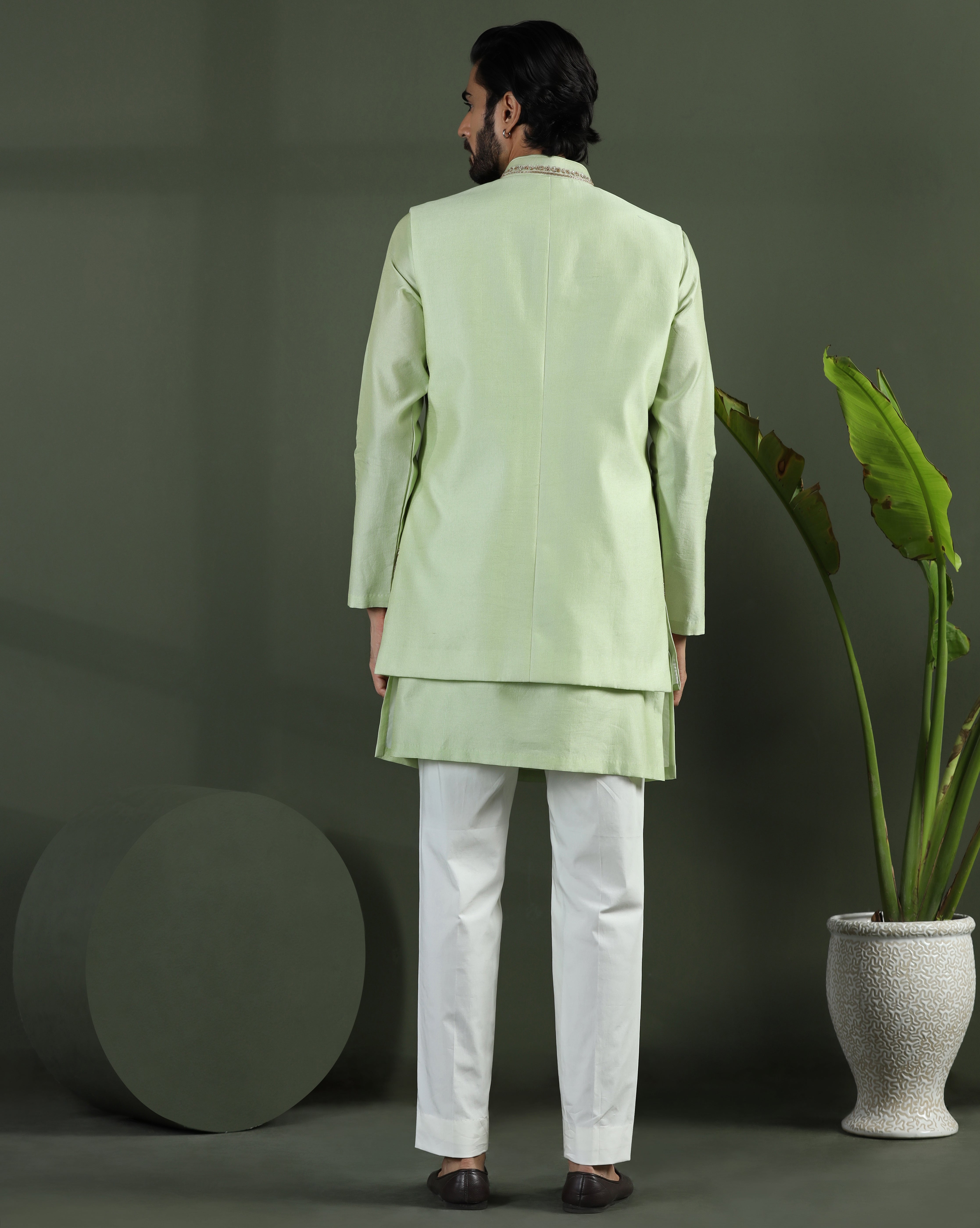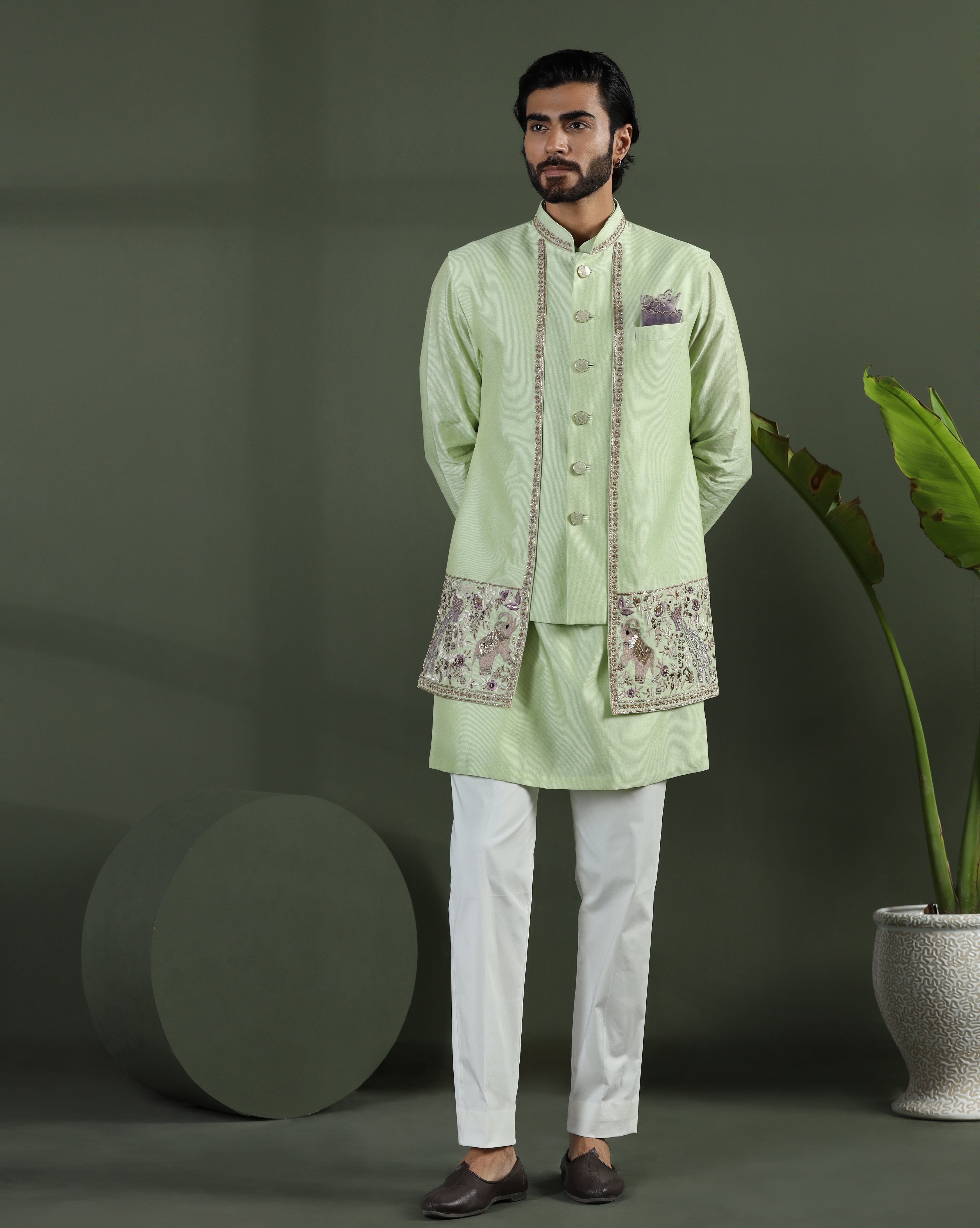 Featuring a fern green long jacket in zari kota fabric embellished using multicolour thread work and sequins. This jacket is paired with a coordinated kurta in zari kota. This is a three piece set featuring jacket, kurta and trouser.