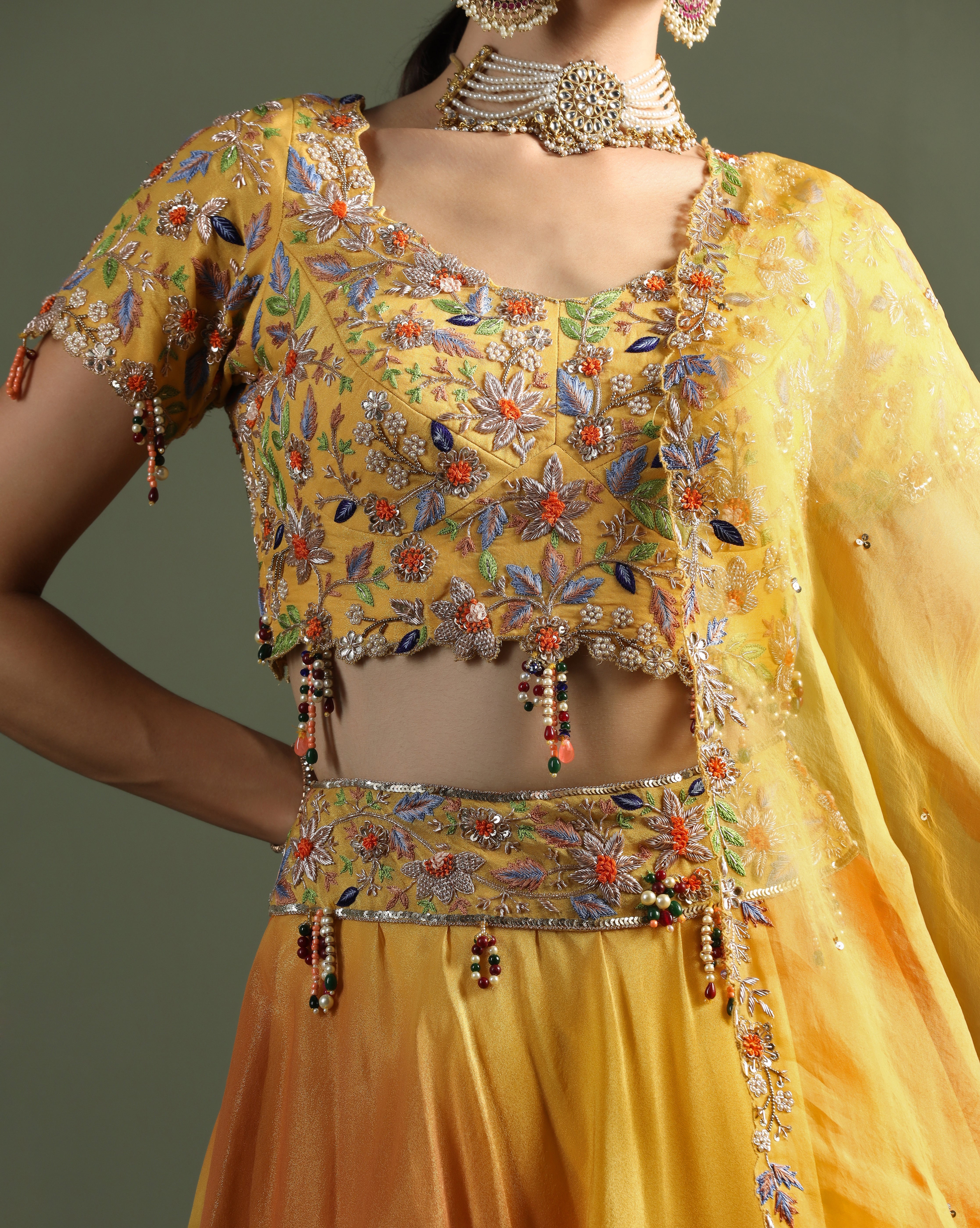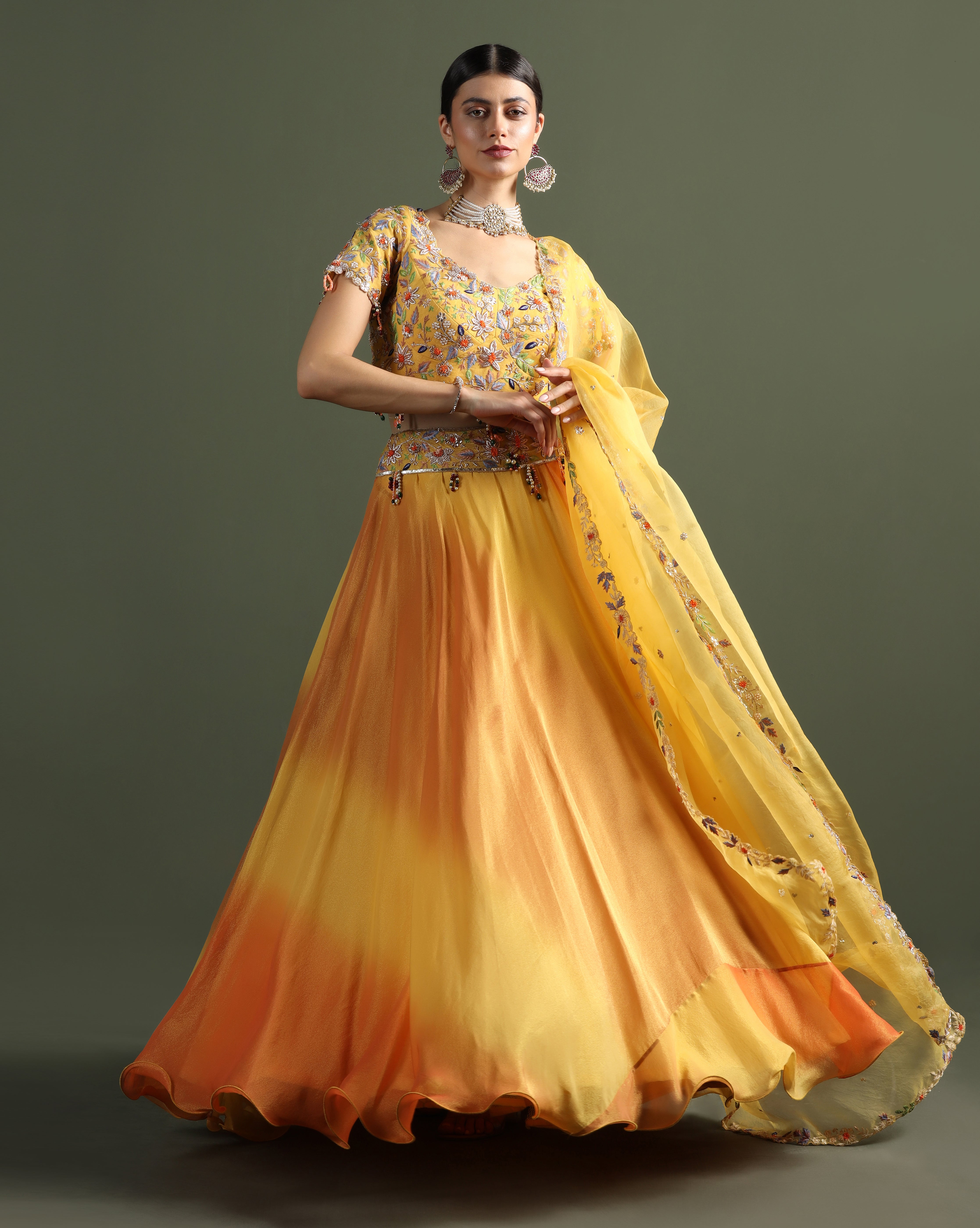 Featuring a shaded sunrise yellow lehenga in tissue organza complimented with an embroidered blouse using multicoloured threads and beads. This lehenga is enhanced using multicoloured drops and is paired with an embroidered dupatta. This is a three piece outfit including lehenga, blouse and dupatta.