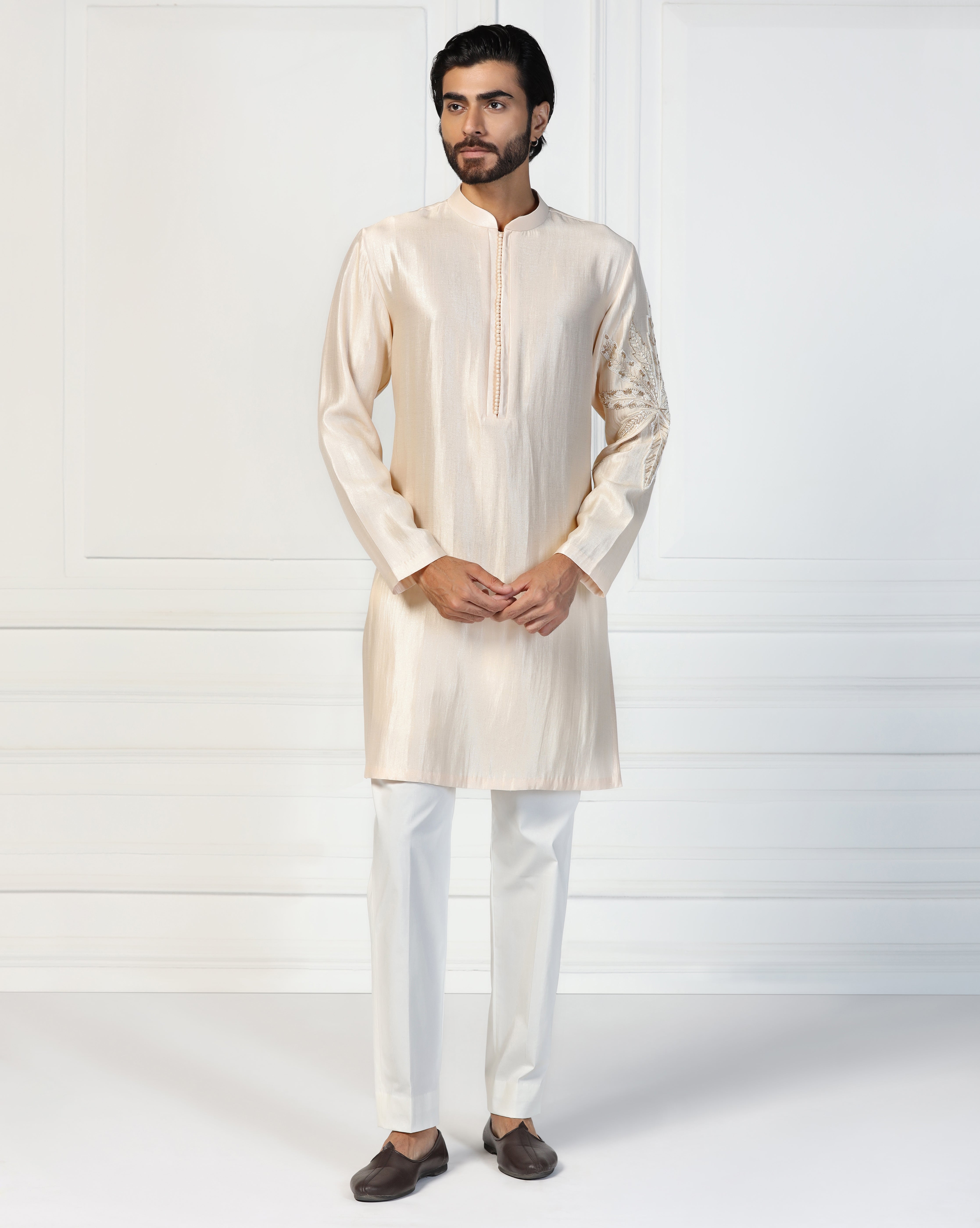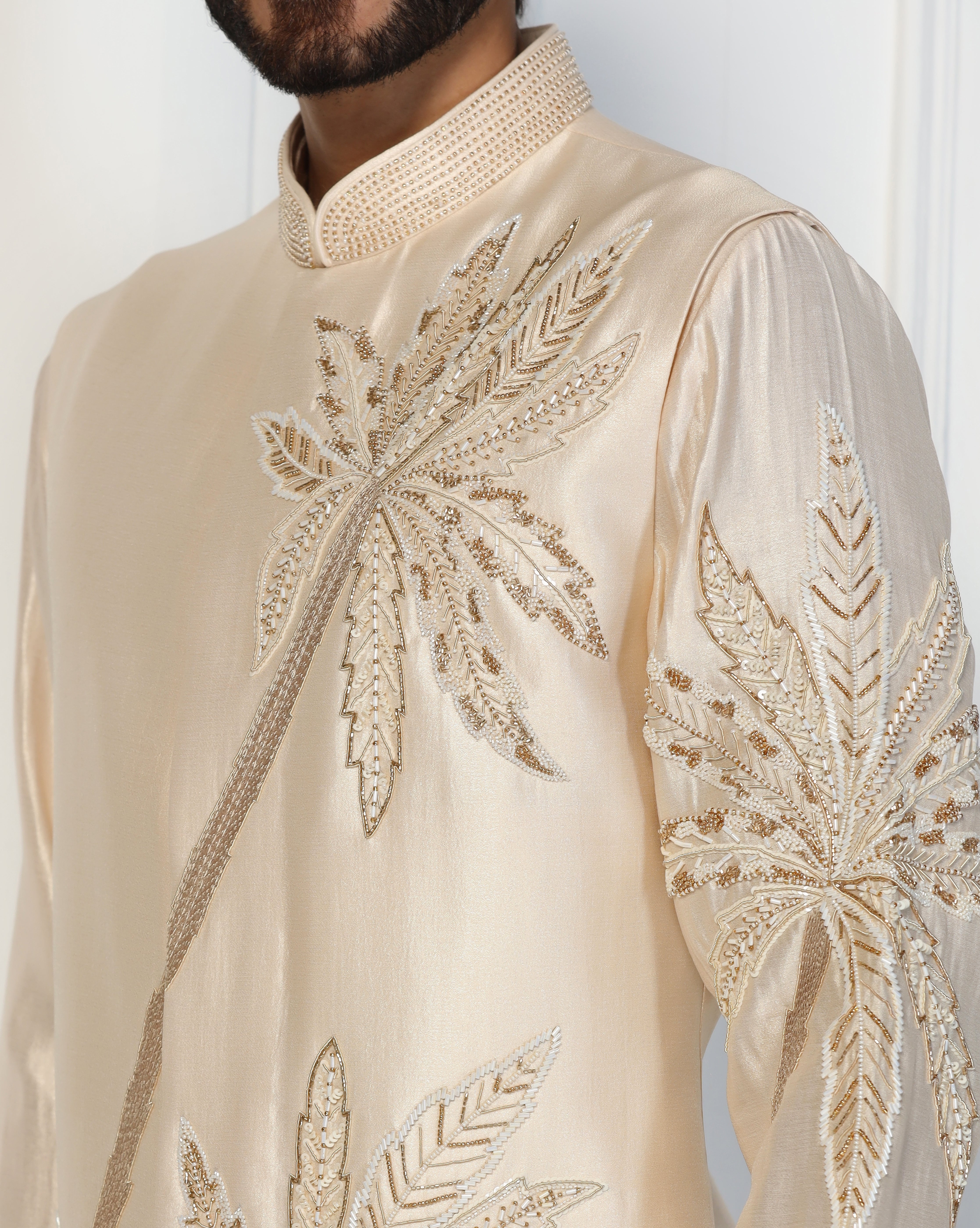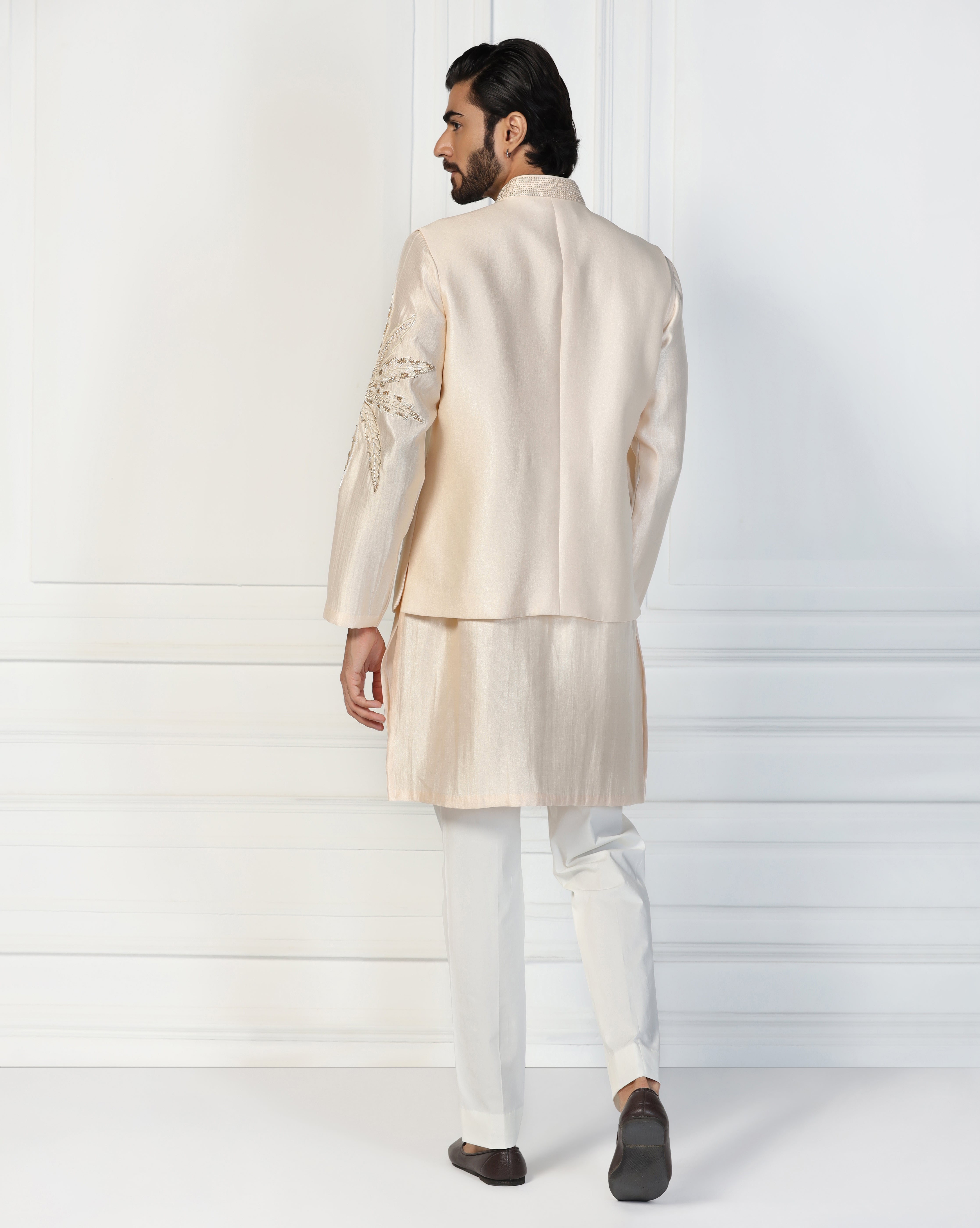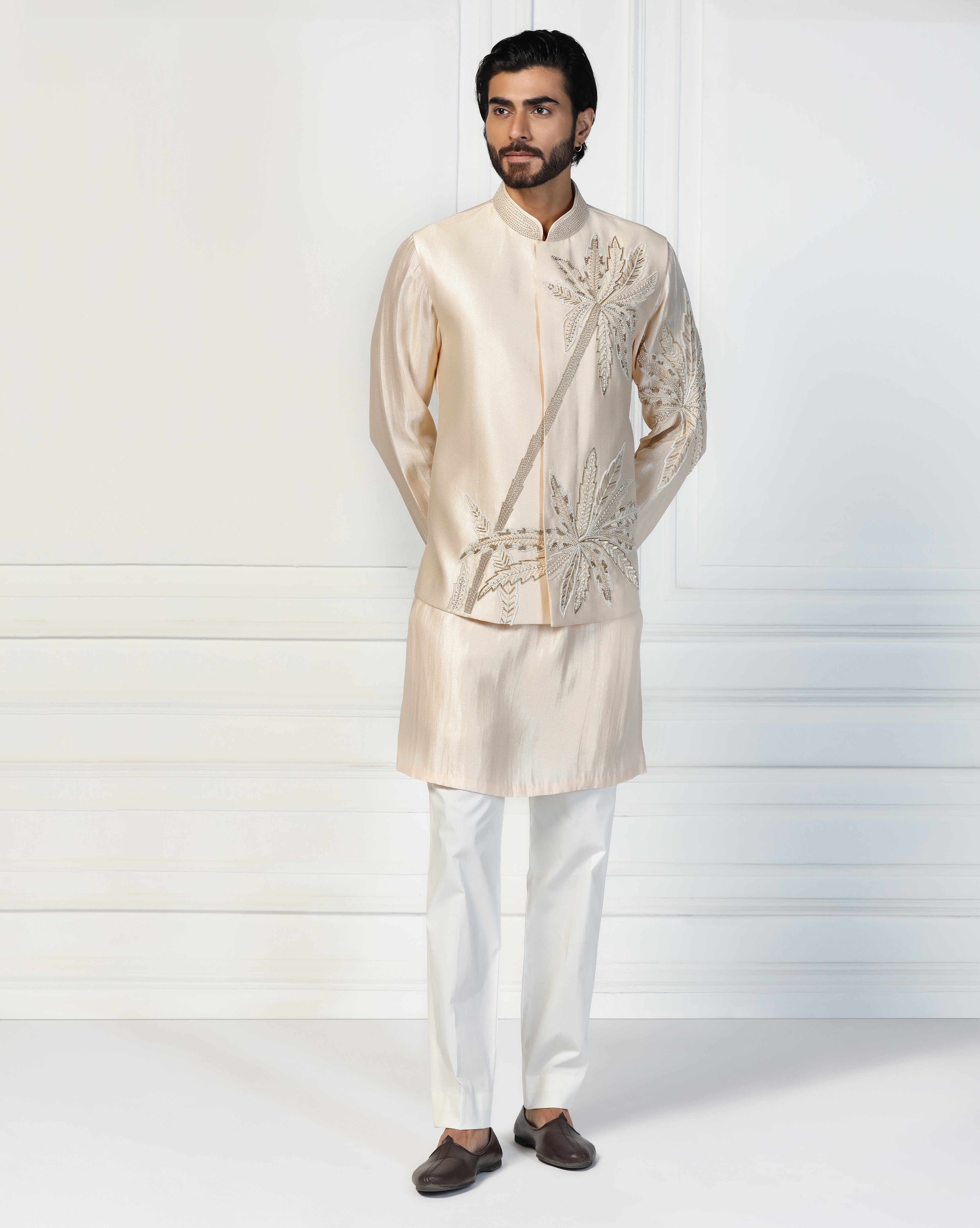 Featuring a champagne beige nehru jacket in shimmer silk embellished using multicolour thread work and sequins. This nehru jacket is paired with a coordinated kurta in shimmer silk. This is a three piece set featuring nehru jacket, kurta and trouser.