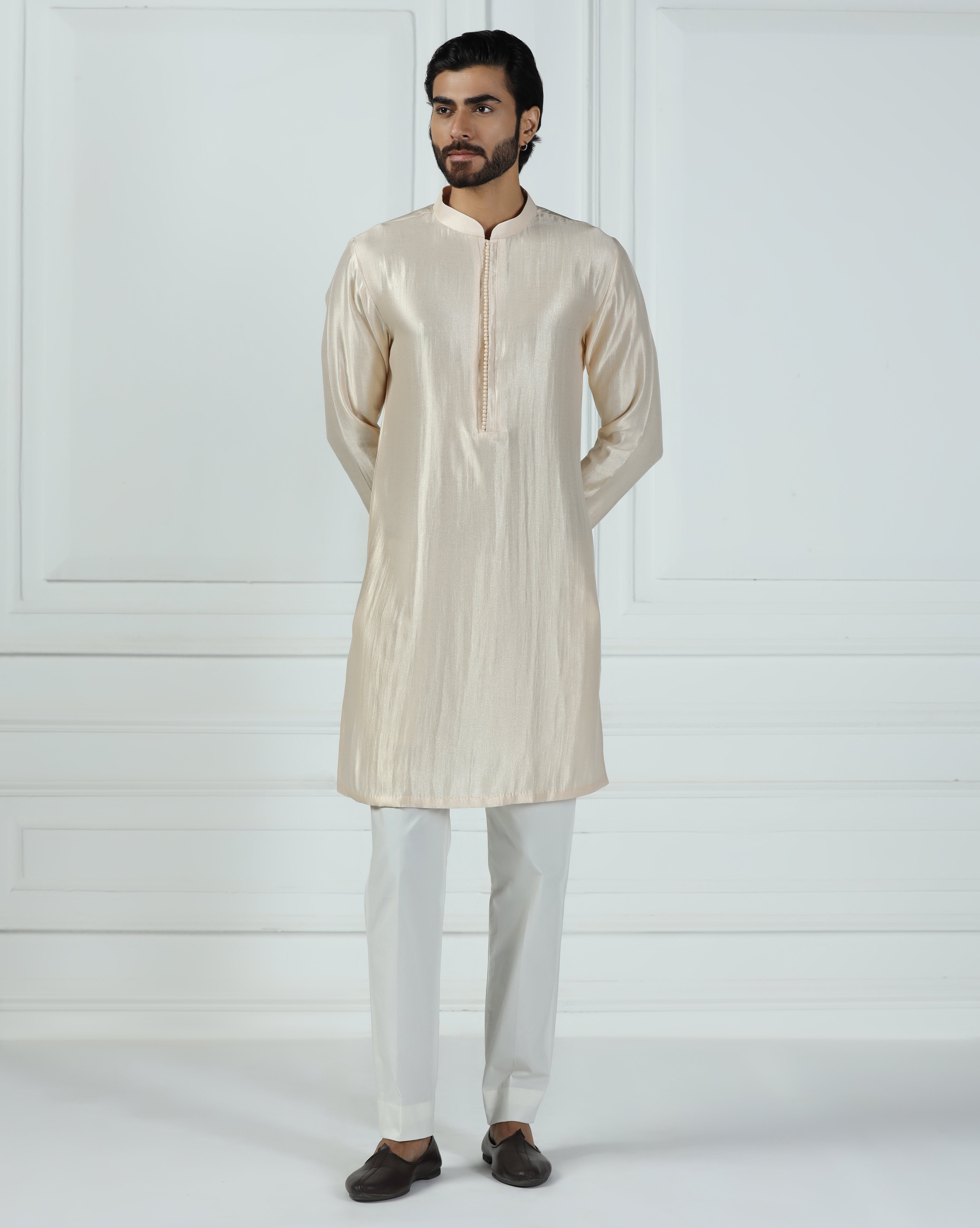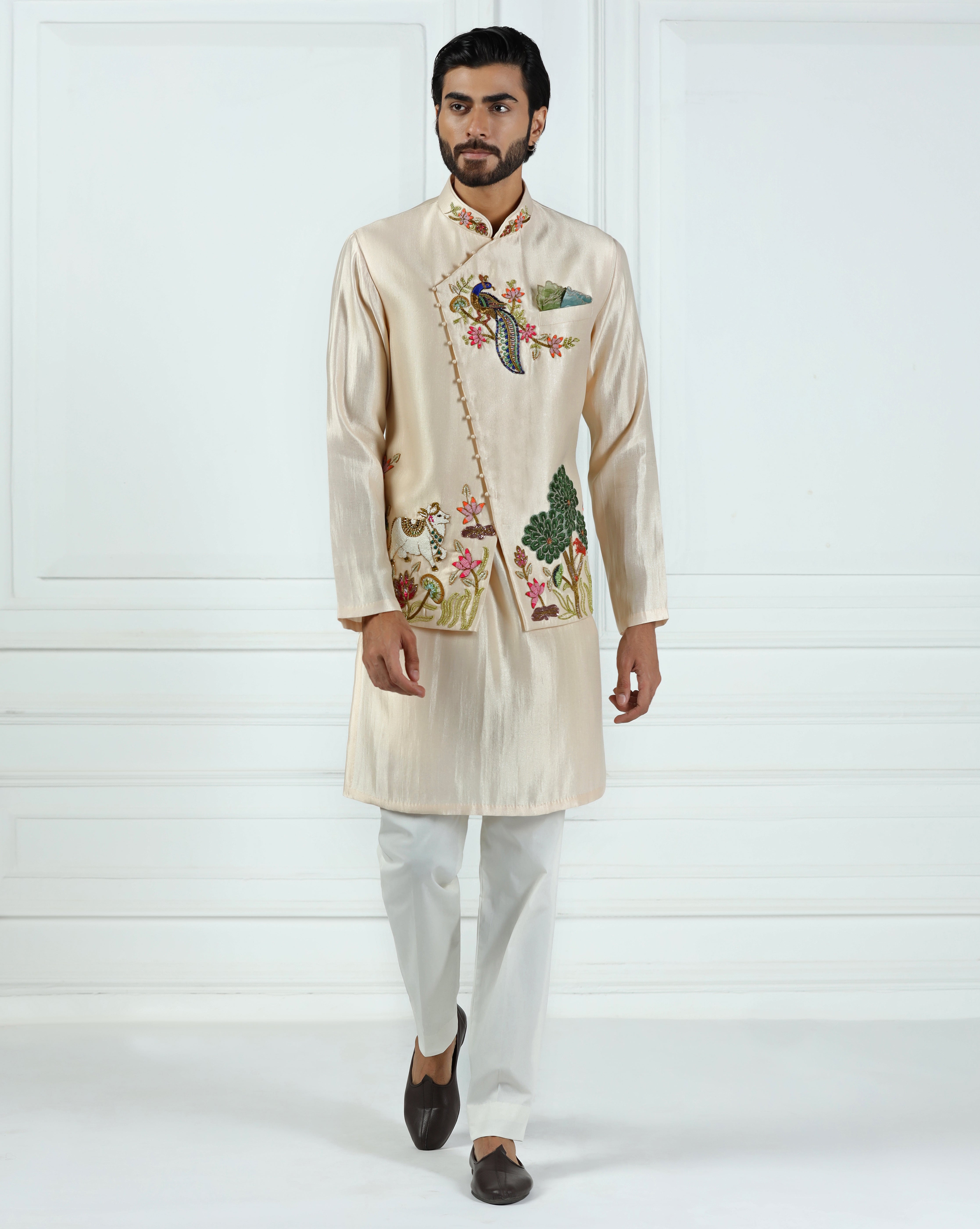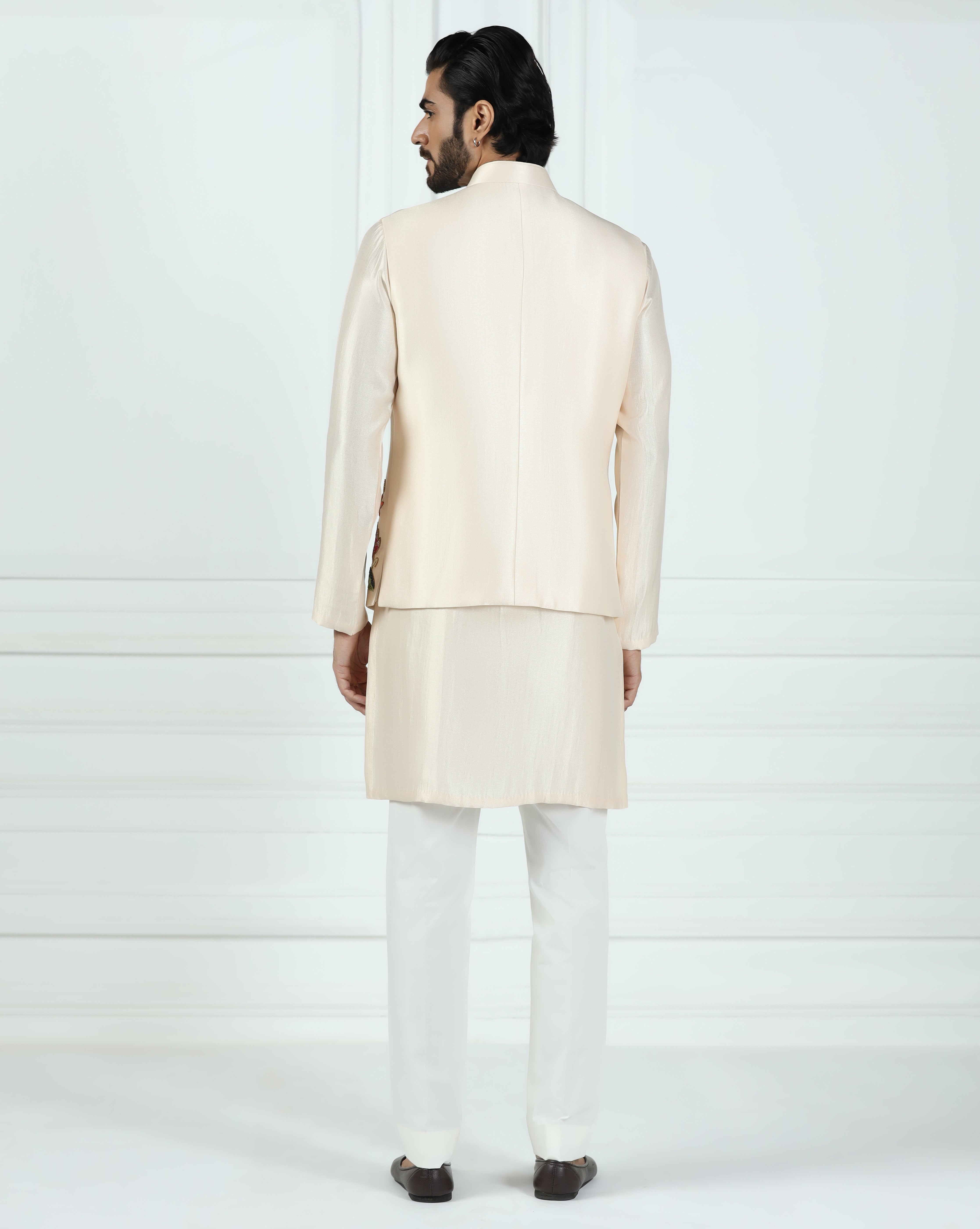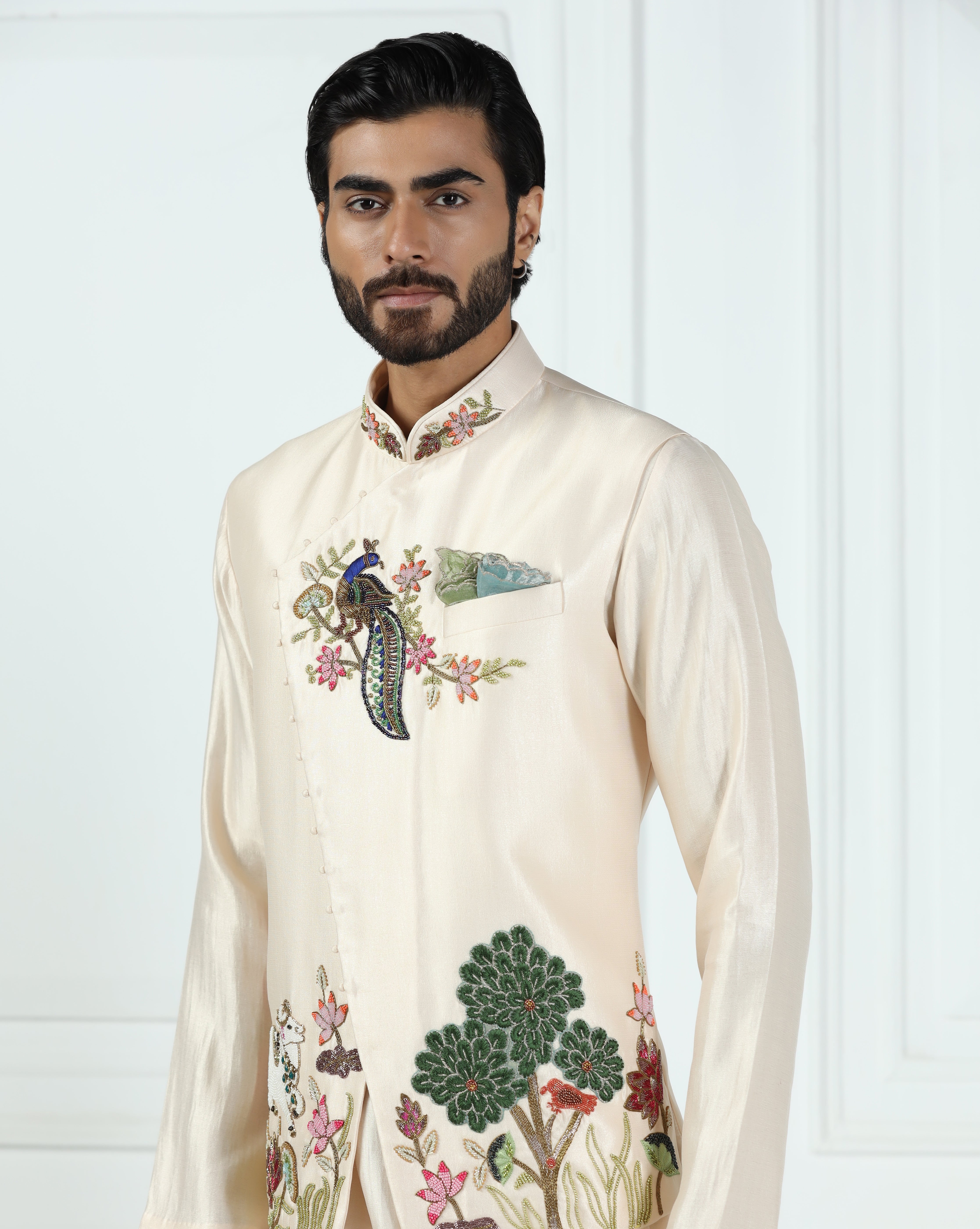 Featuring an asymmetric icey beige nehru jacket in shimmer silk embellished using multicolour thread work and sequins. This jacket is paired with a coordinated kurta in shimmer silk. This is a three piece set featuring jacket, kurta and trouser.