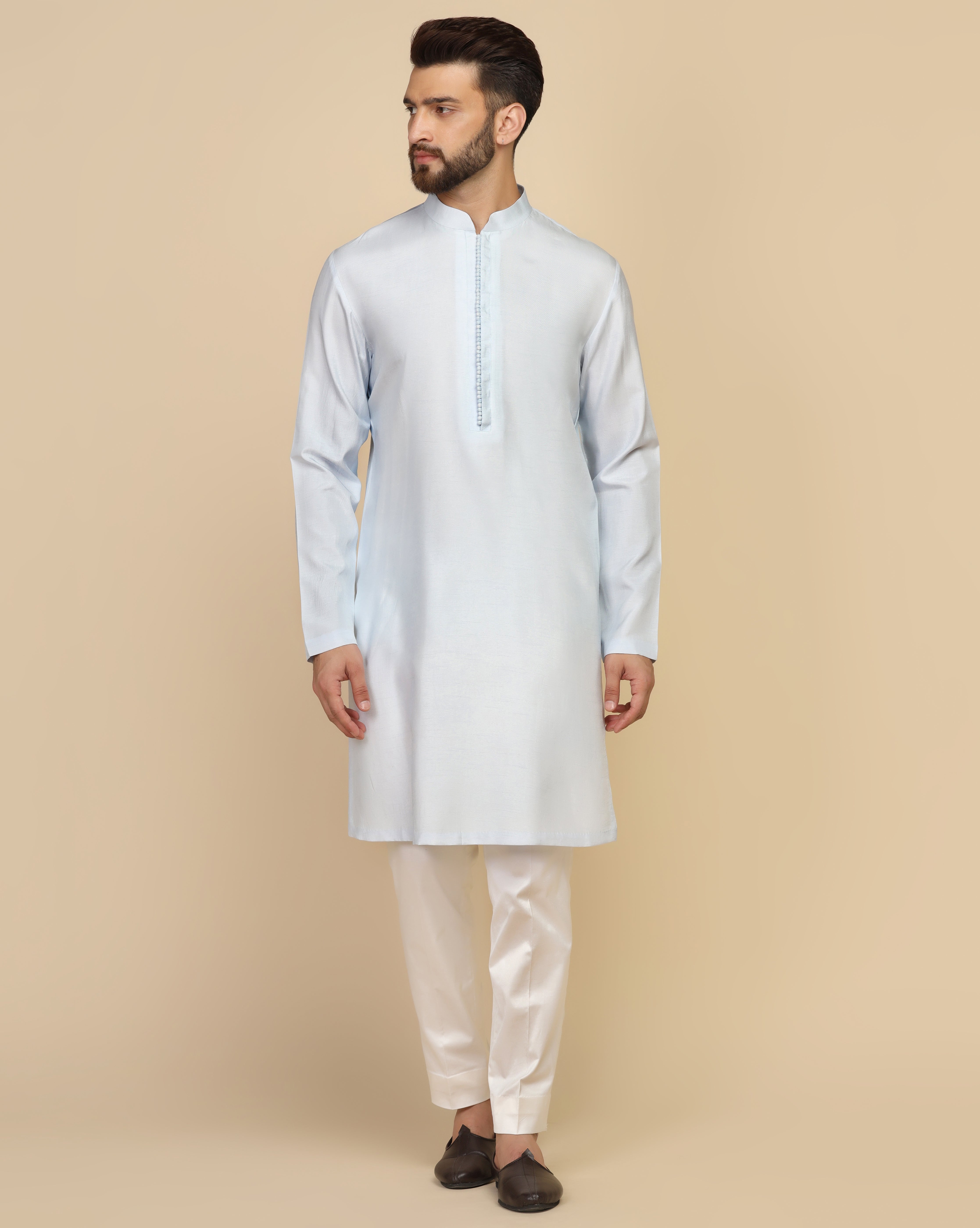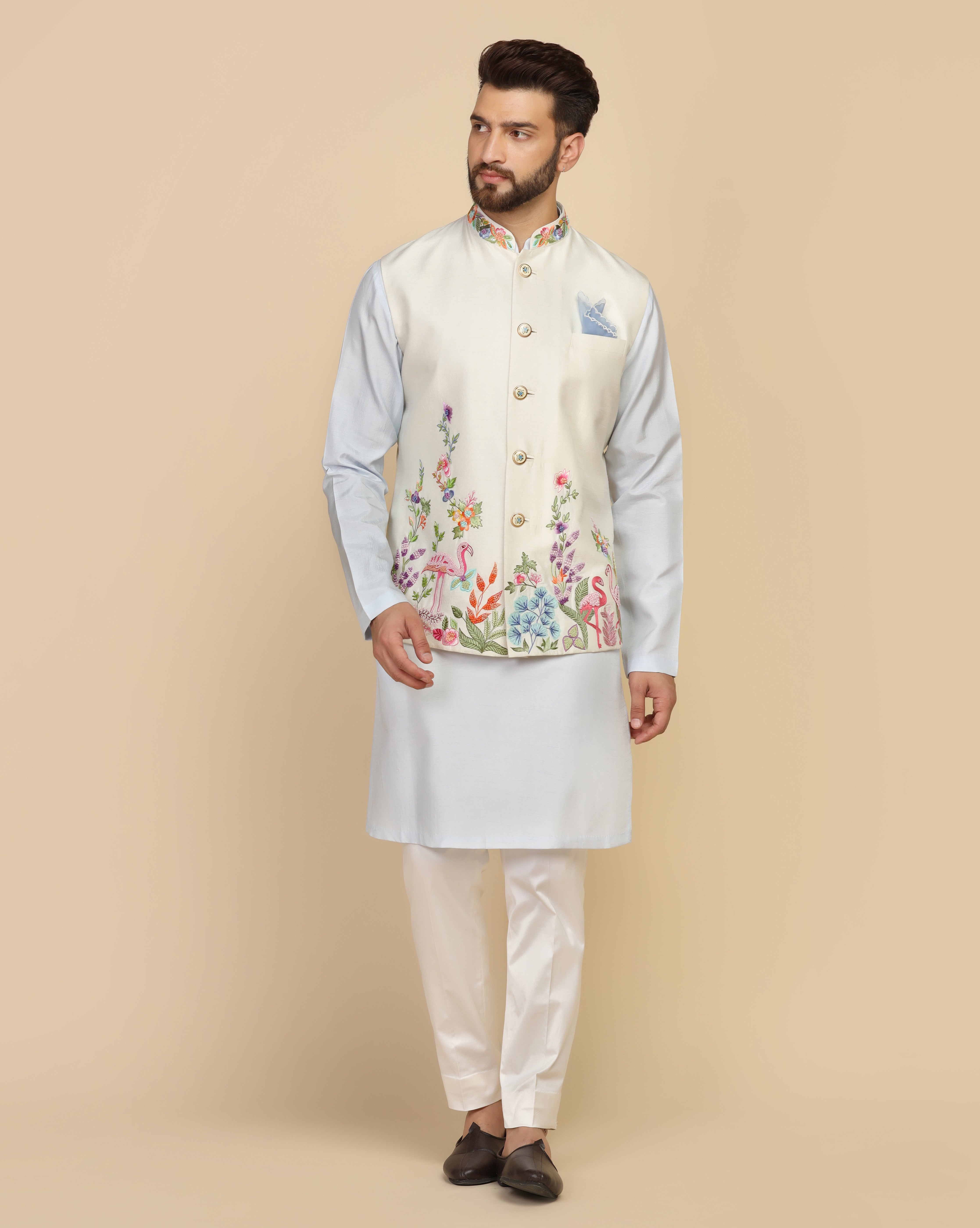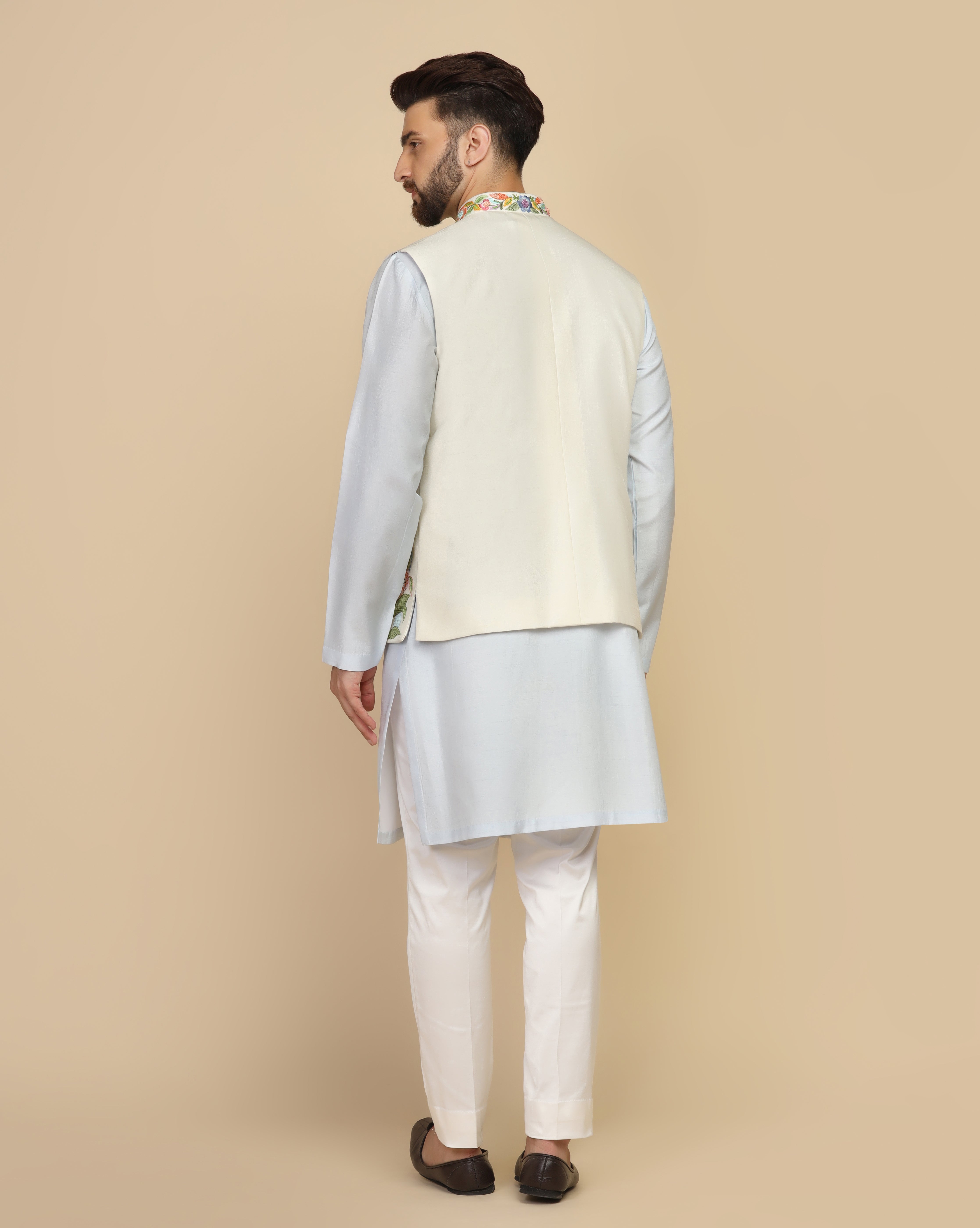 Featuring an ivory white nehru jacket in viscose silk embellished using multicolour thread work and beads. This nehru jacket is paired with a viscose silk kurta. This is a three piece set featuring nehru jacket, kurta and half elastic trouser.
