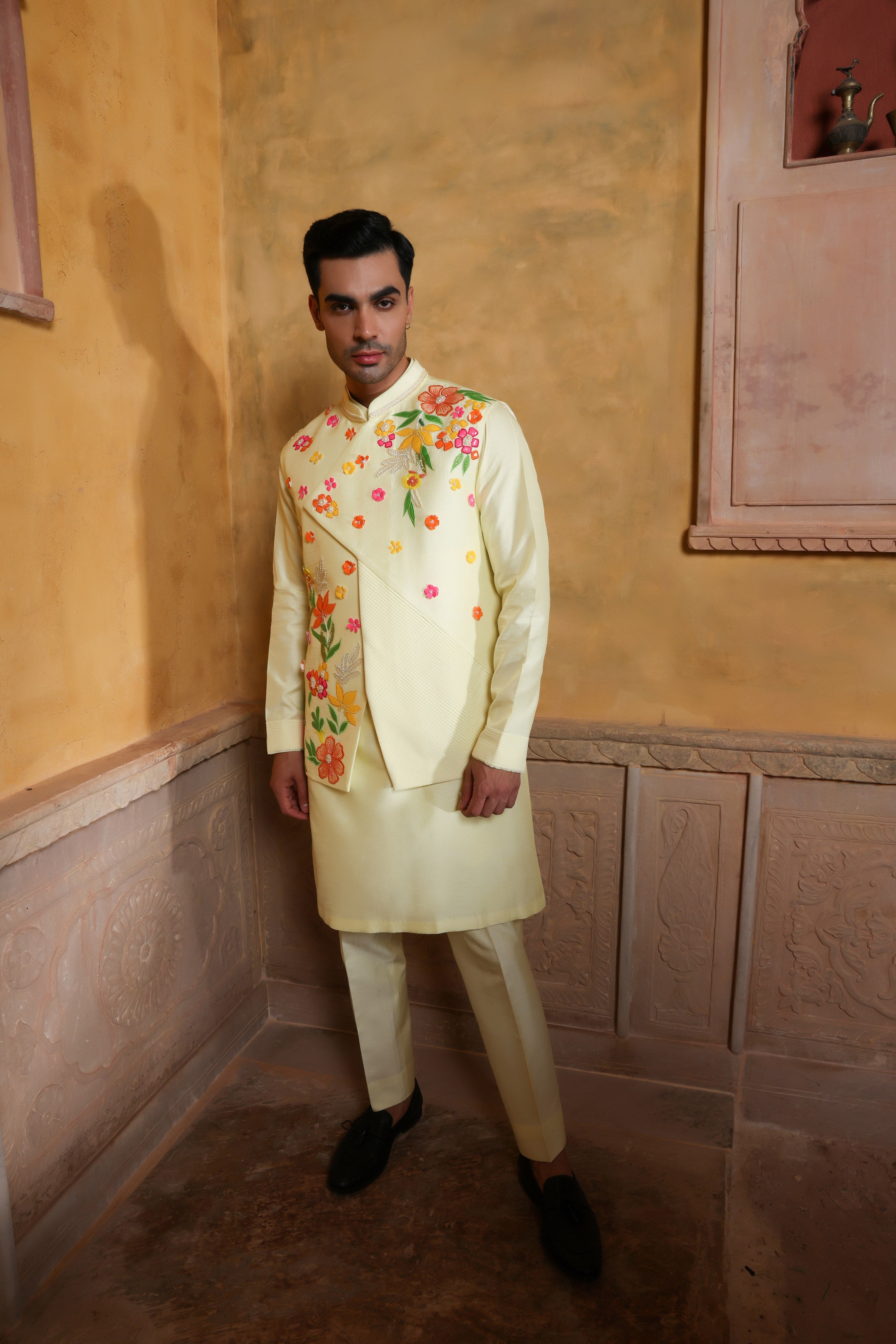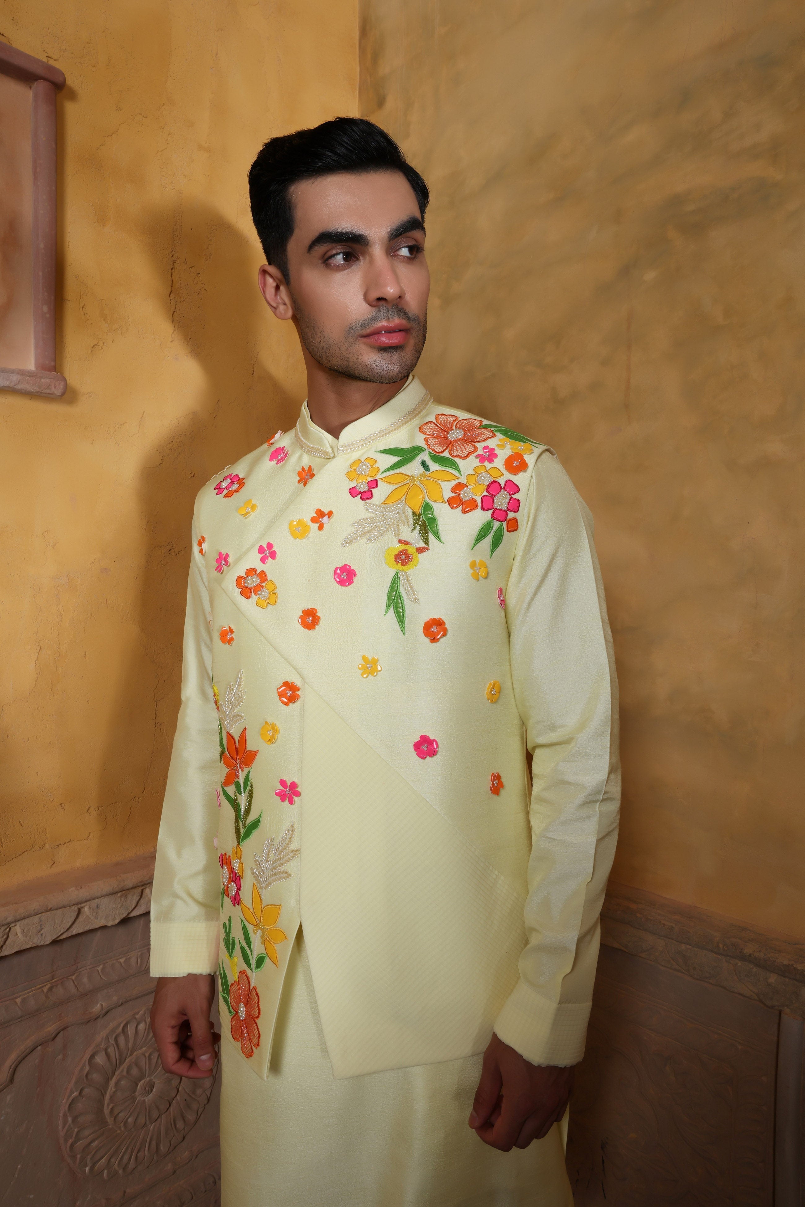 Featuring a mellow yellow waist coat in viscose silk embellished using multicolour appliqué work. This waist coat is enhanced with an asymmetric cut and pleating on one panel. This is a three piece set featuring waist coat, kurta and trouser.