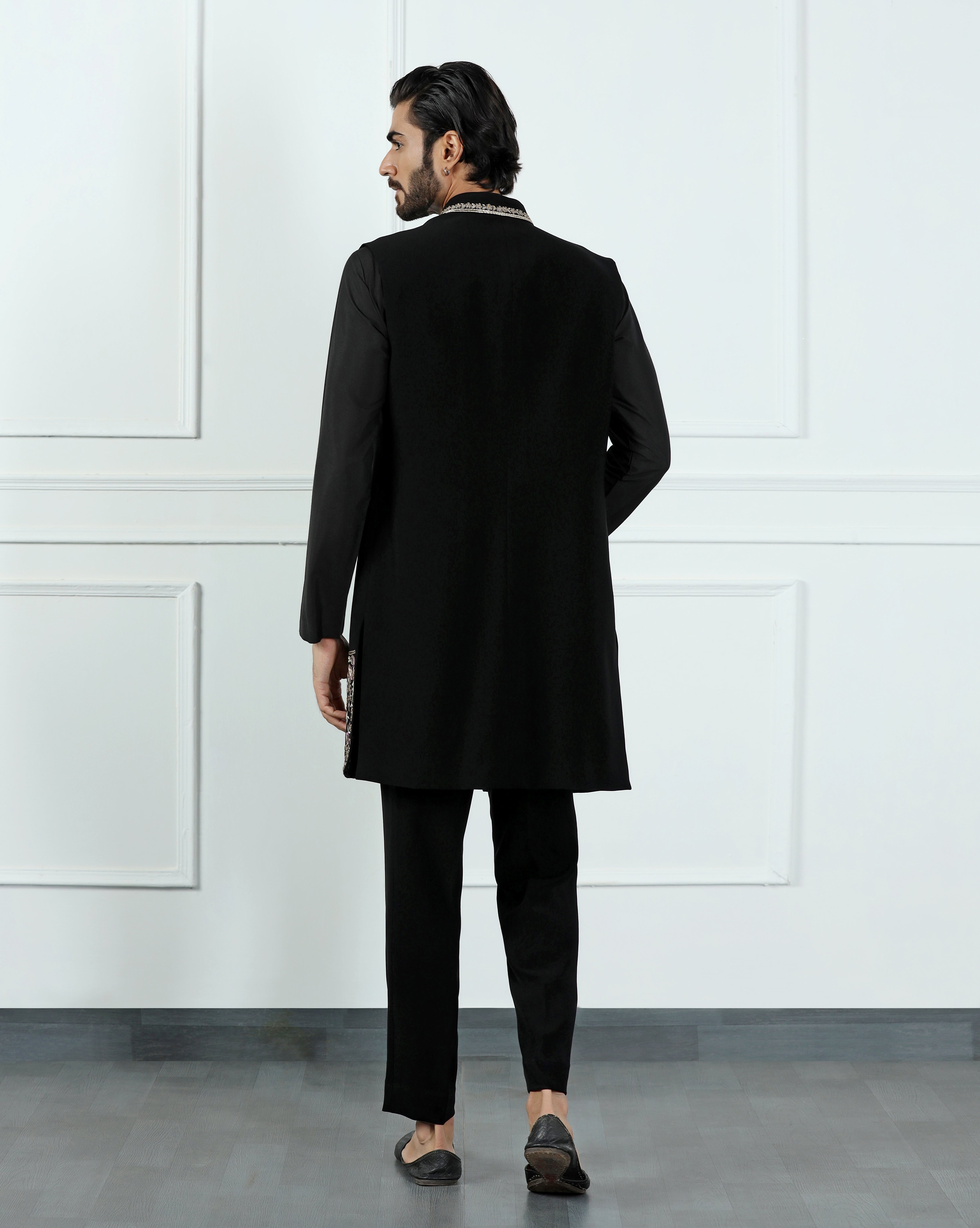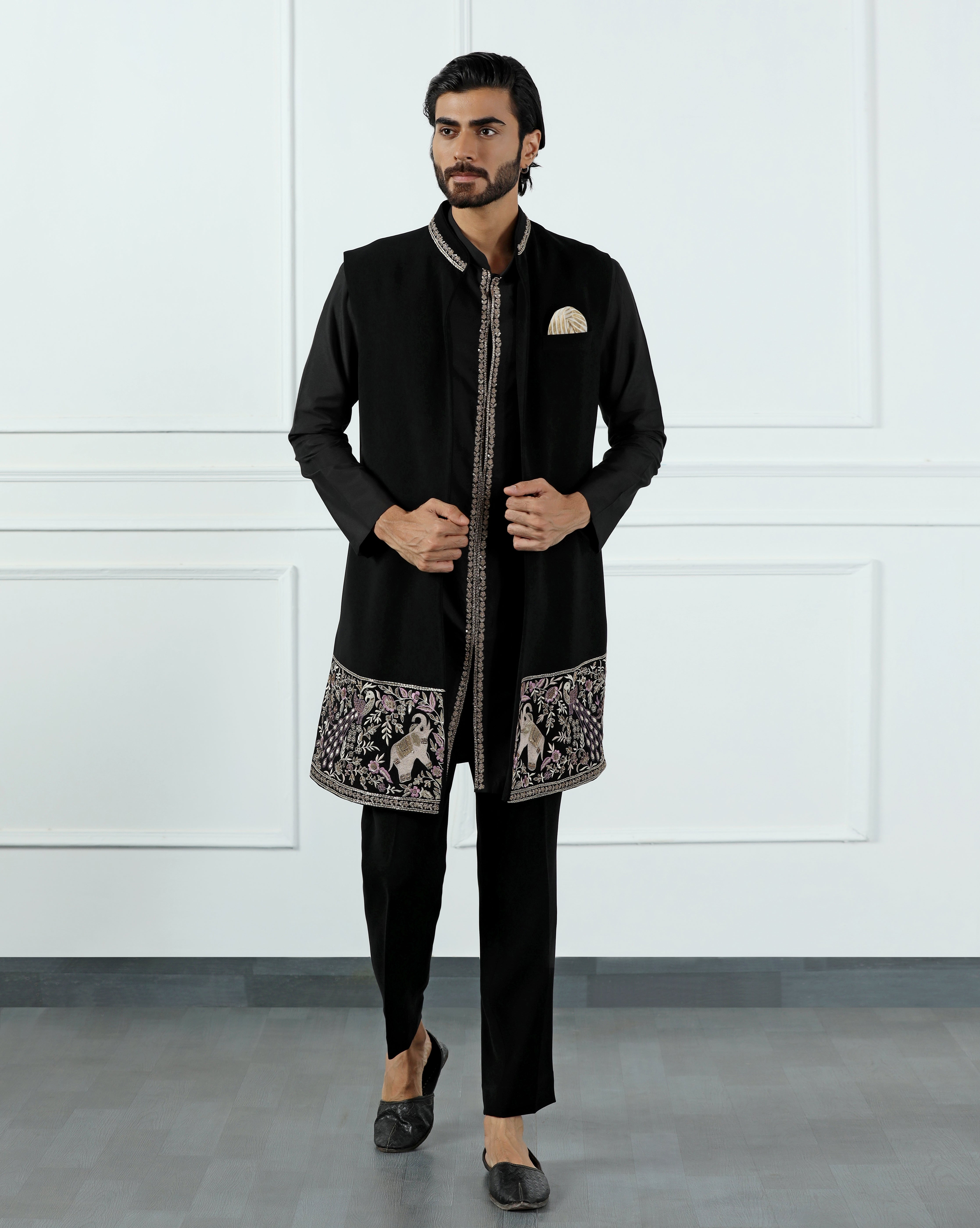 Featuring an onyx black open jacket in poly crepe embellished using multicolour thread work and sequins. This jacket is paired with an embroidered kurta in cotton silk. This is a three piece set featuring jacket, kurta and trouser.