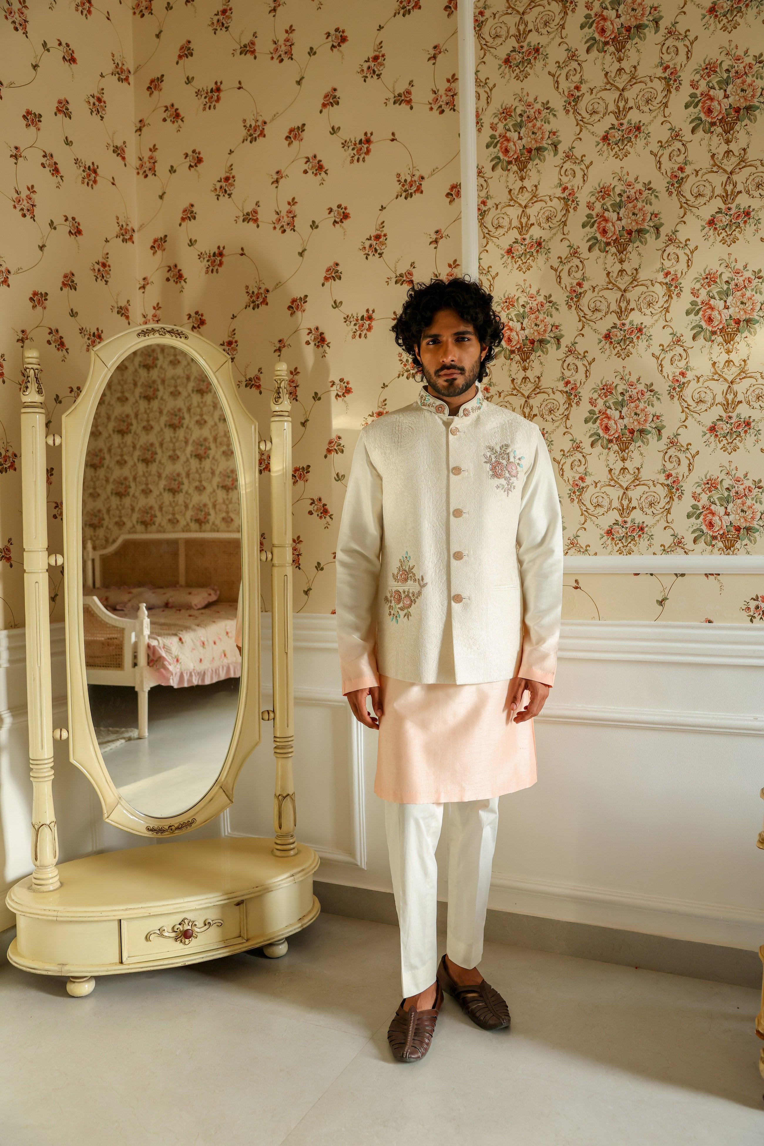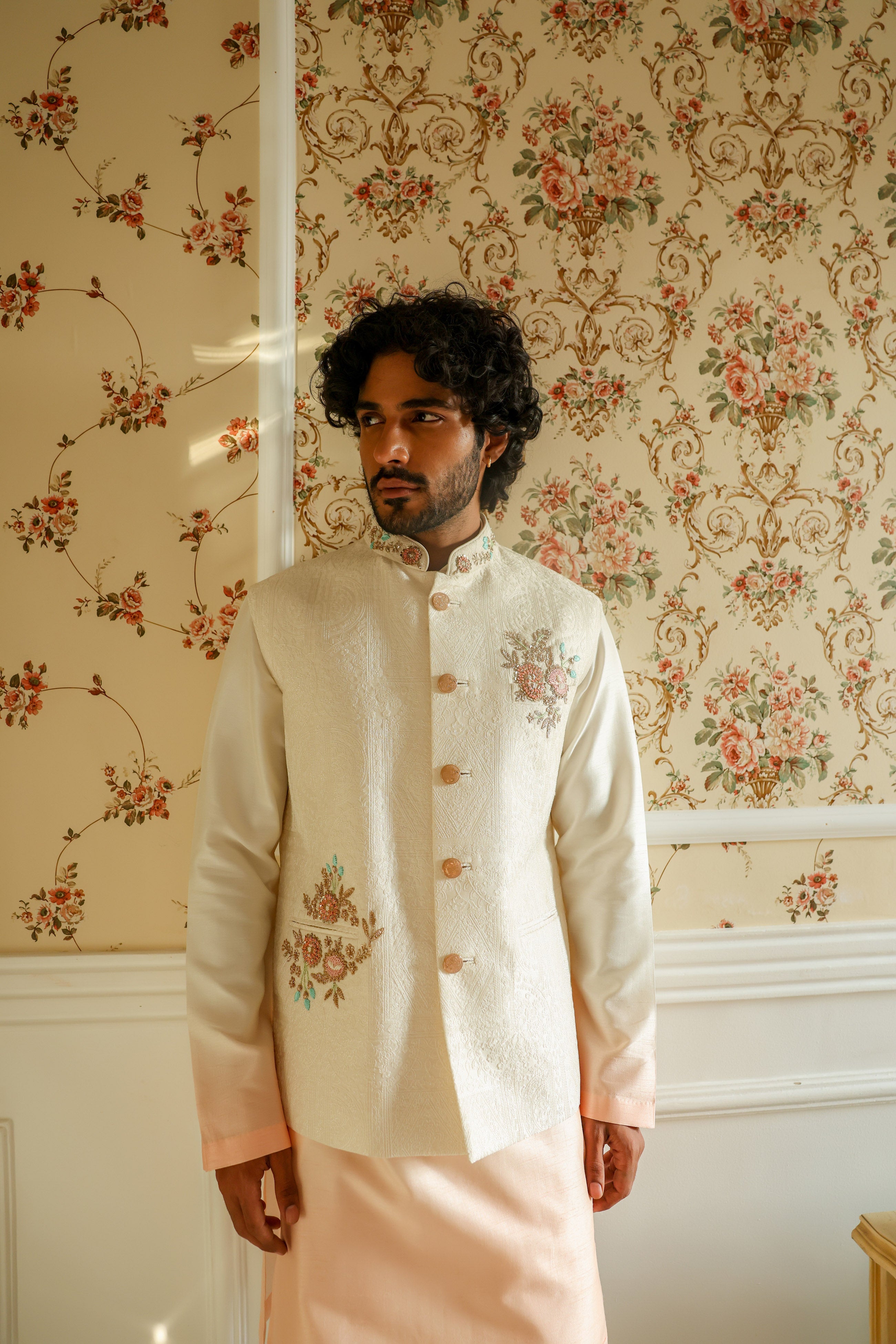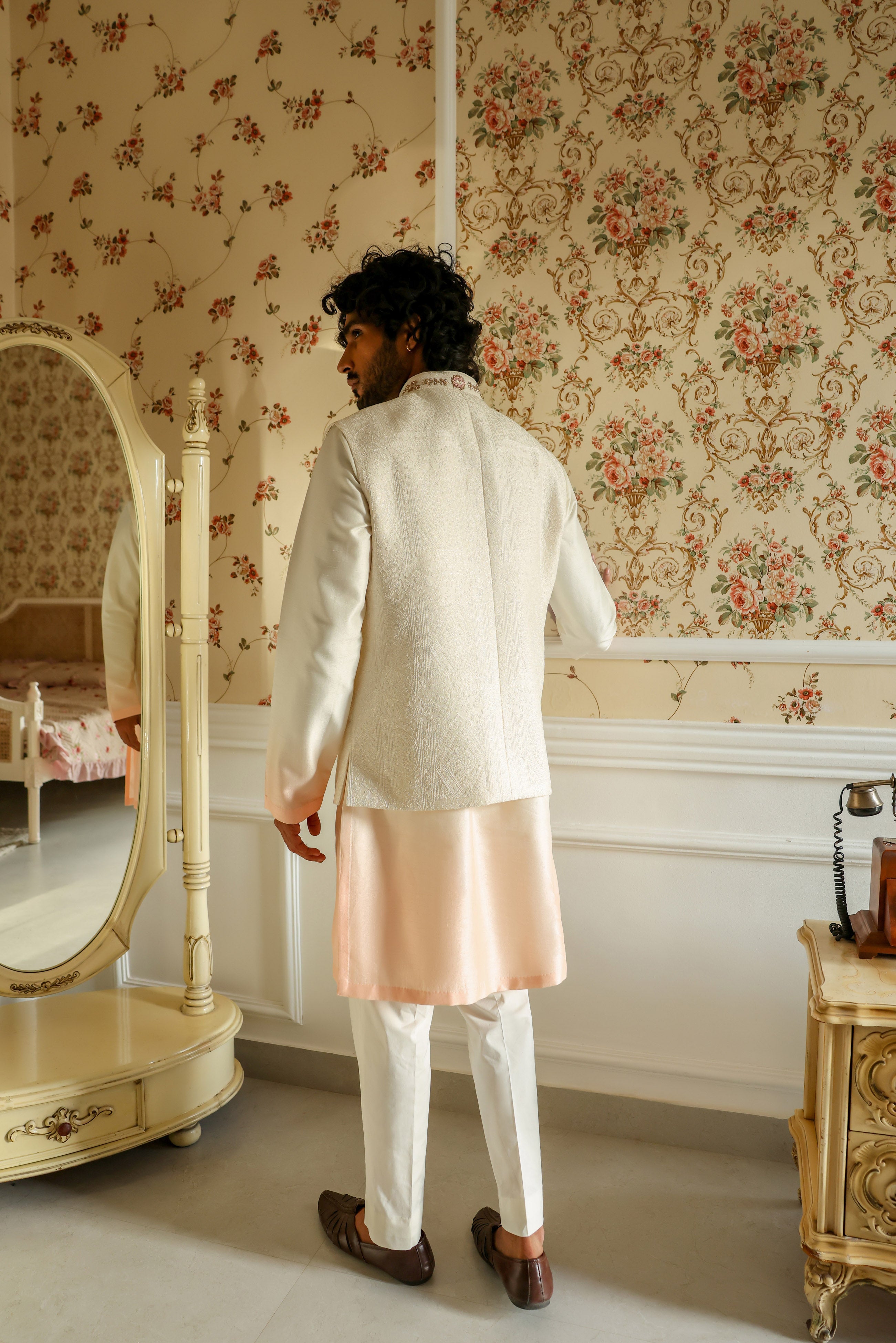 Featuring a peach ombré waist coat in embroidered chanderi embellished using thread, beads and french wire. This waist coat is paired with an ombré dyed kurta in viscose silk and half elastic trouser. This is a three piece set featuring waist coat, kurta and trouser.