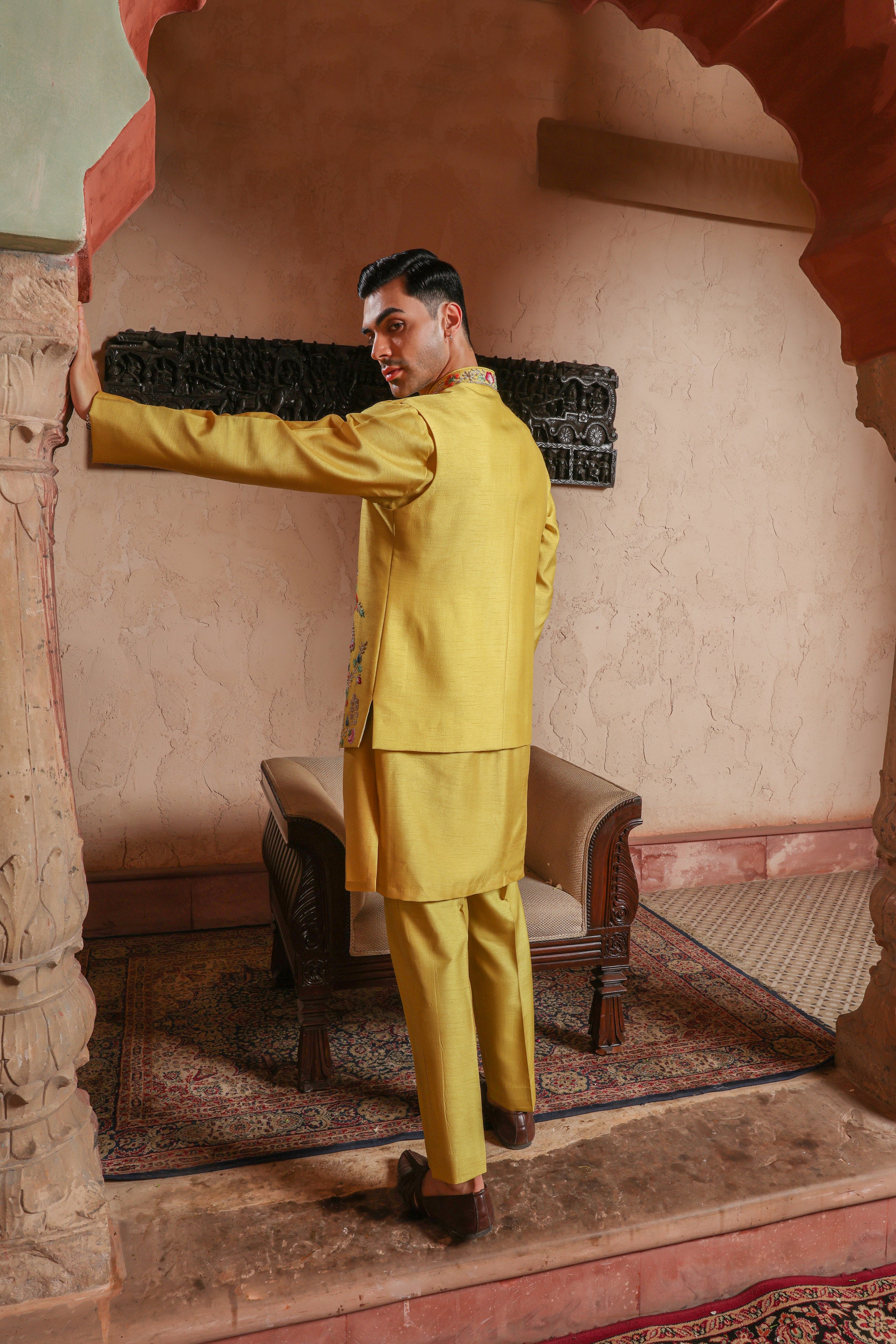 Featuring a tuscany green waist coat in viscose silk embellished using multicolour thread work, beads and french wire. This waist coat is enhanced with crushed tissue panels on one side and paired with a half elastic trouser. This is a three piece set featuring waist coat, kurta and trouser.