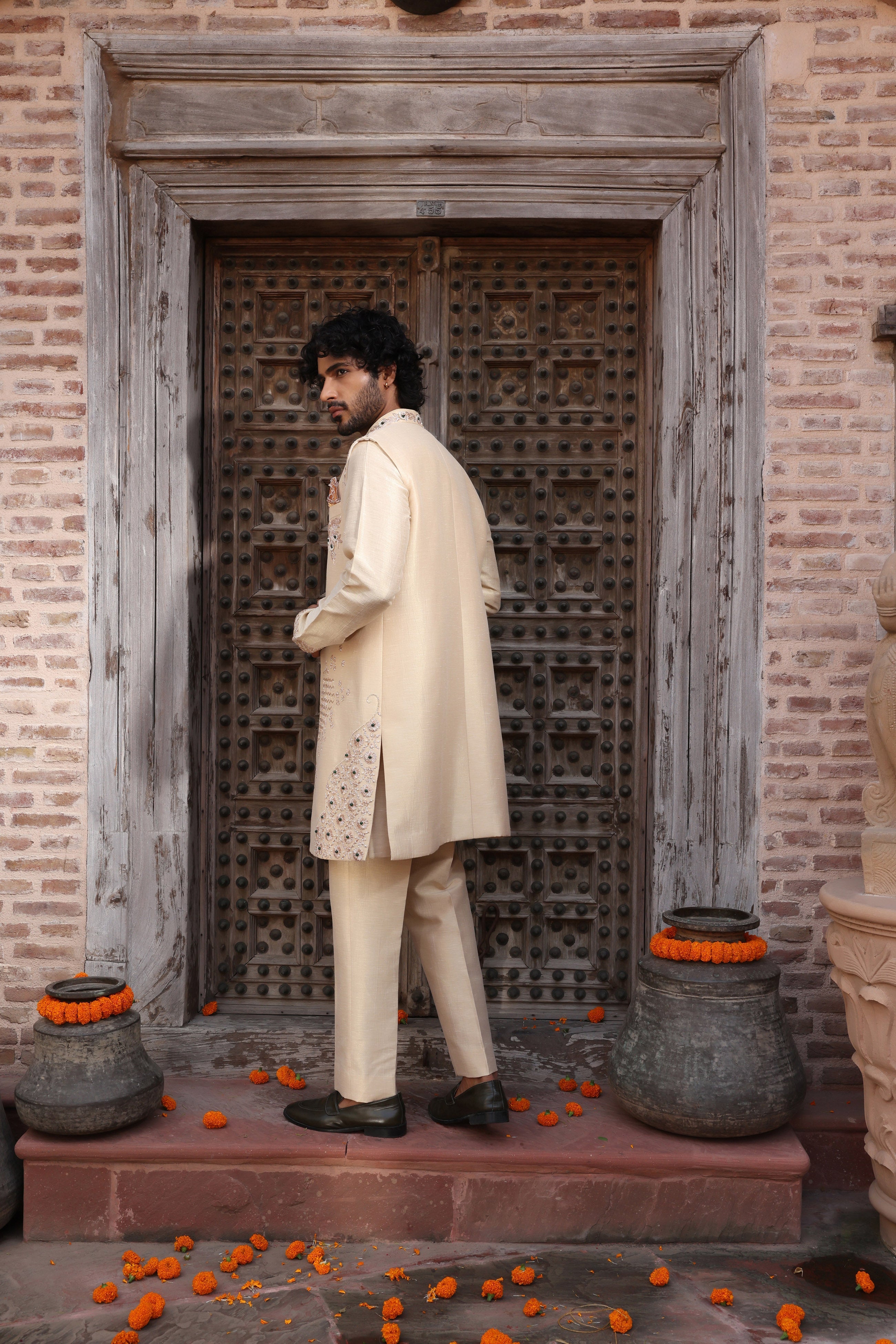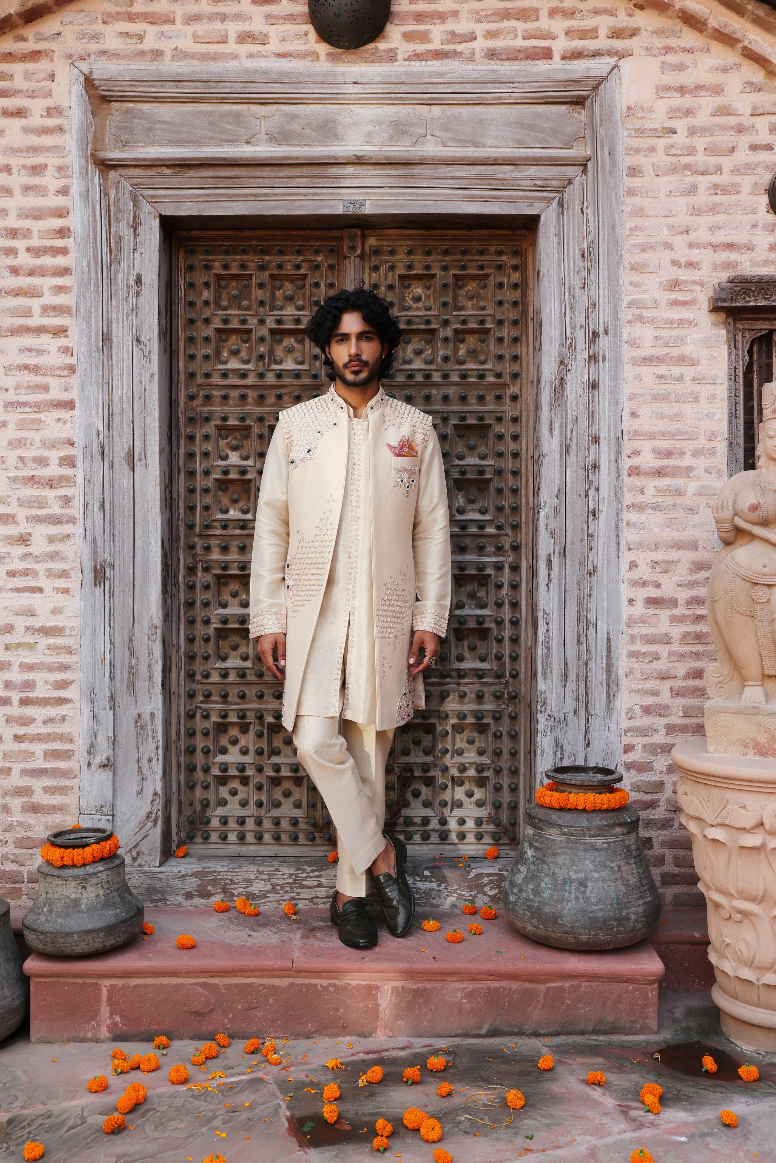 Featuring a rose gold long jacket in zari satin embroidered using french wire and semi precious stones. This jacket is paired with embroidered front open kurta. This is a three piece set featuring sleeveless long jacket, kurta and trouser.