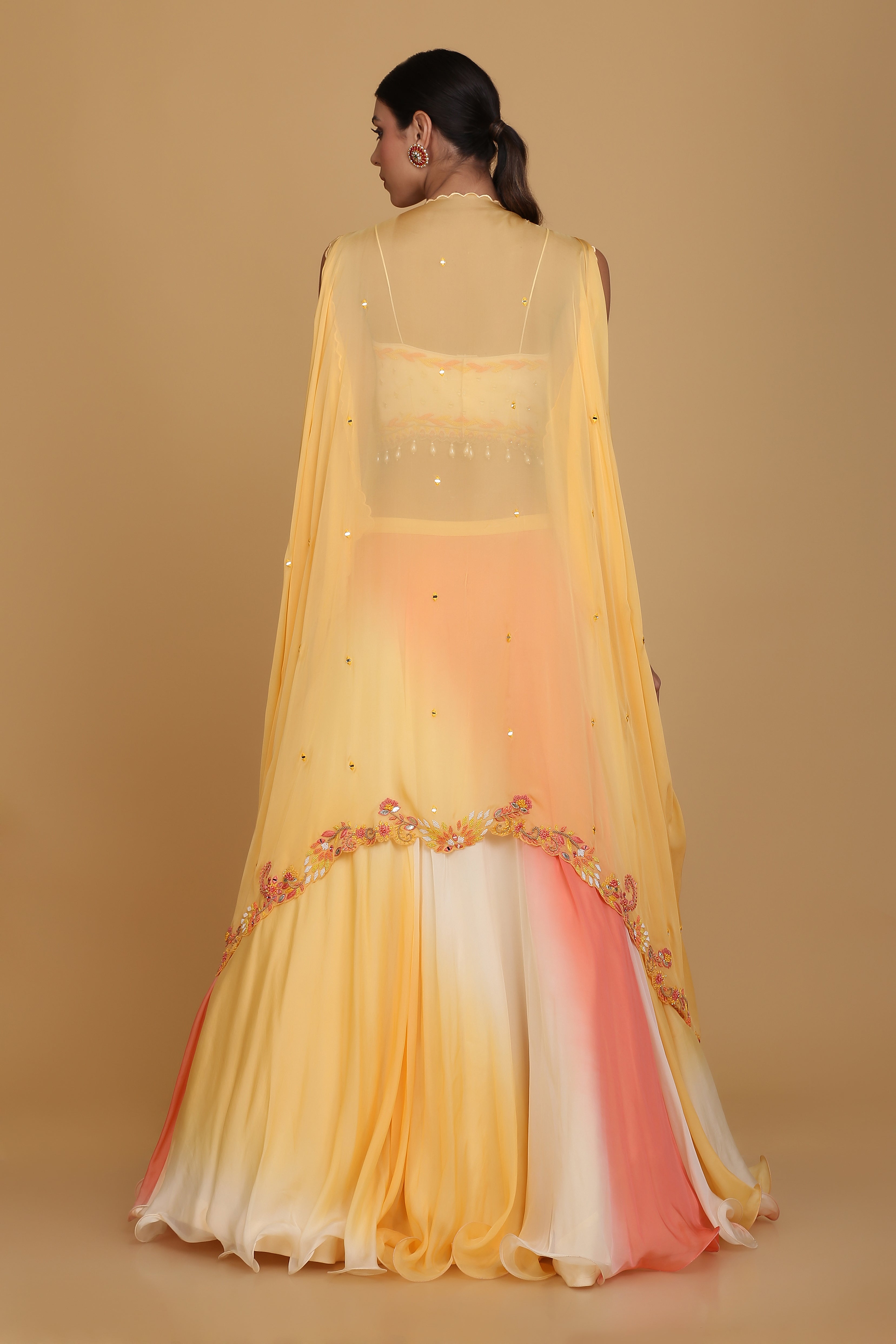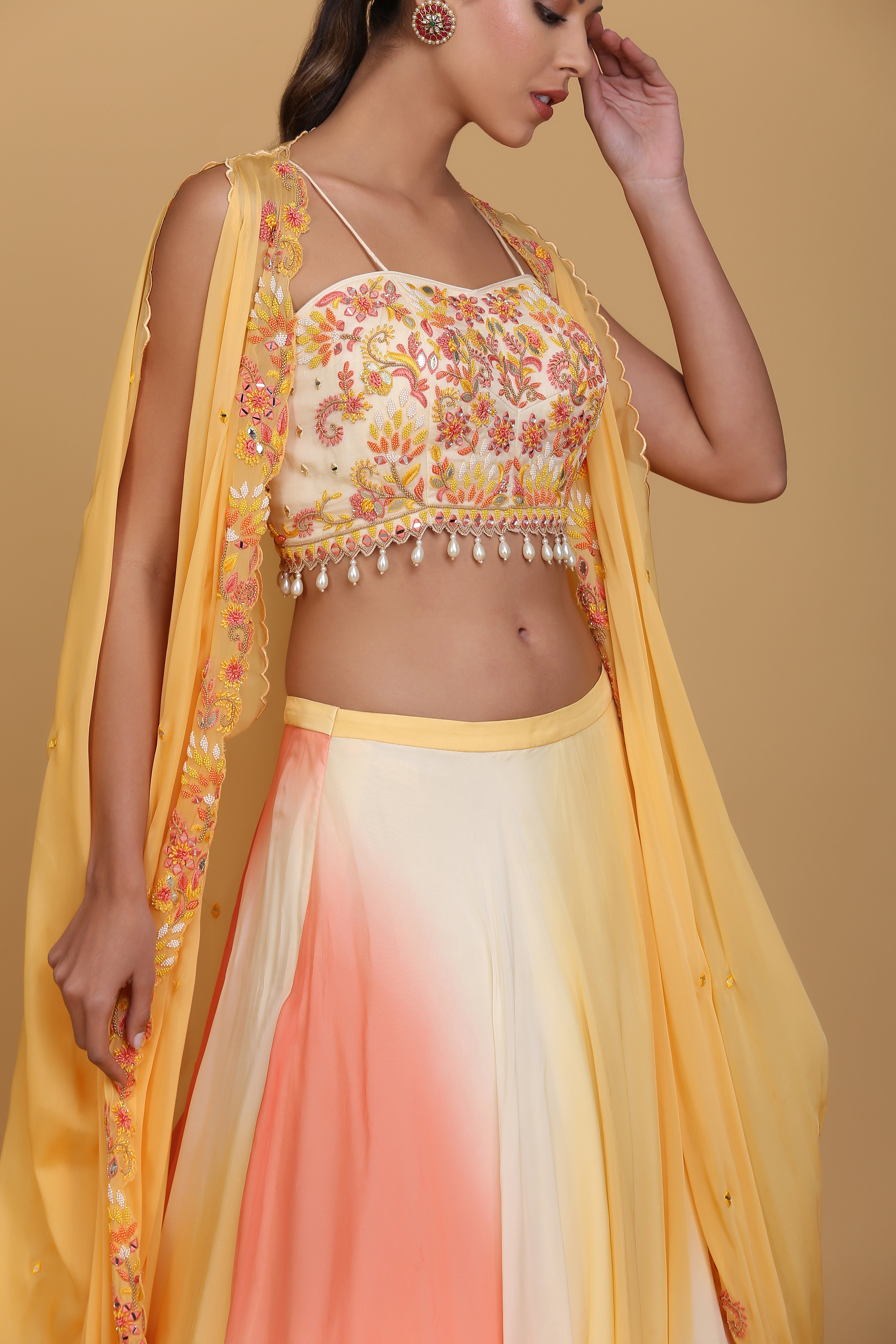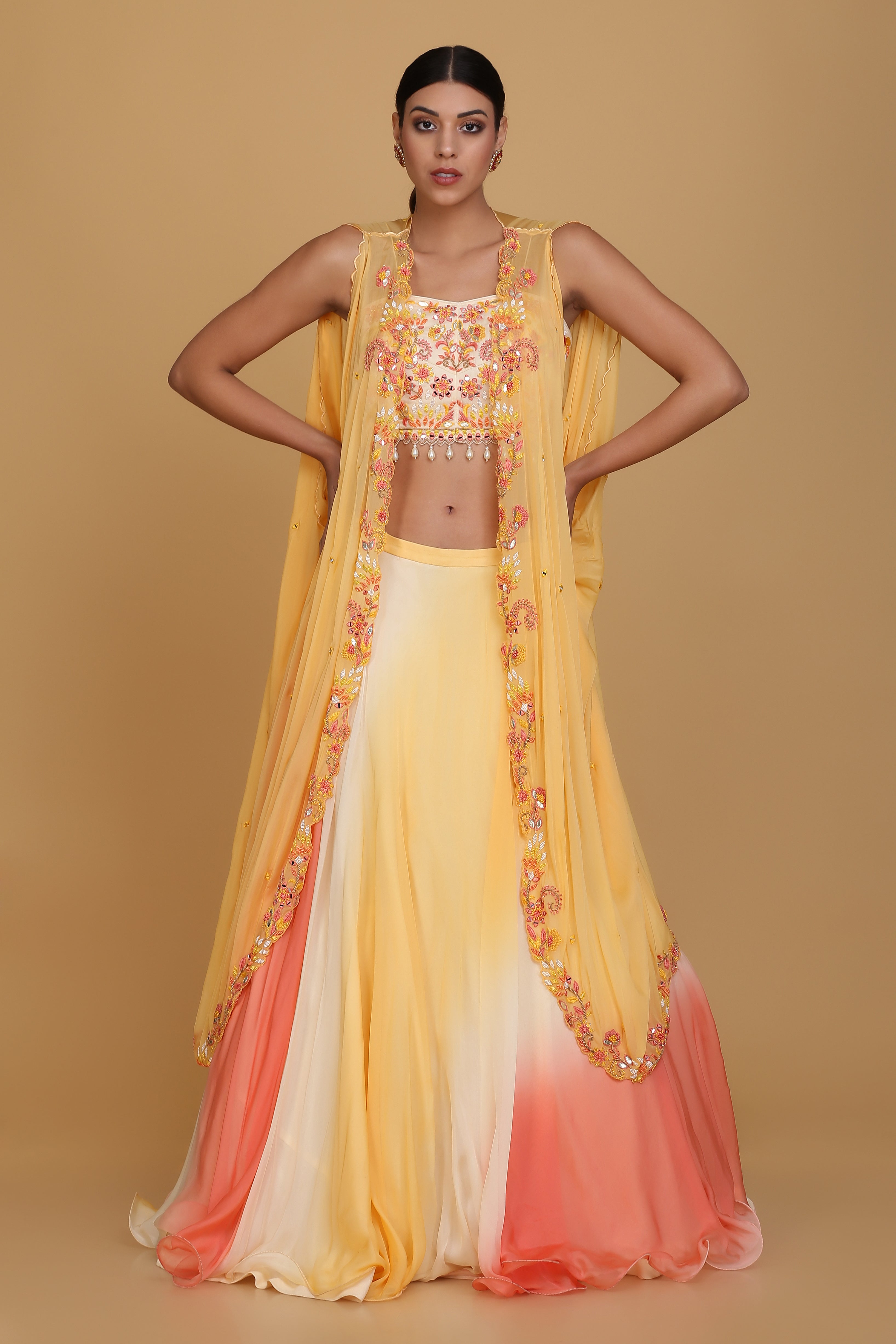 Featuring an amber yellow cape set in viscose silk embellished using threads, beads and mirror work. This cape is complemented with an embroidered blouse highlighted with pearl tassels and multi coloured skirt. This is a three piece set featuring jacket, blouse and skirt.