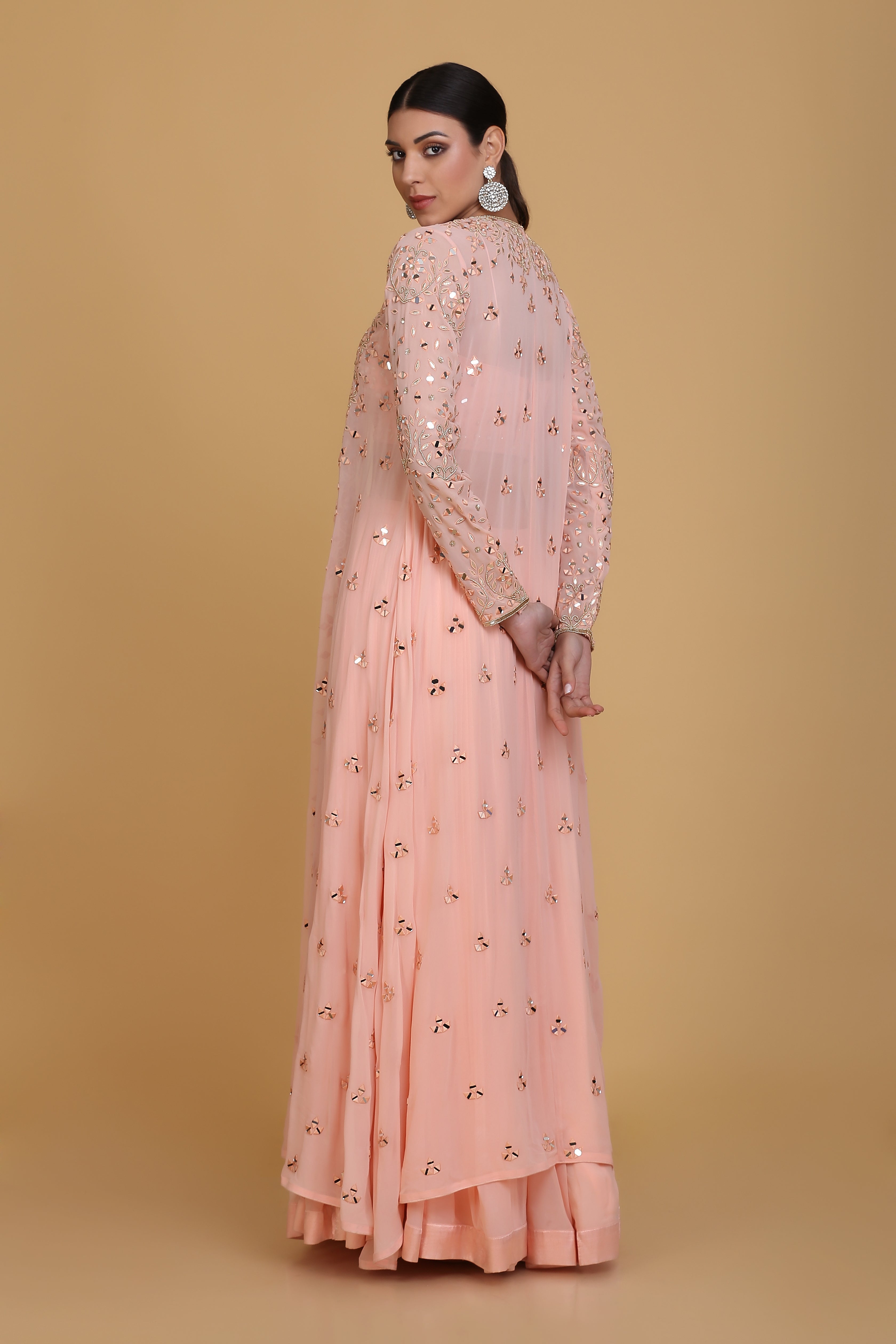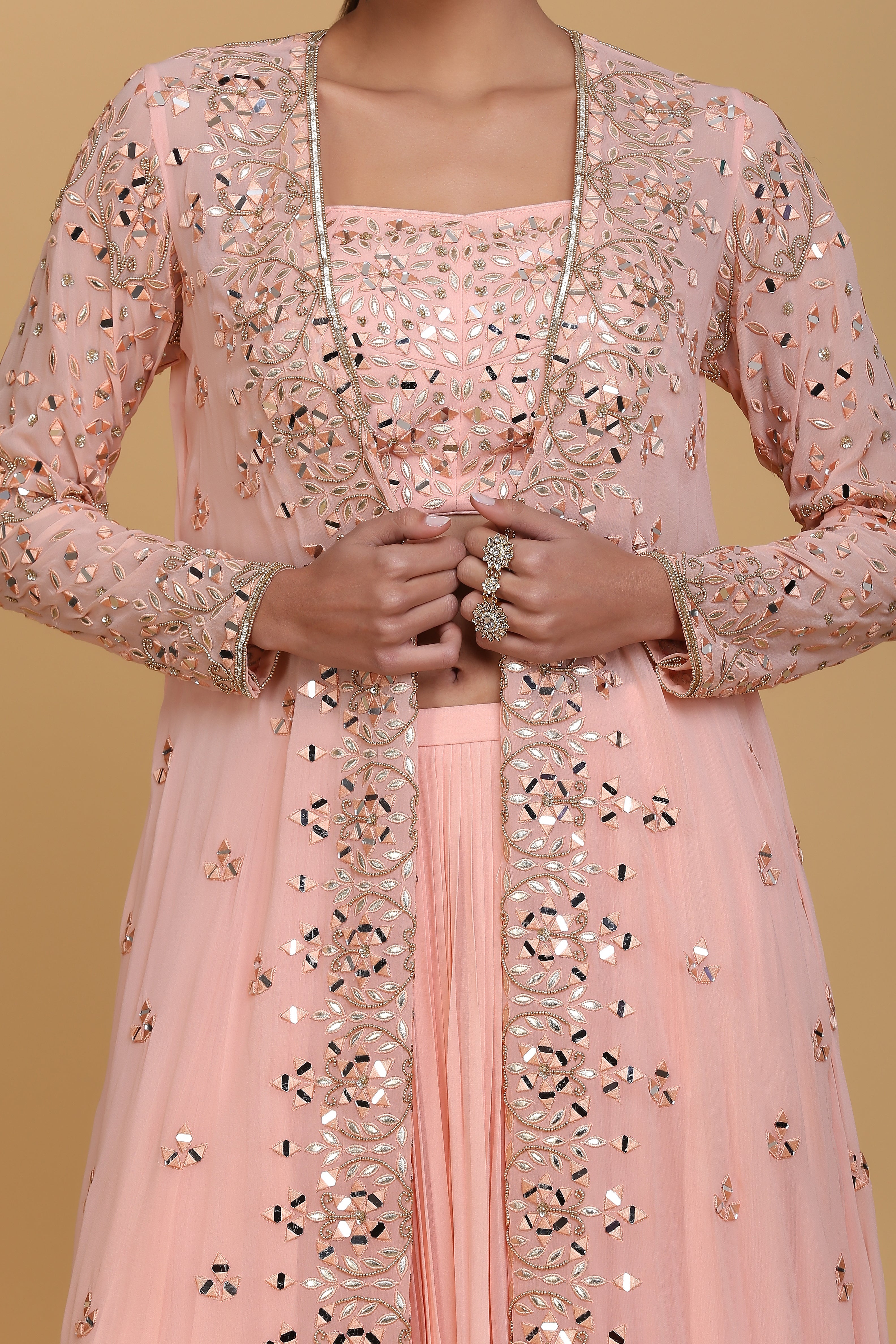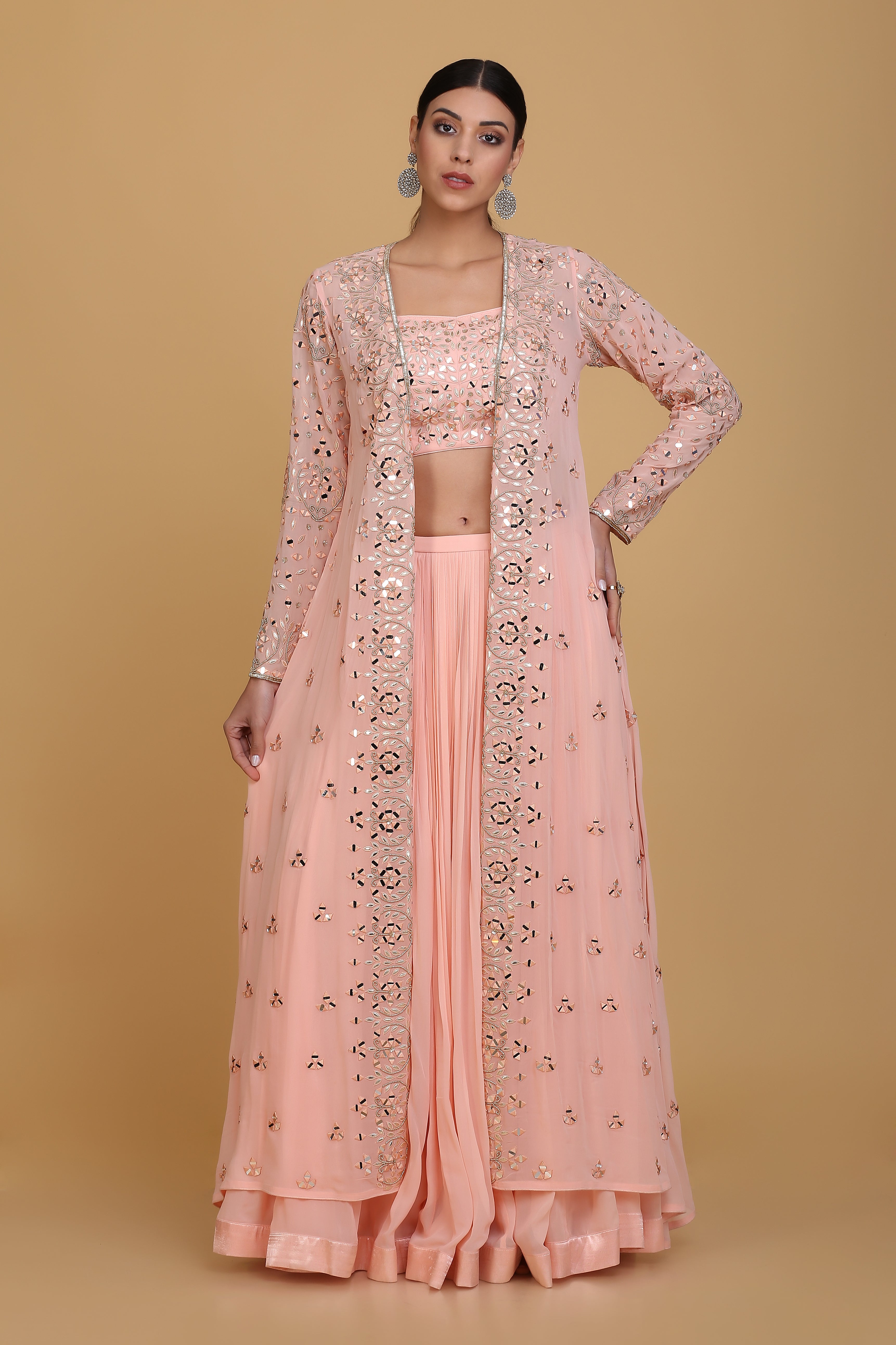 Featuring a balloon peach jacket set in georgette fabric embellished using mirror work, laser cut rexine and beads. This jacket set is complemented with an embroidered blouse and a pleated skirt. This is a three piece set including jacket, blouse and skirt.