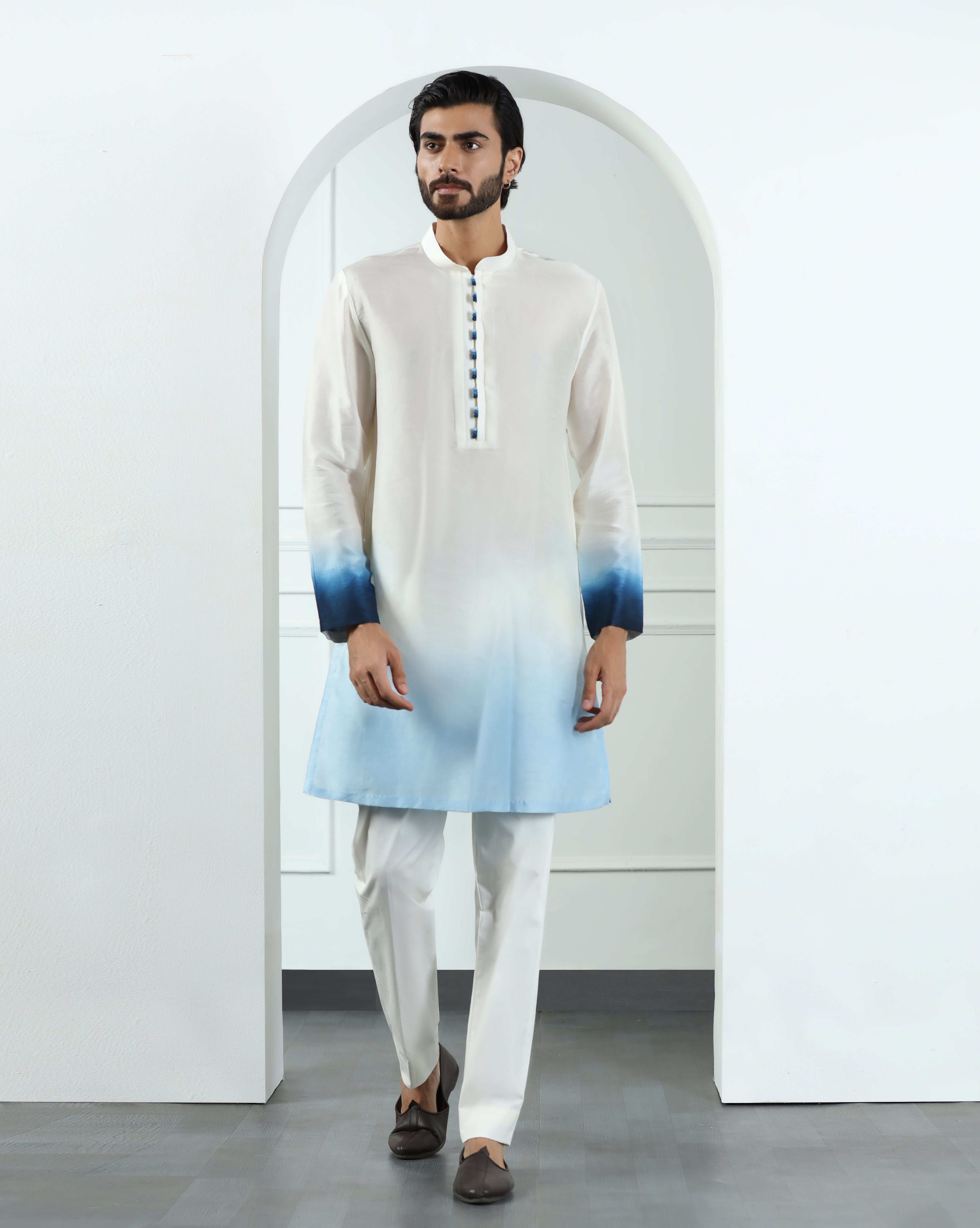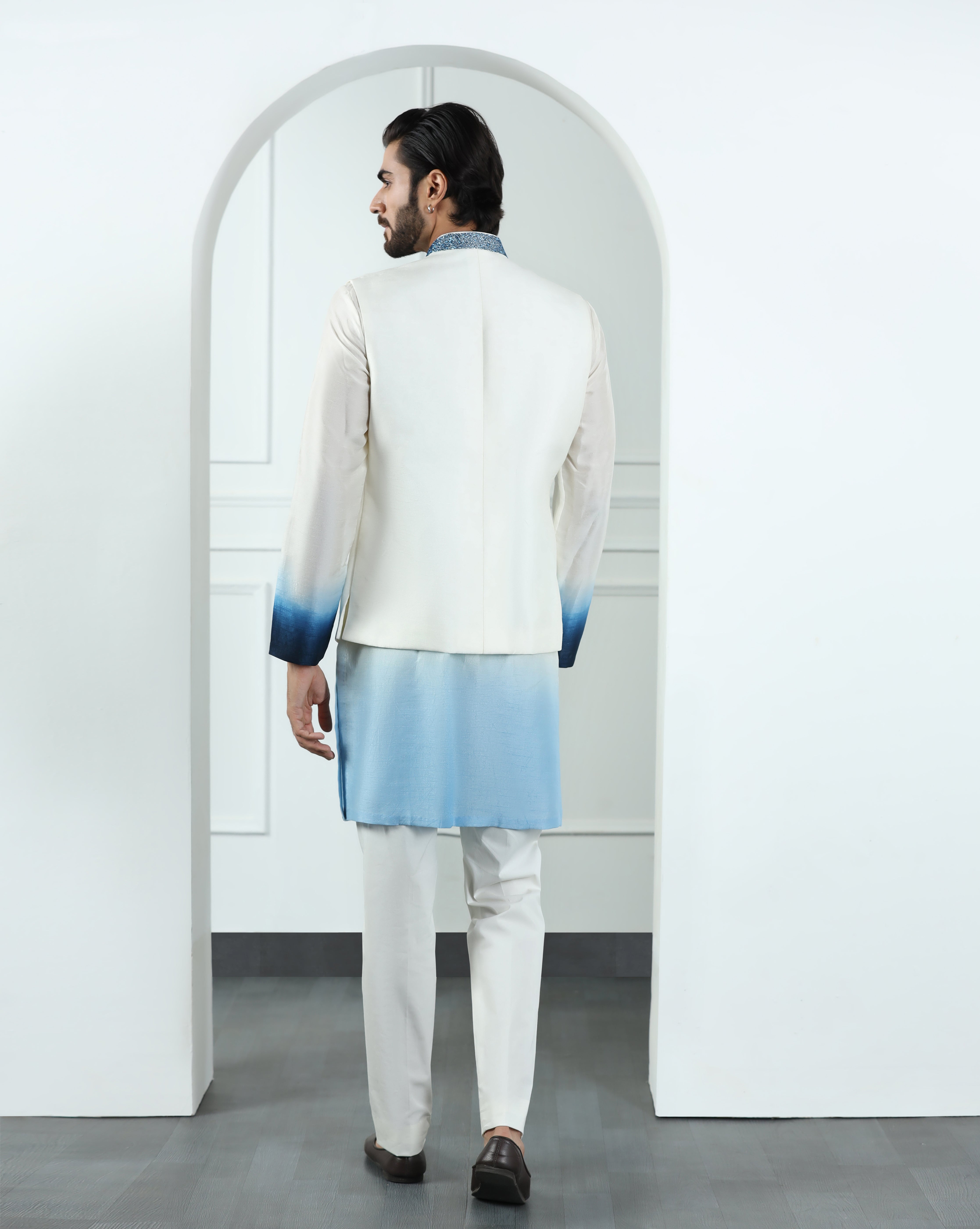 Featuring an ivory nehru jacket in viscose silk embellished using multicolour thread work and sequins. This jacket is paired with an ombré dyed kurta in viscose silk. This is a three piece set featuring jacket, kurta and trouser.