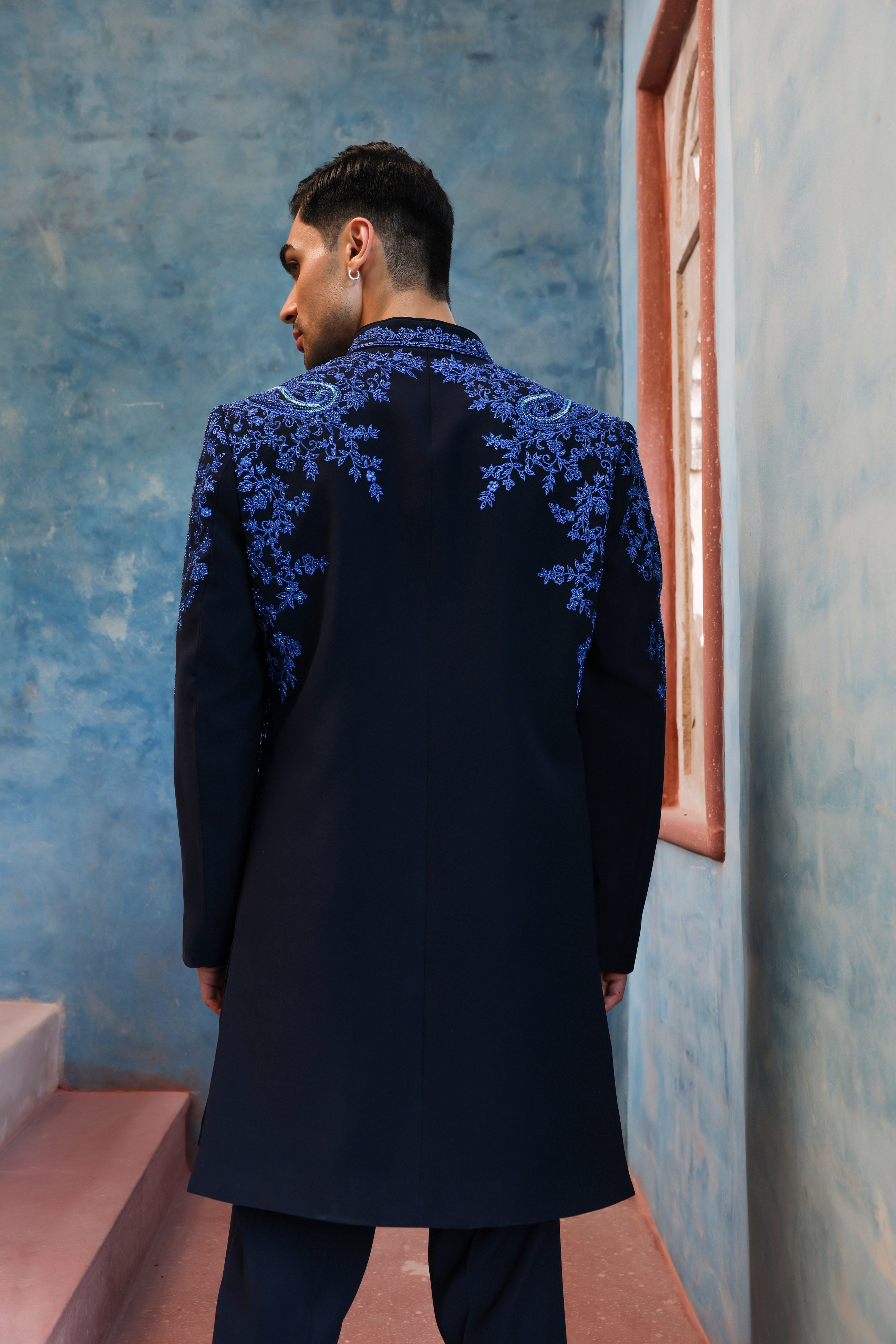 Featuring a midnight blue open indowestern in imported crepe embellished using thread and dori work. This indowestern is paired with an embroidered kurta. This is a three piece set featuring open indowestern, kurta and trouser.