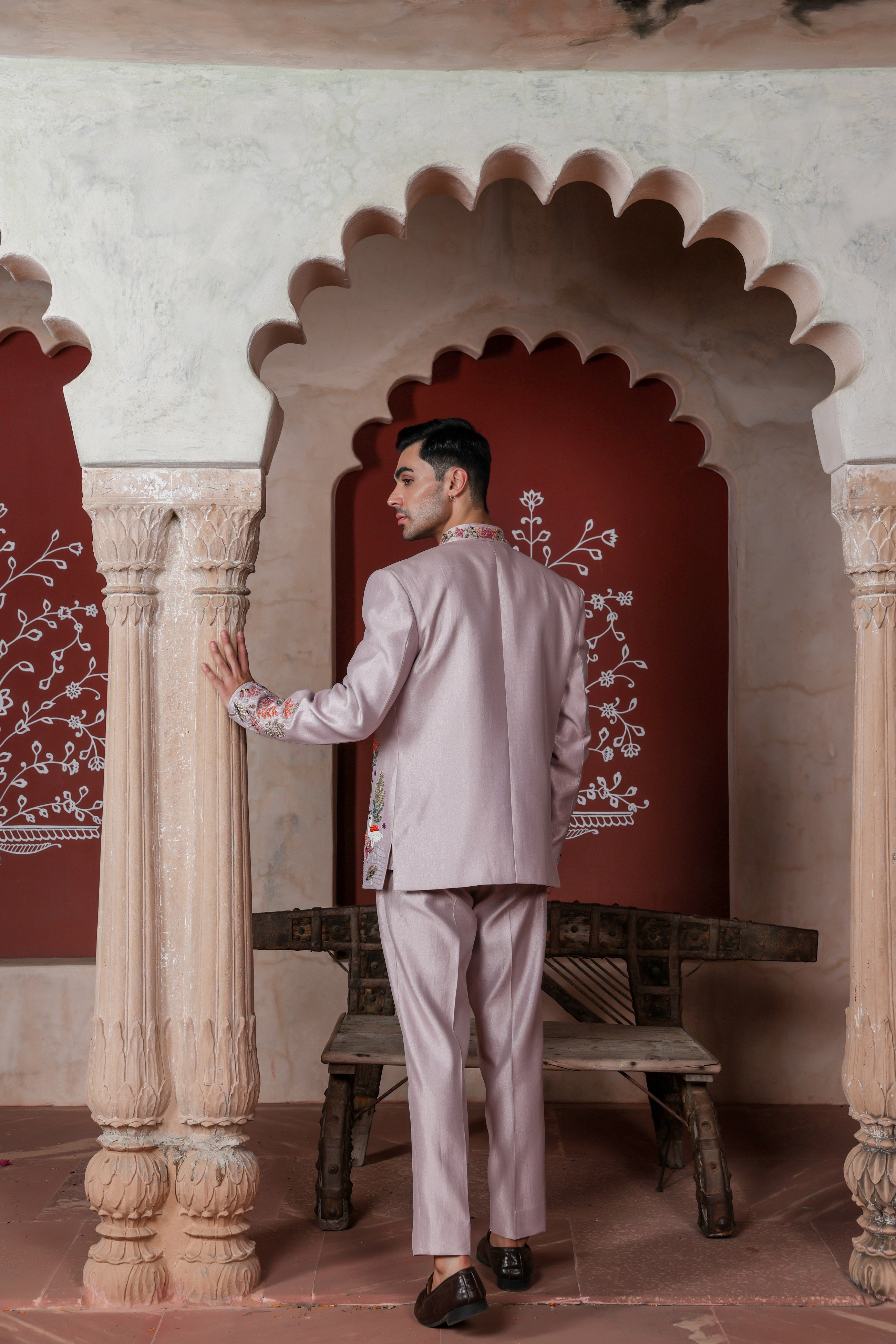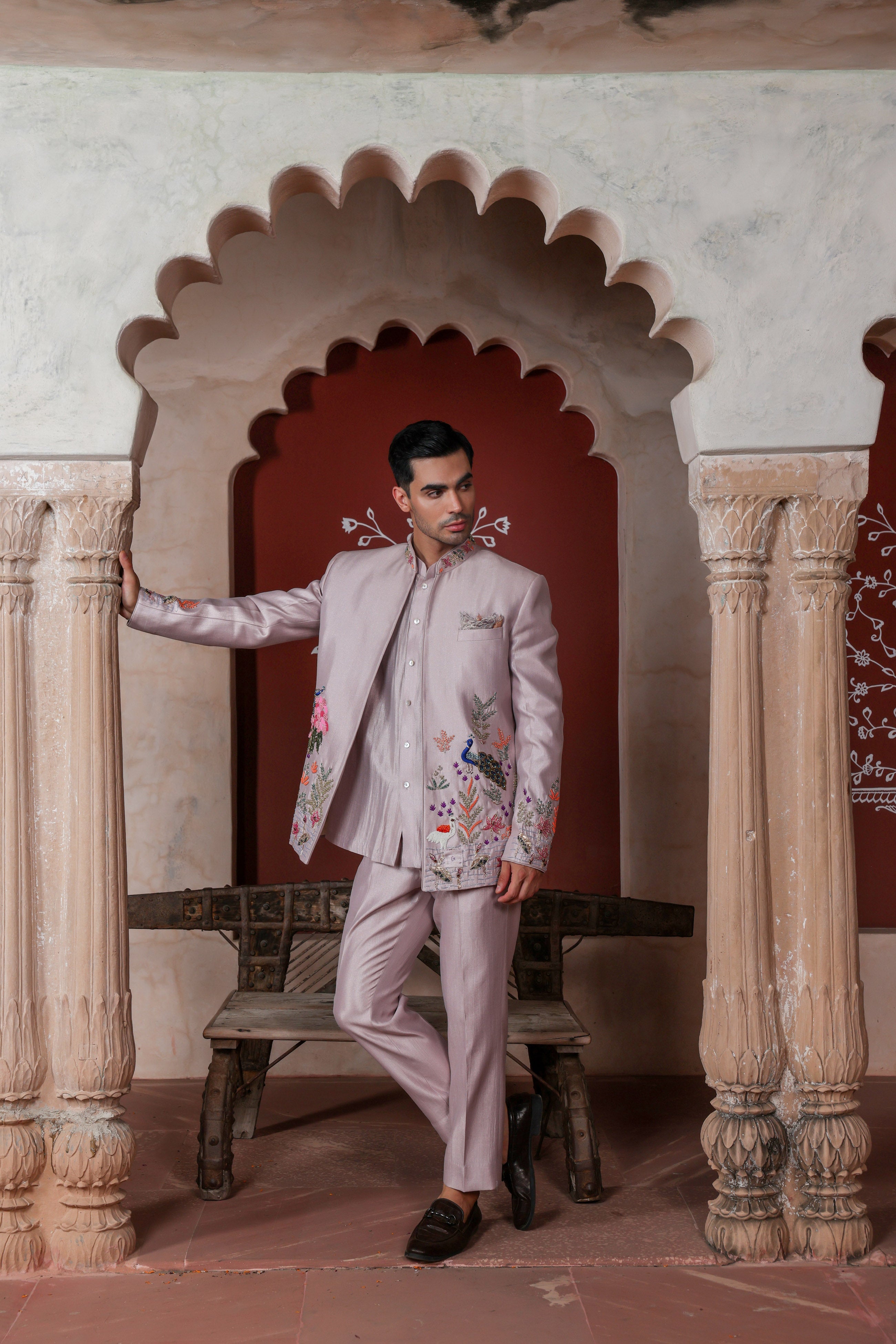 Featuring a soft purple open indowestern in shimmer silk embellished using multicolour thread and beads. This indowestern is paired with a front open kurta. This is a three piece set featuring open indowestern, kurta and trouser.