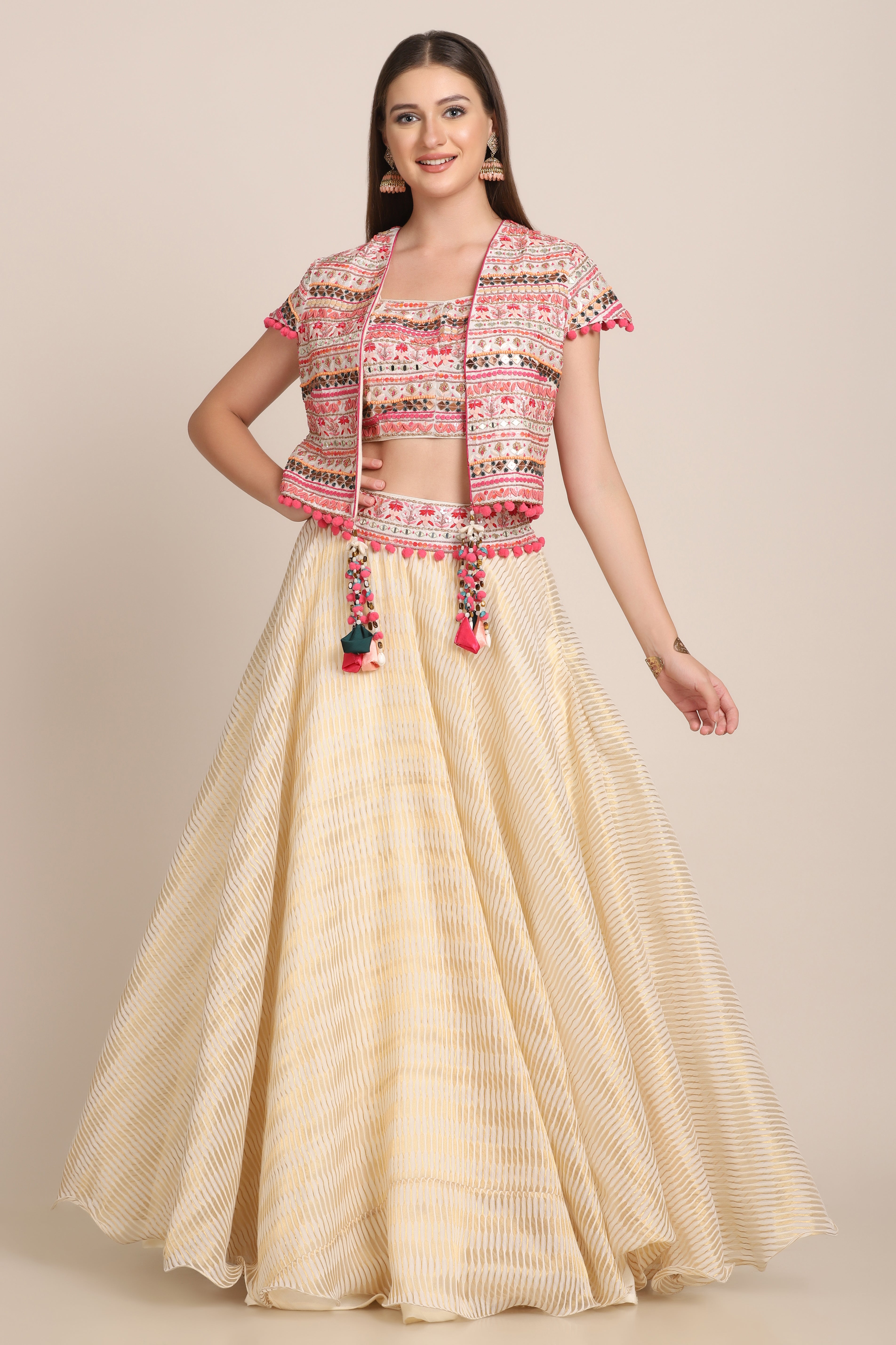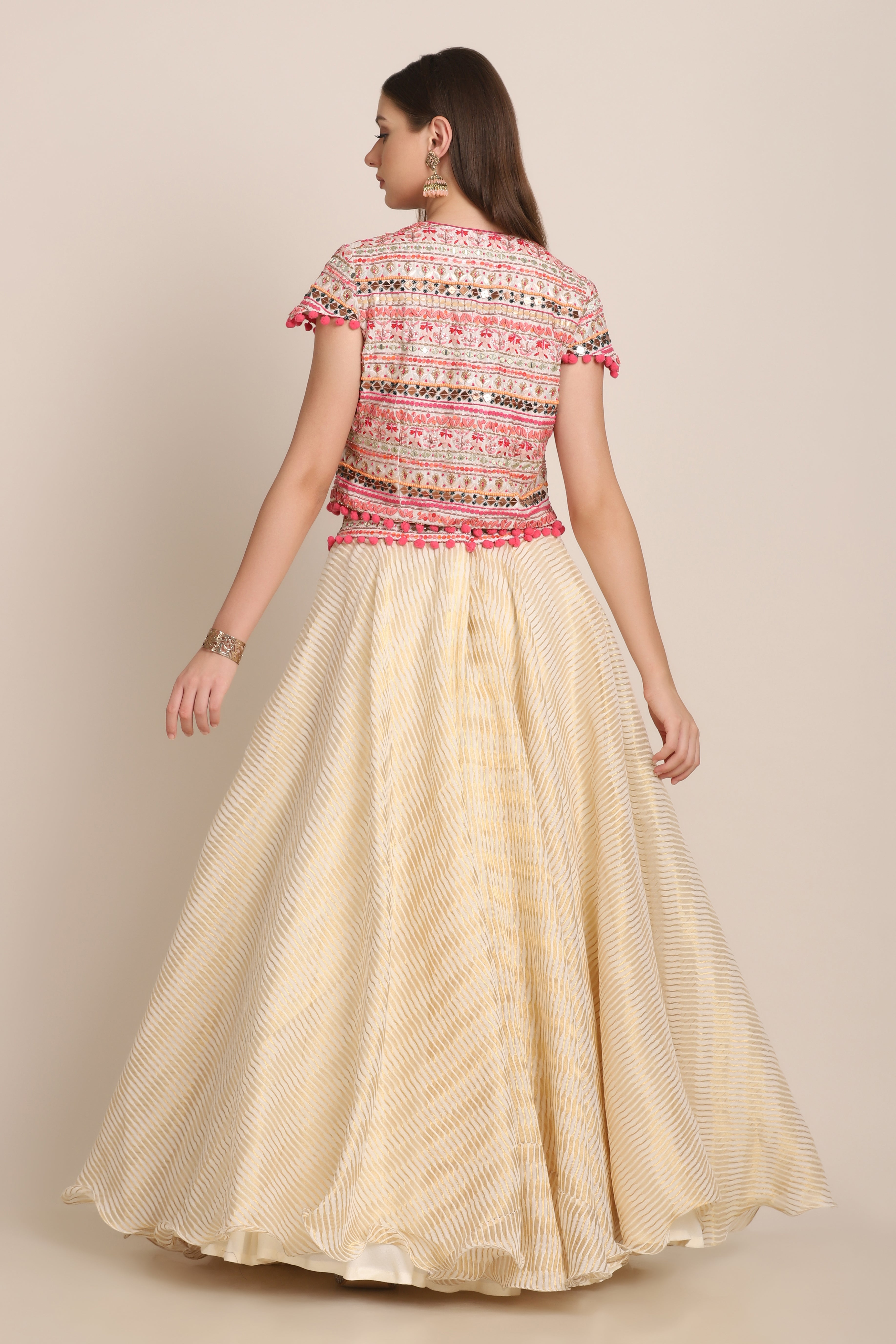 Featuring an ivory gold short shrug set in zari chanderi embellished using faux leather sequins and mirror cut pieces. This shrug is complemented with a textured lehenga in zari chanderi and an embroidered sleeveless blouse. This is a three piece set including shrug, blouse and lehenga skirt.