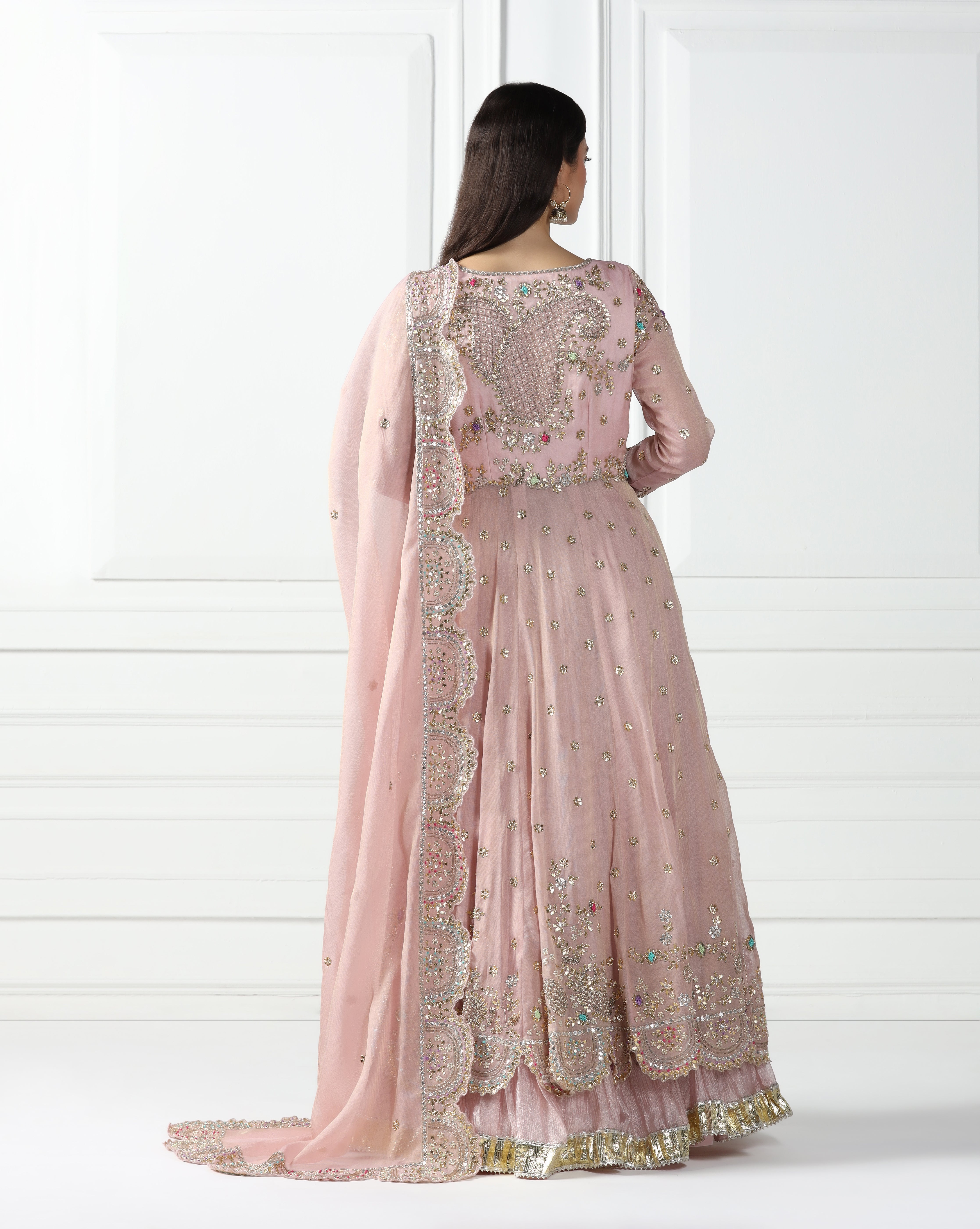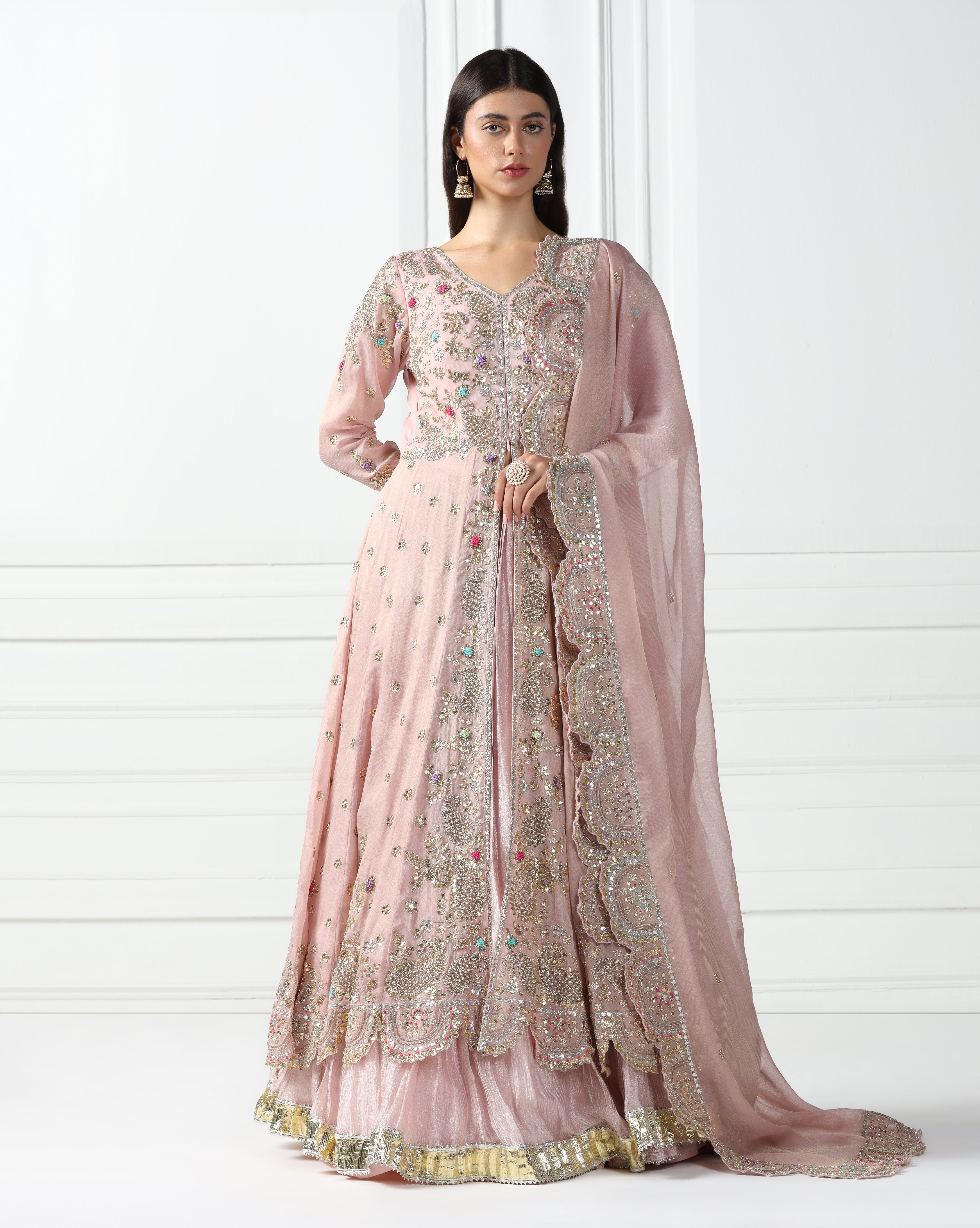 Featuring a misty pink lehenga in crushed tissue. This lehenga is complimented with an embellished jacket in tissue net embroidered using multicoloured threads and gota patti. This outfit also features an embroidered dupatta with scallop cutwork in tissue net. This is a three piece outfit including lehenga, jacket and dupatta.