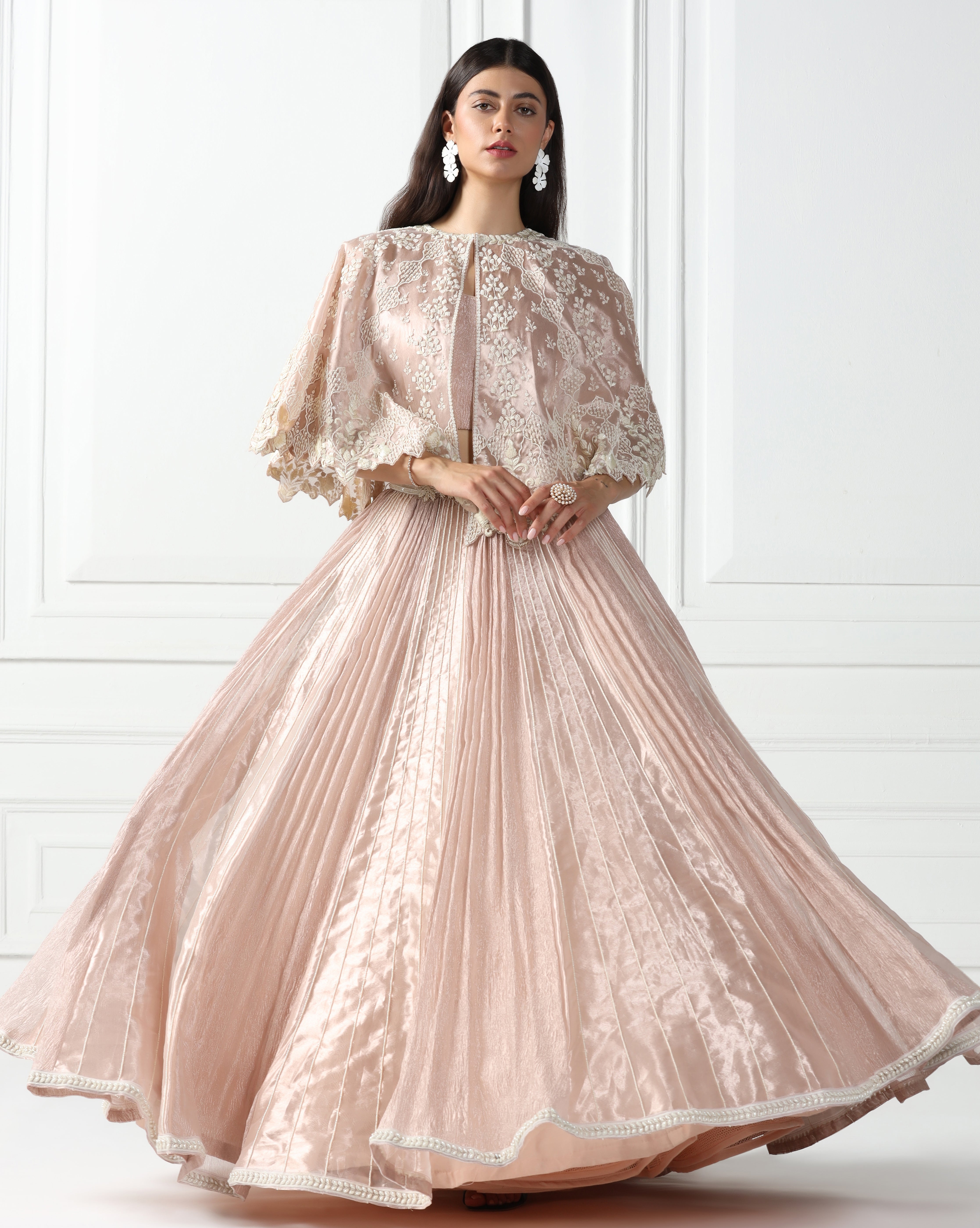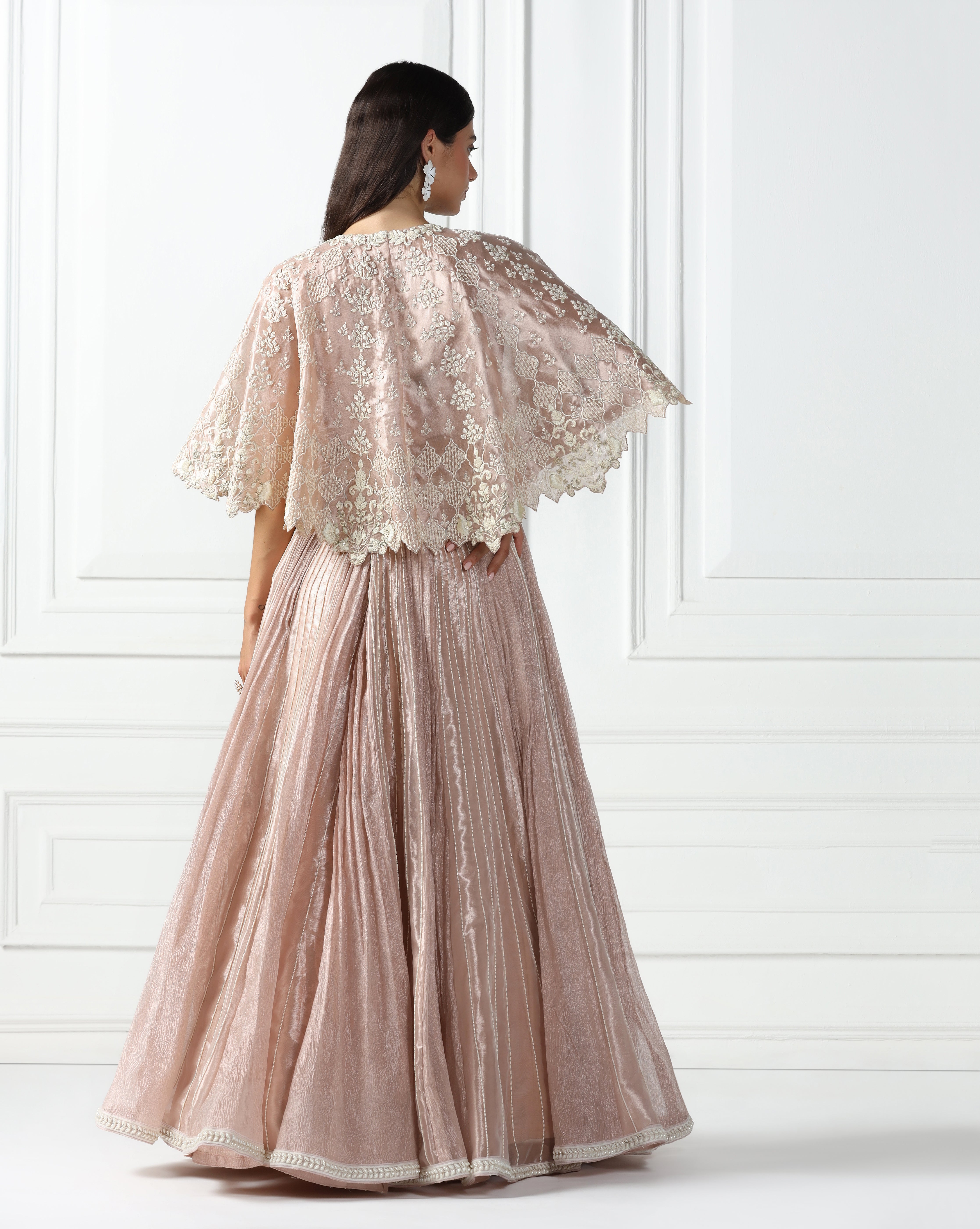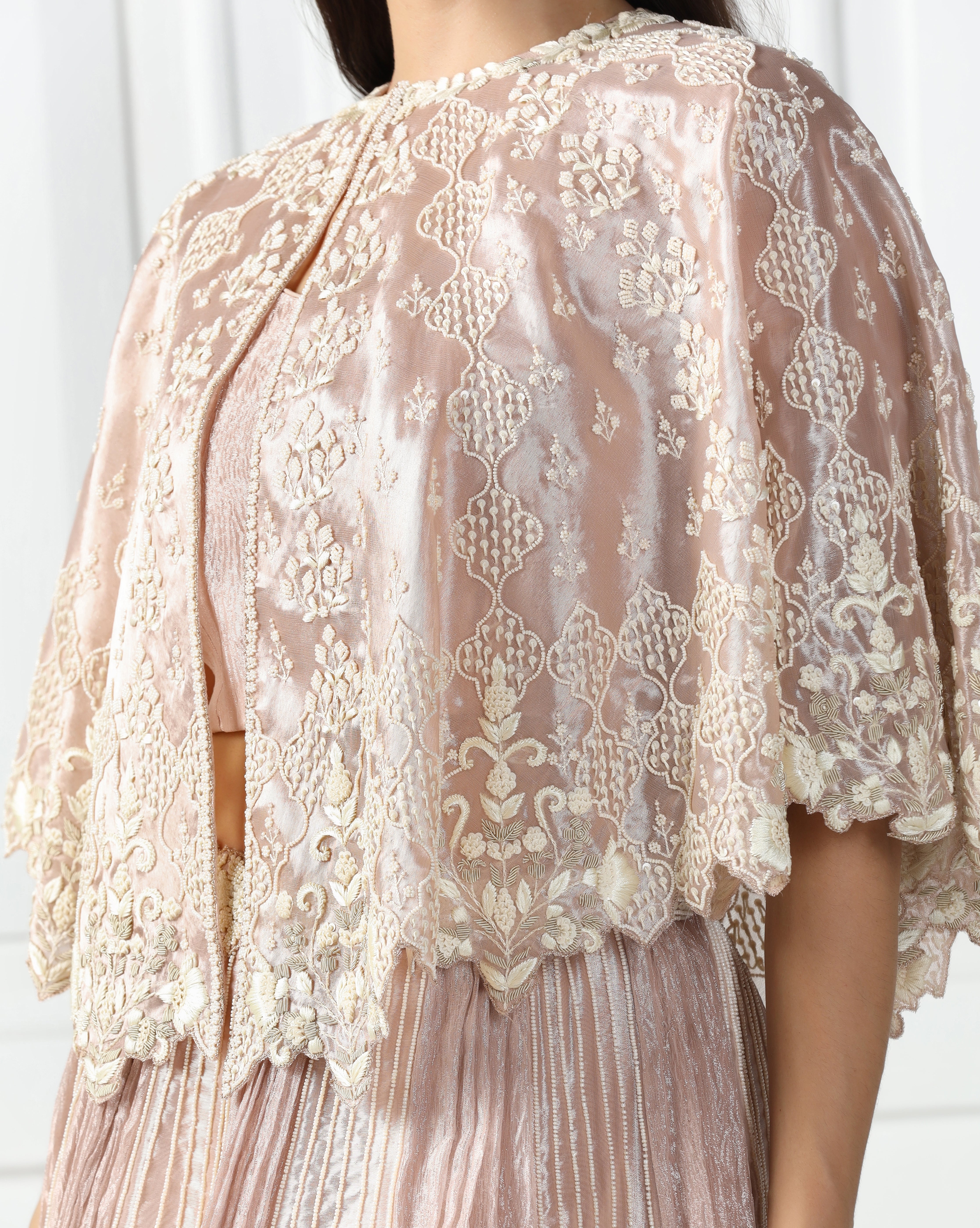 Featuring a rose gold cape in tissue fabric embellished using thread, sequin and beads. This cape is complemented with a lehenga engineered using a combination of crushed tissue and tissue fabric. The lehenga is highlighted by pearl embroidery. This outfit also features a sleeveless blouse in crushed tissue. This is a three piece set featuring cape, blouse and lehenga.