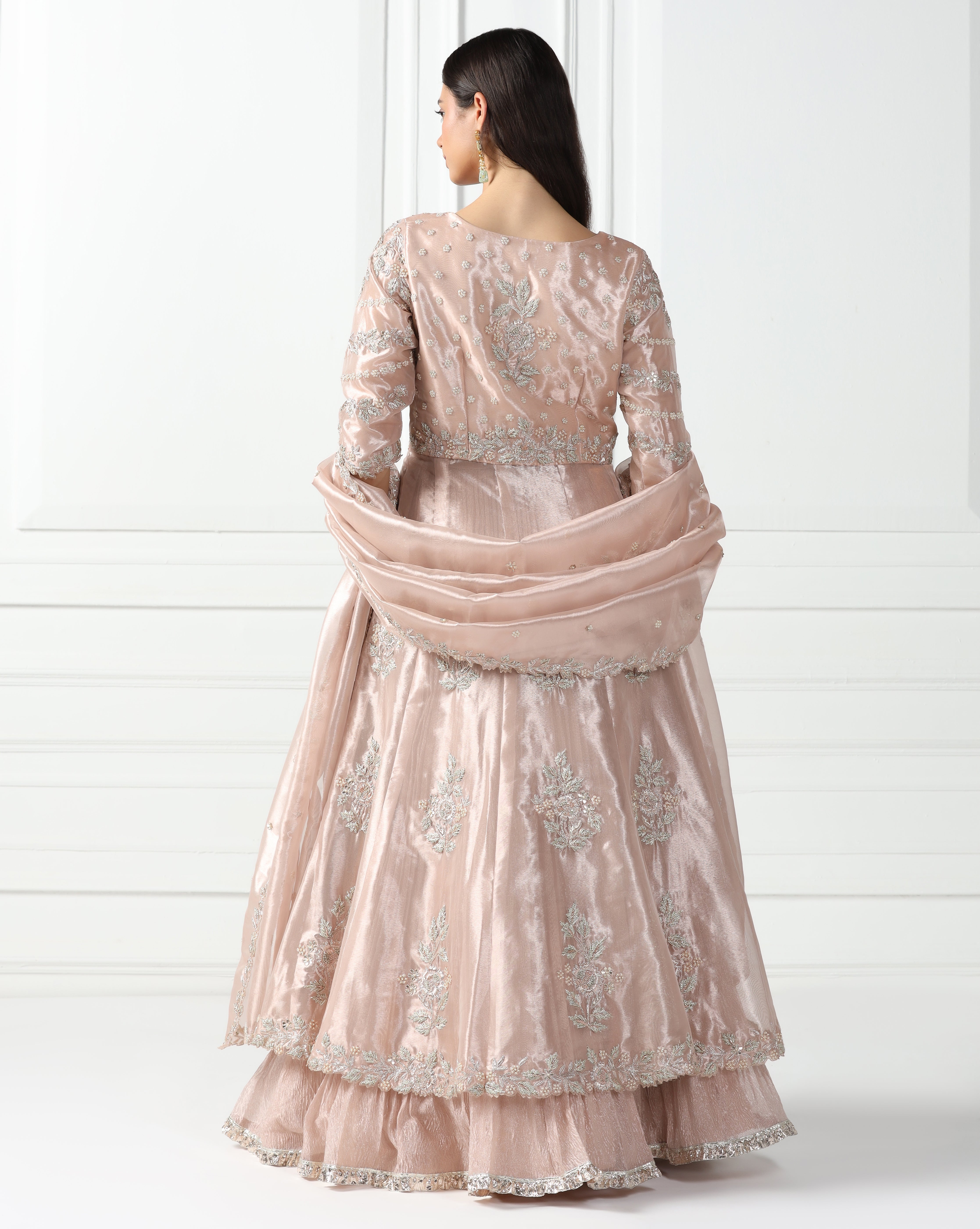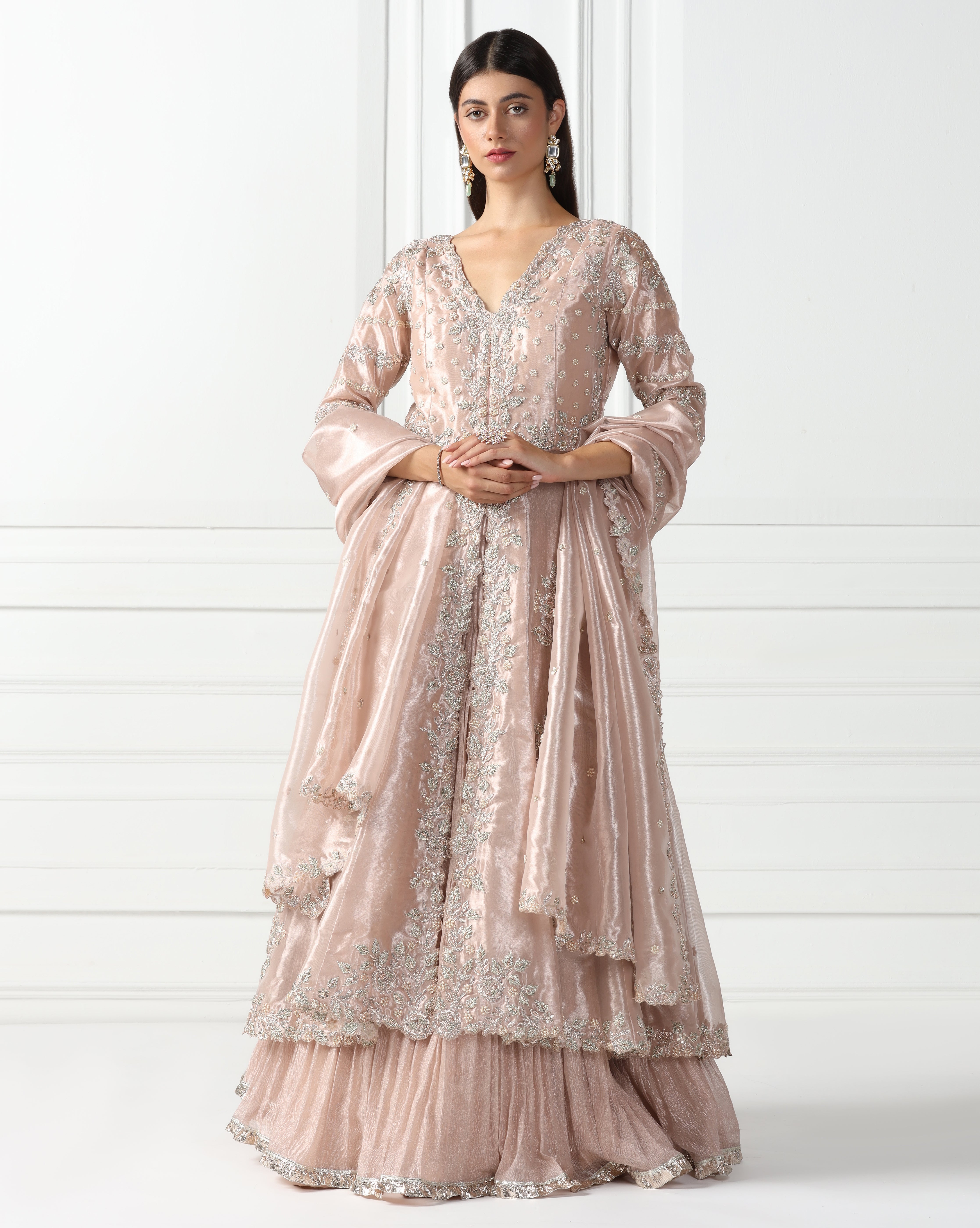 Featuring a rose gold lehenga in crushed tissue. This lehenga is complimented with an embellished kalidar jacket in tissue fabric embroidered using french wire and pearls. This outfit also features a coordinated embroidered dupatta in tissue fabric. This is a three piece outfit including lehenga, jacket and dupatta.