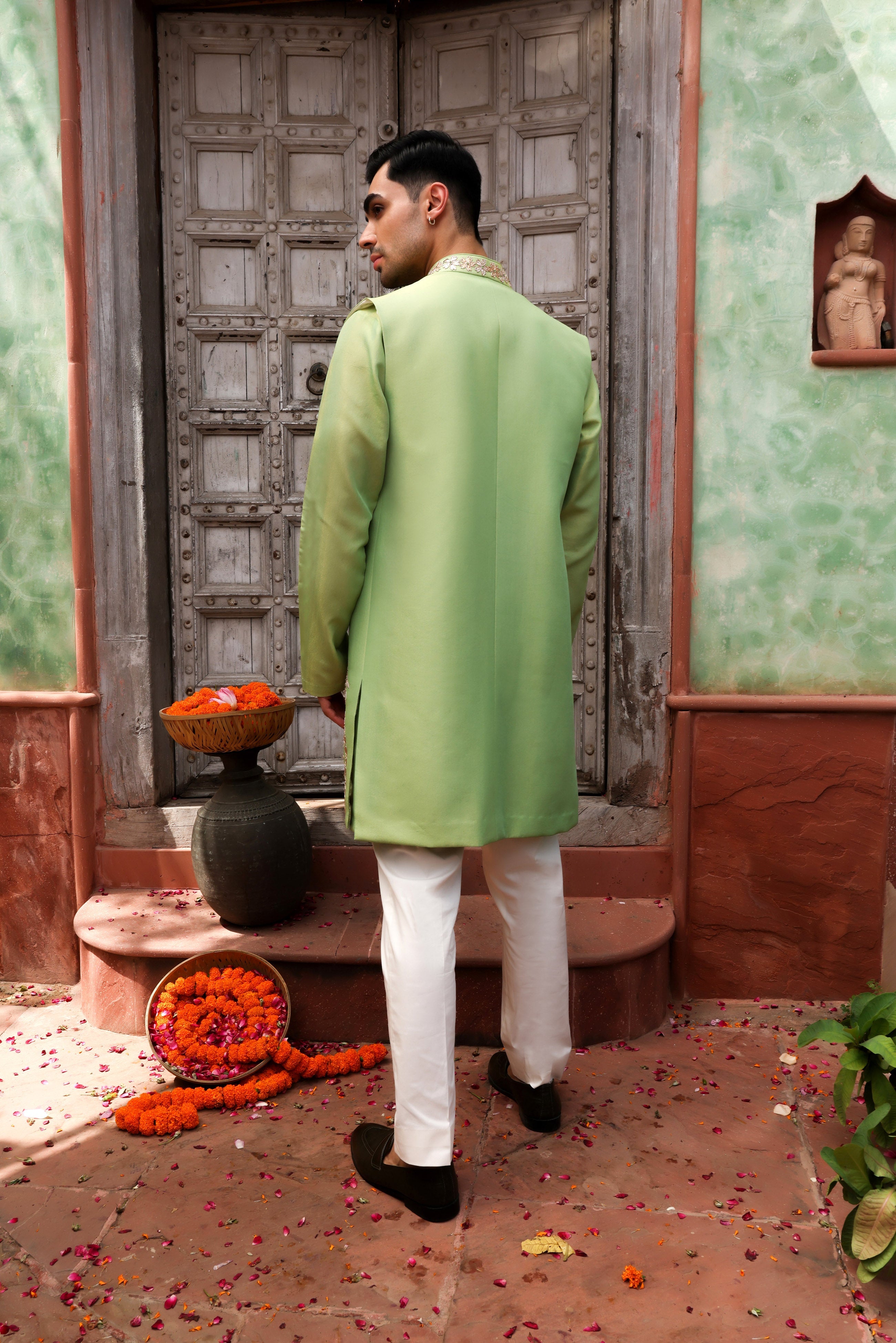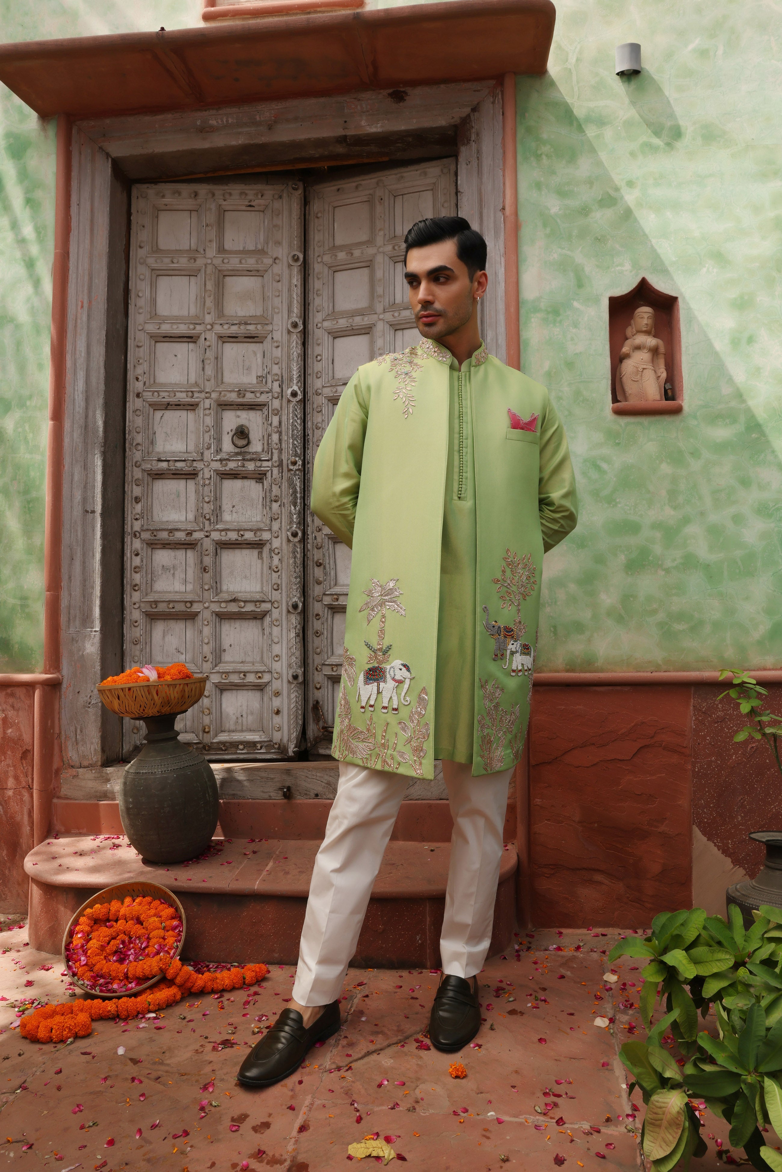 Featuring a spring green long jacket in tissue organza embellished using gota and beads. This jacket is enhanced using intricately embroidered elephant motifs and is paired with a half elastic trouser. This is a three piece set featuring jacket, kurta and trouser.