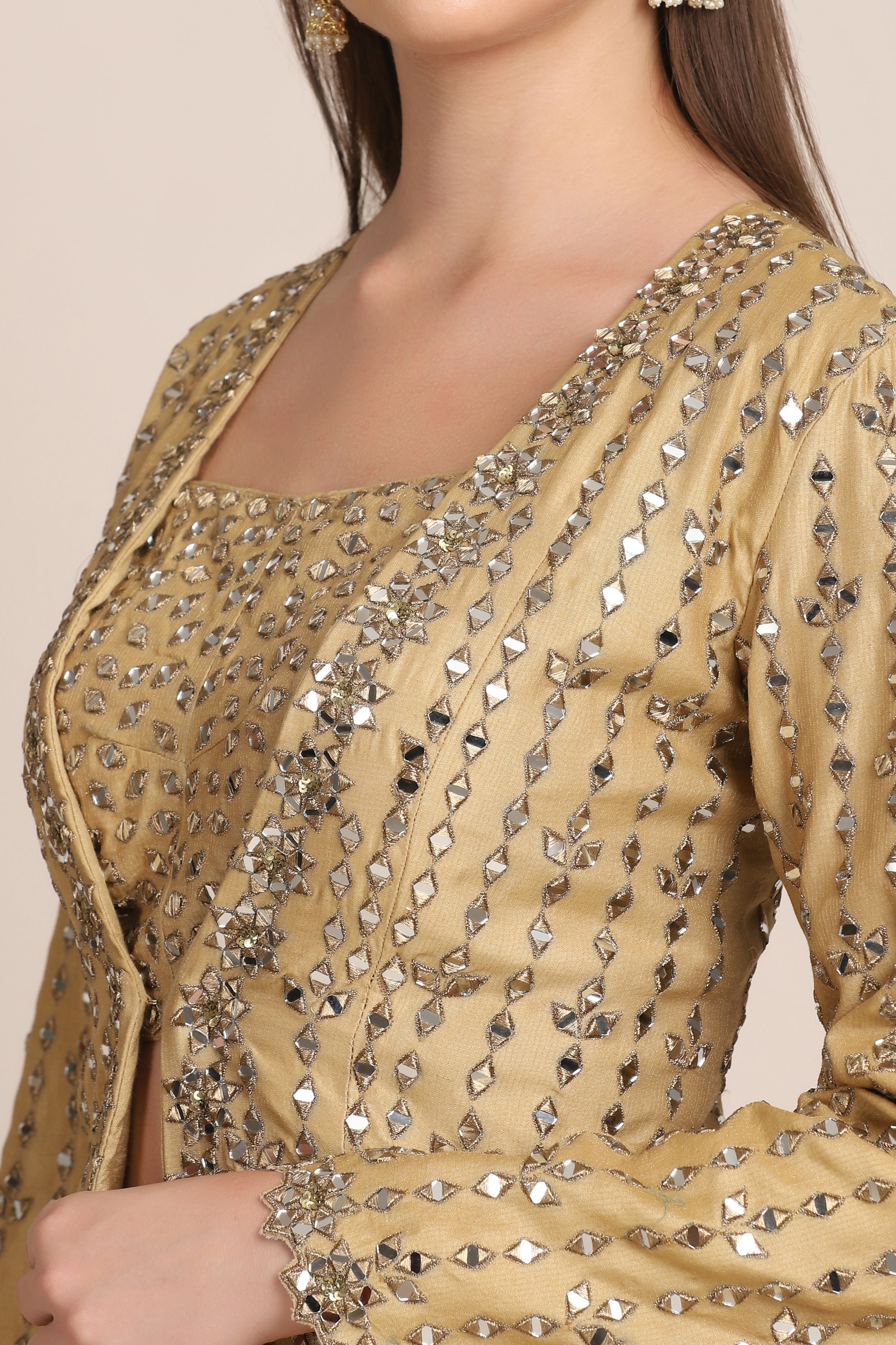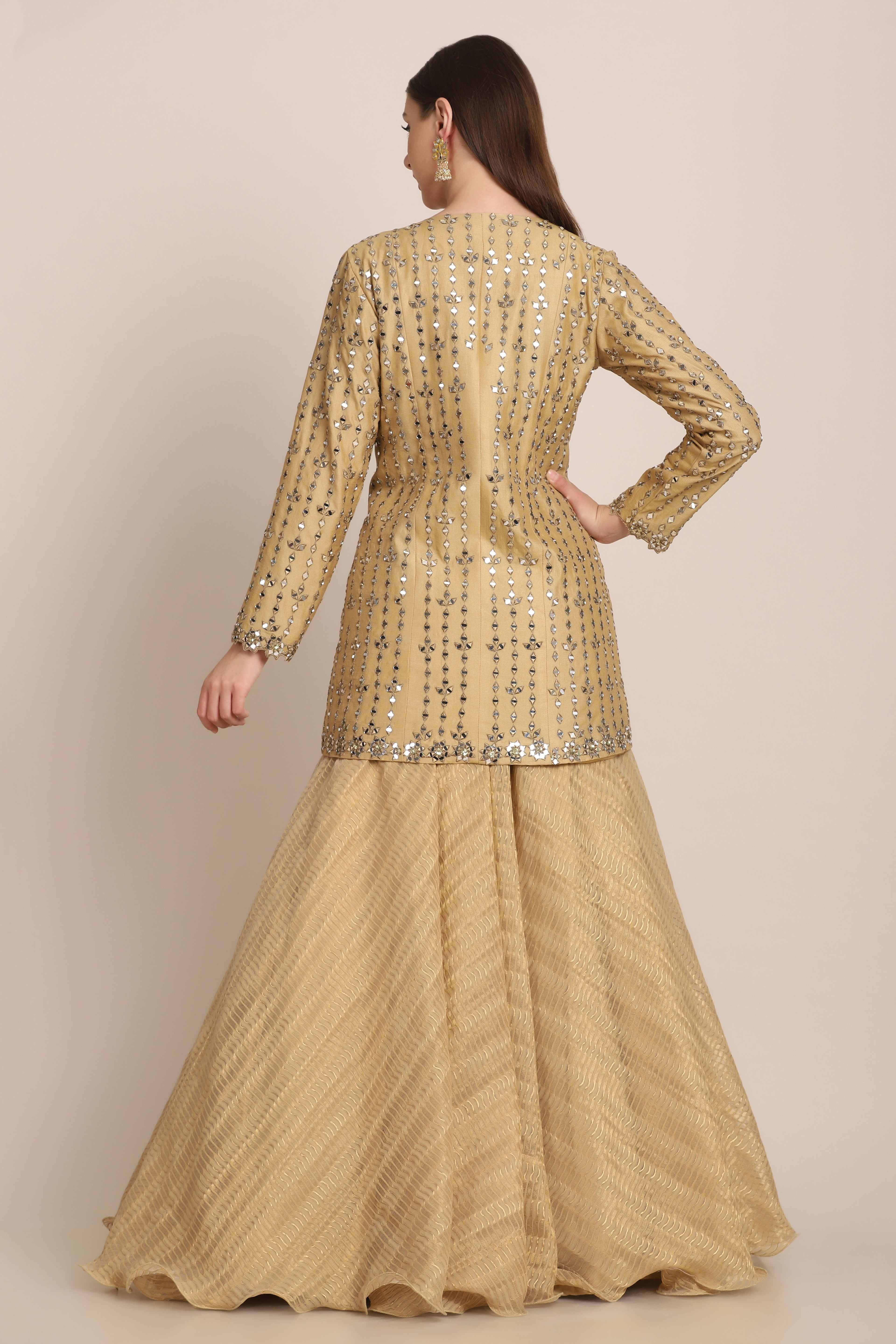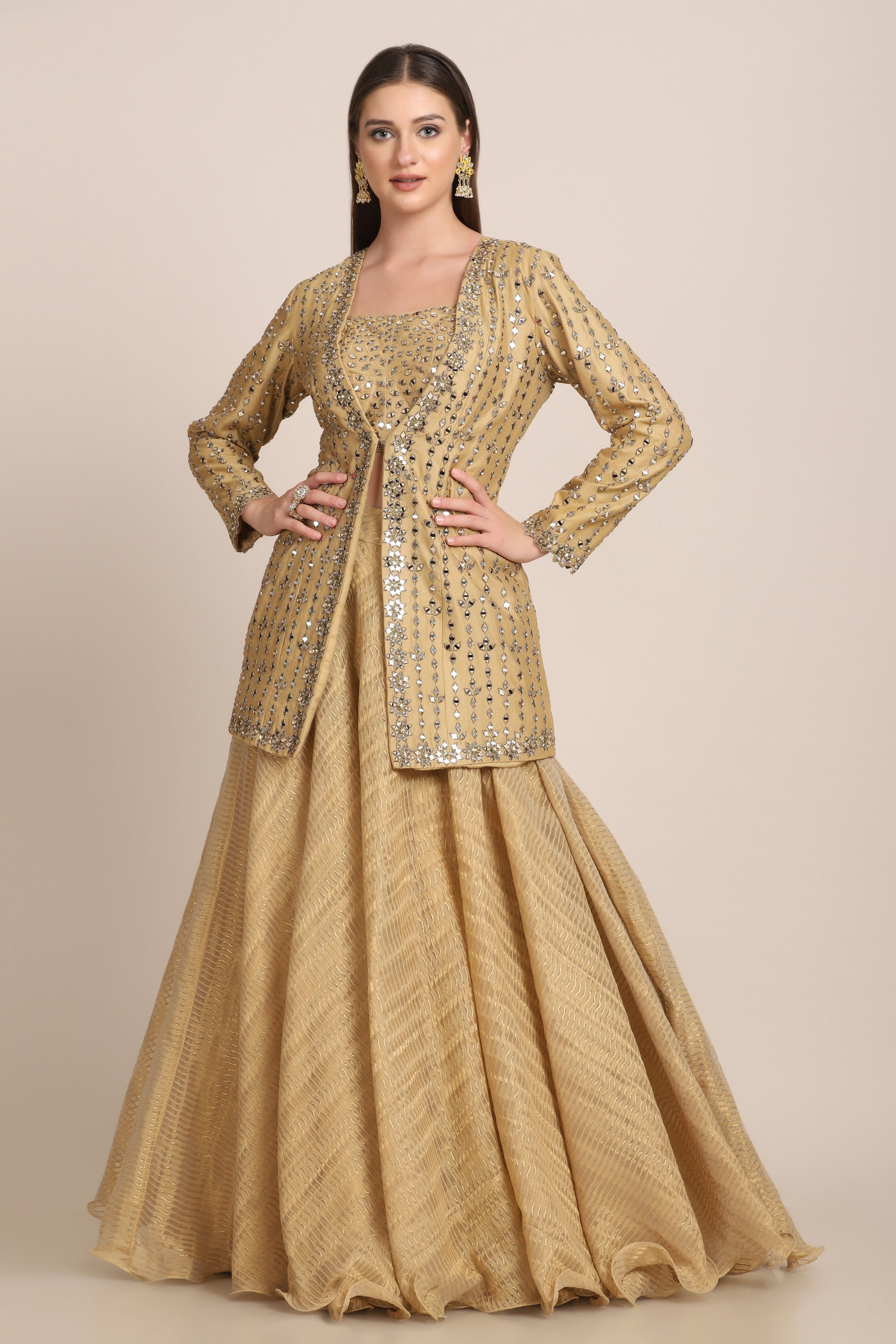 Featuring a honey gold jacket and lehenga in zari chanderi embroidered using mirror cut pieces. This lehenga is complimented with an embroidered noodle strap blouse. This is a three piece outfit including blouse, lehenga and jacket.