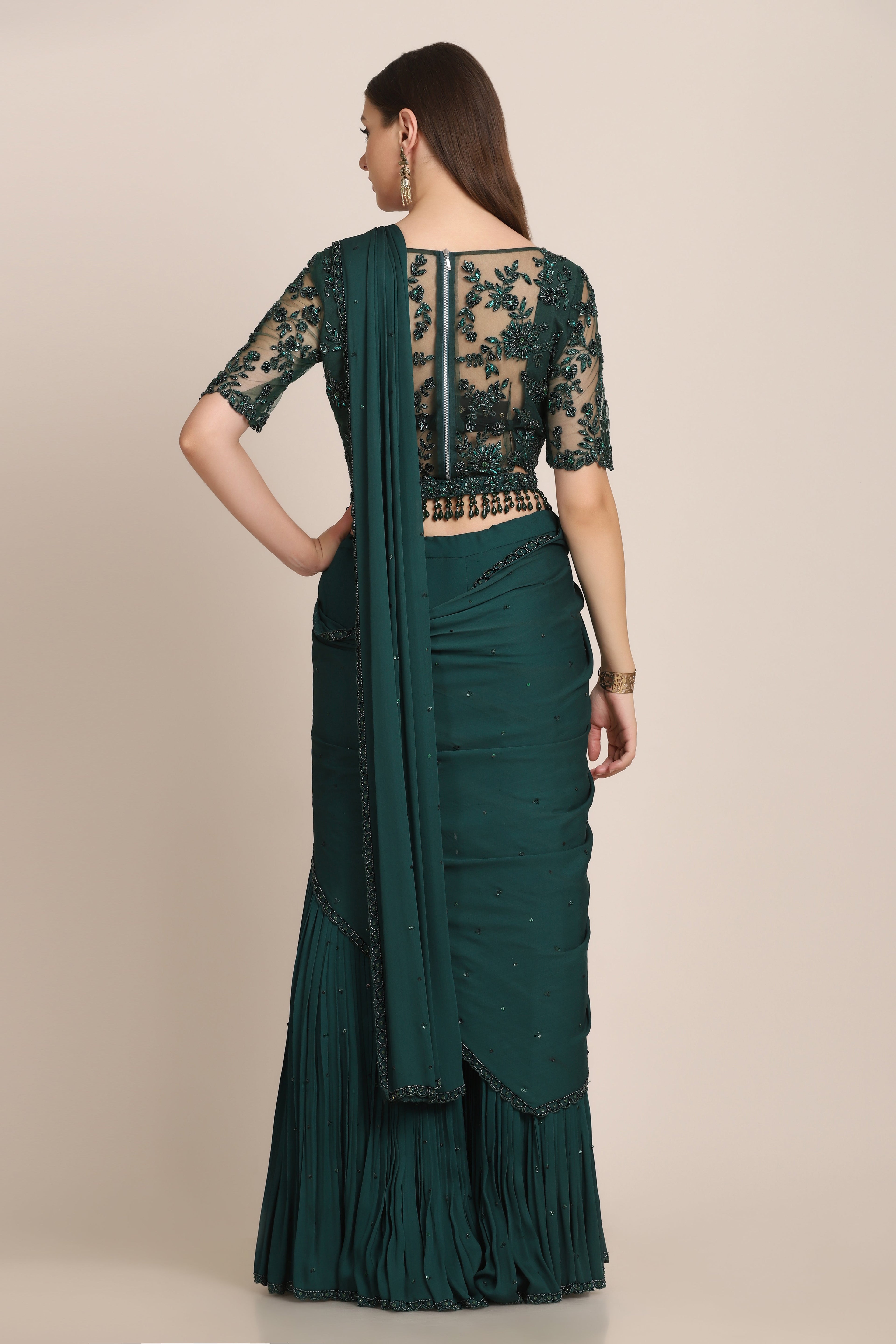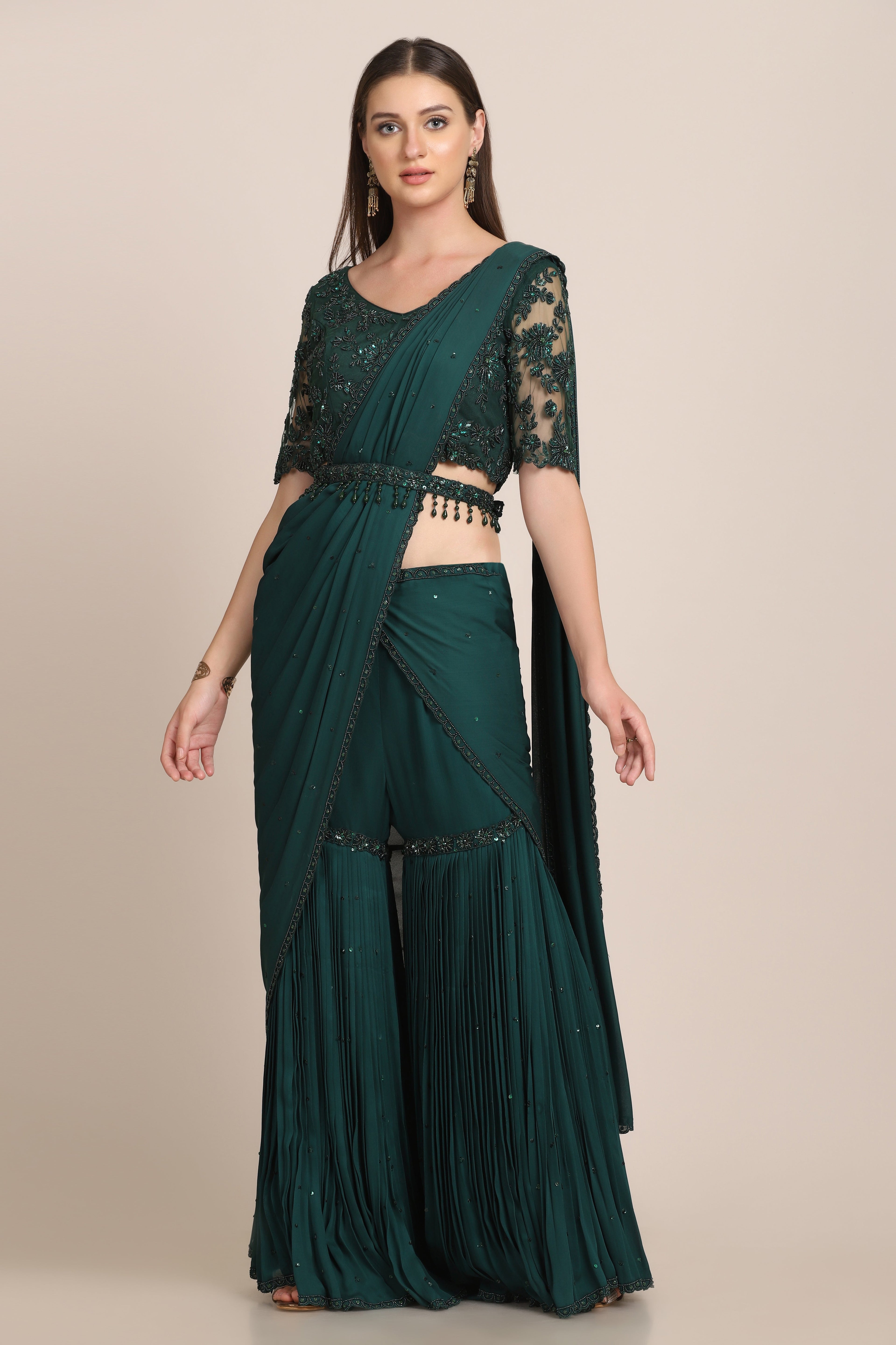 Featuring a kale green draped garara in georgette fabric embellished using tone on tone beads and sequins. This draped garara is complimented with an embroidered blouse and highlighted with an embellished belt. This is a three piece set including blouse, draped garara and belt.