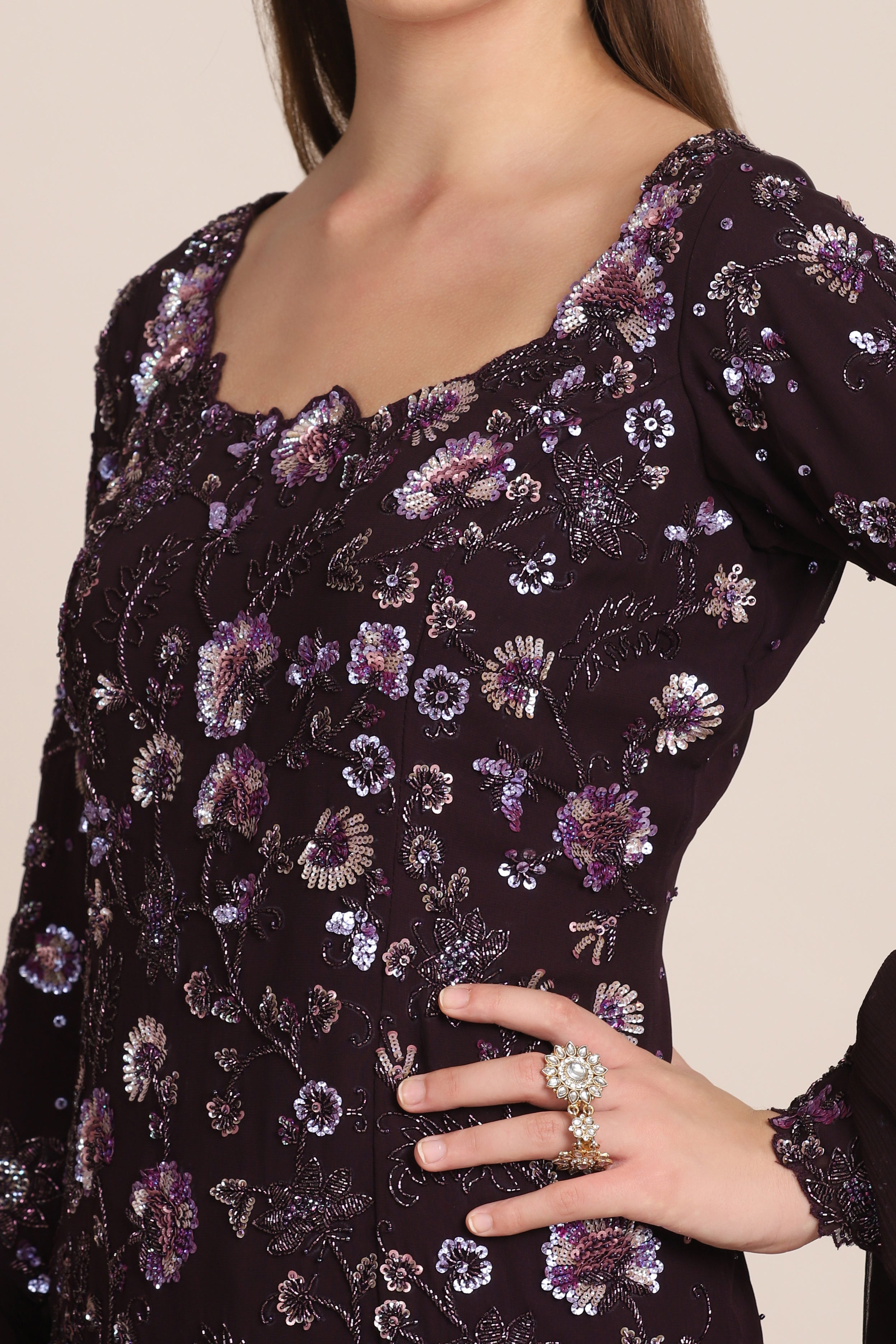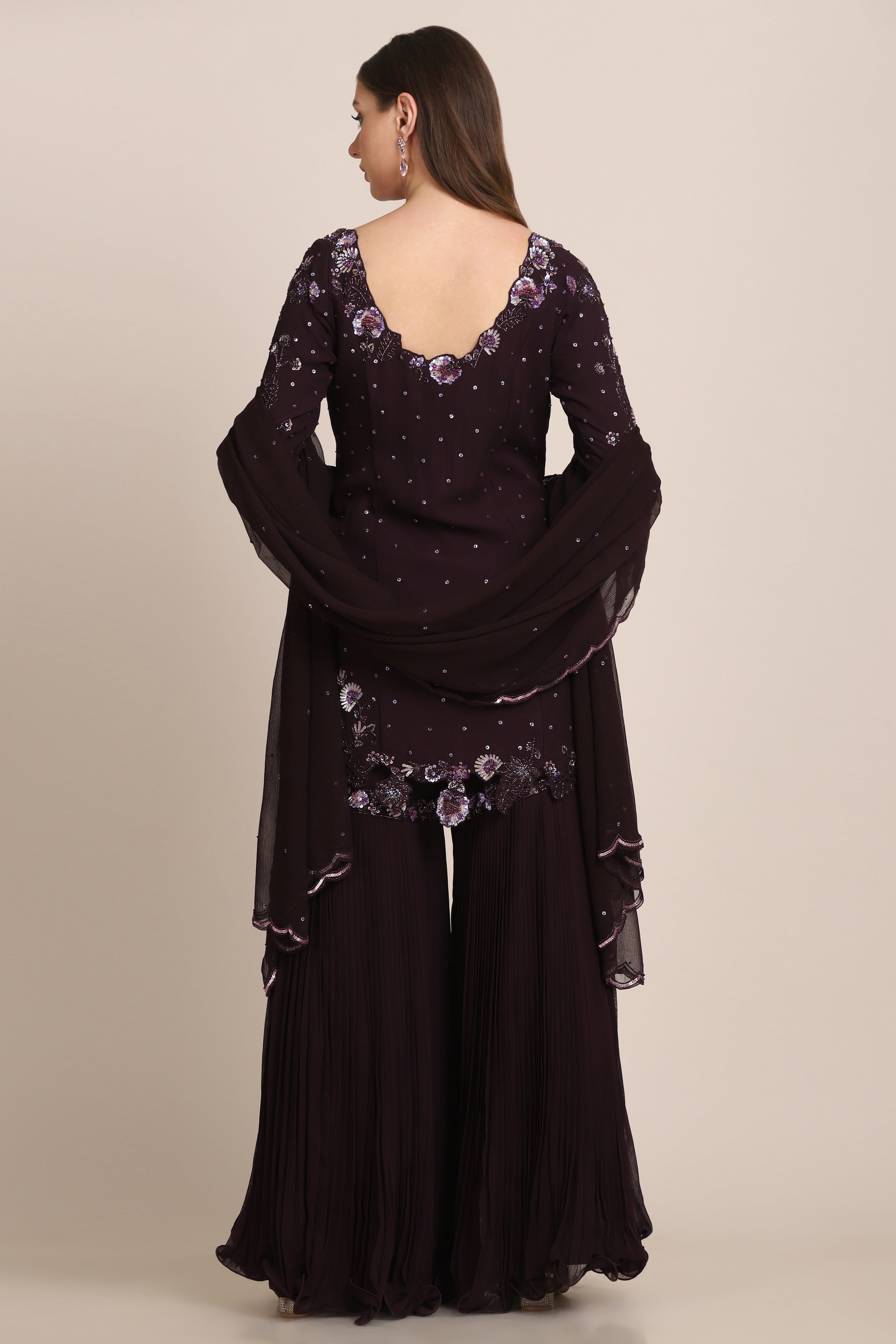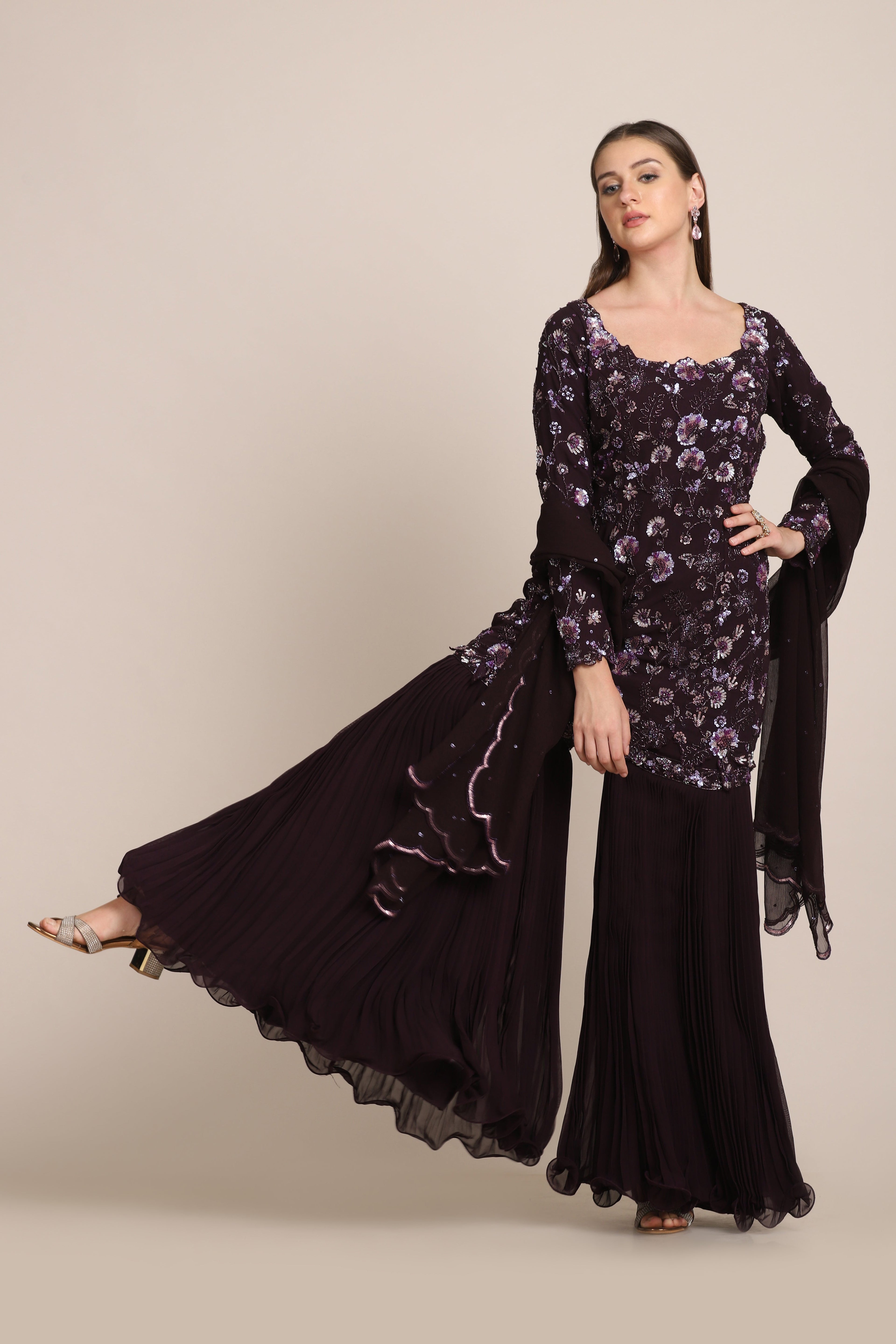 Featuring a resin purple garara in georgette fabric highlighted with micro pleating. This garara is complimented with a kurti embroidered using sequins and beads and a dupatta in chiffon. This is a three piece outfit including garara, kurti and dupatta.