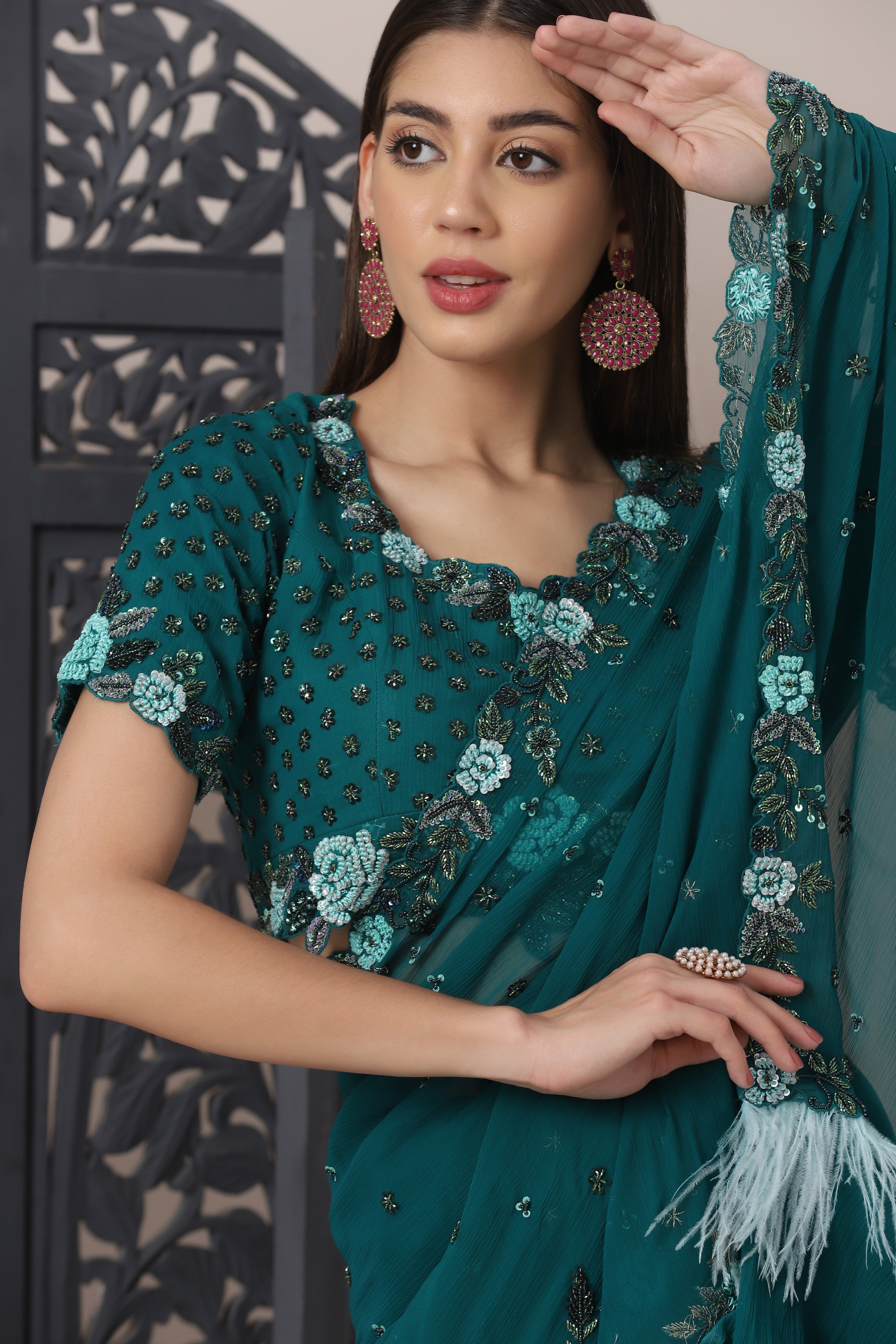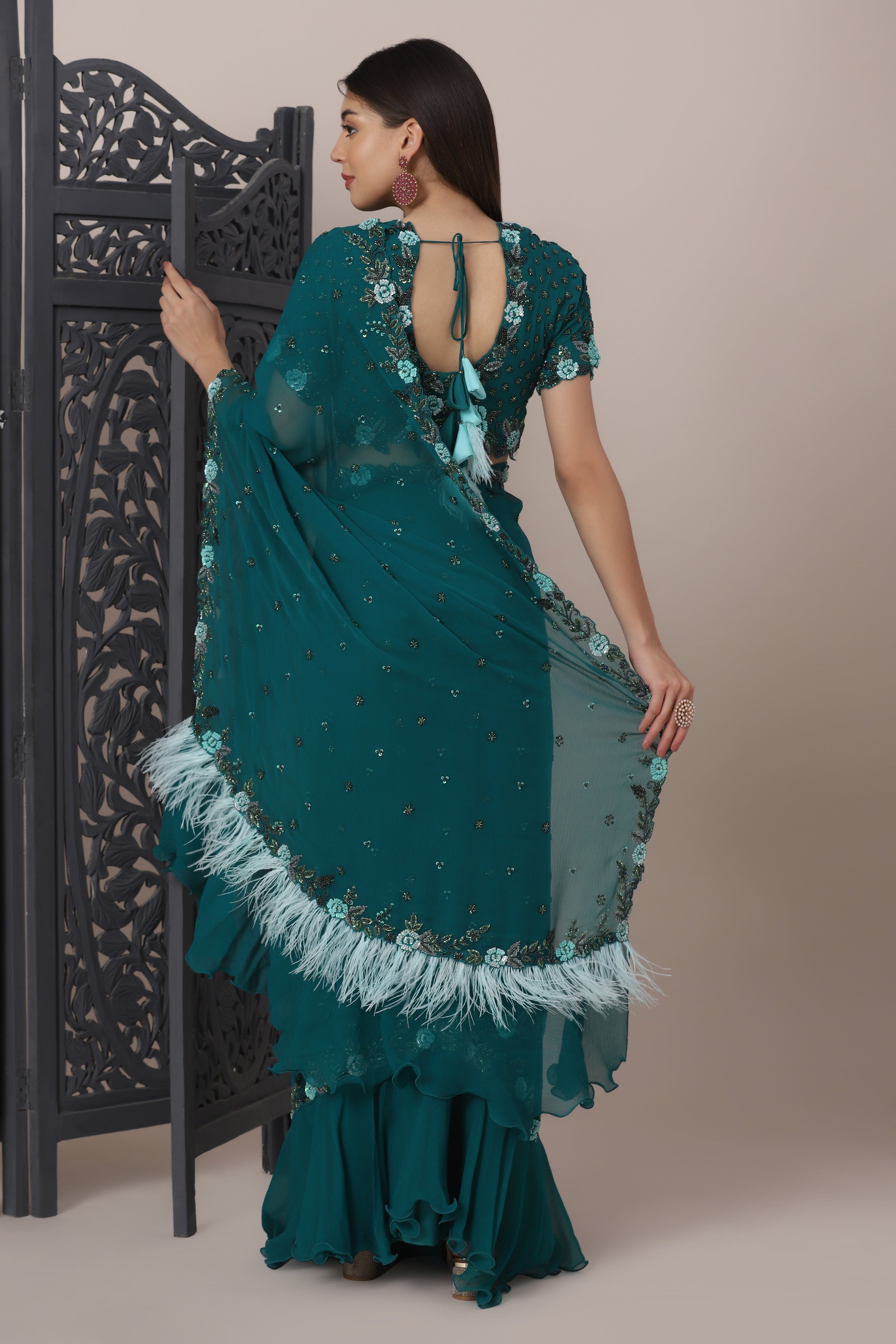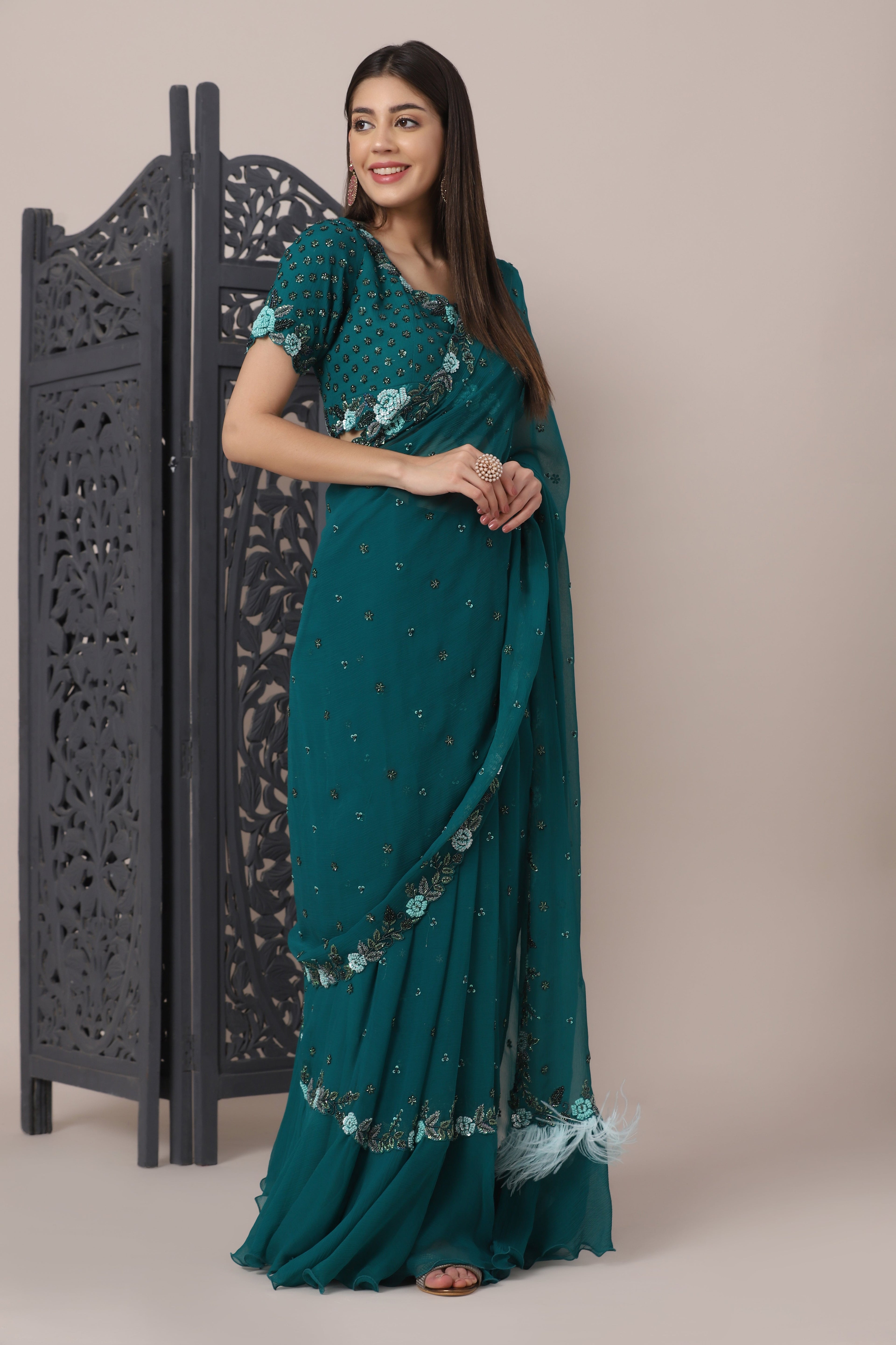 Featuring a deep teal ruffle saree in chiffon fabric, embellished with thread and beads. The pallu of this saree features faux feathers. This saree is paired with a hand embroidered blouse in chiffon. This two piece outfit includes a blouse and a saree.