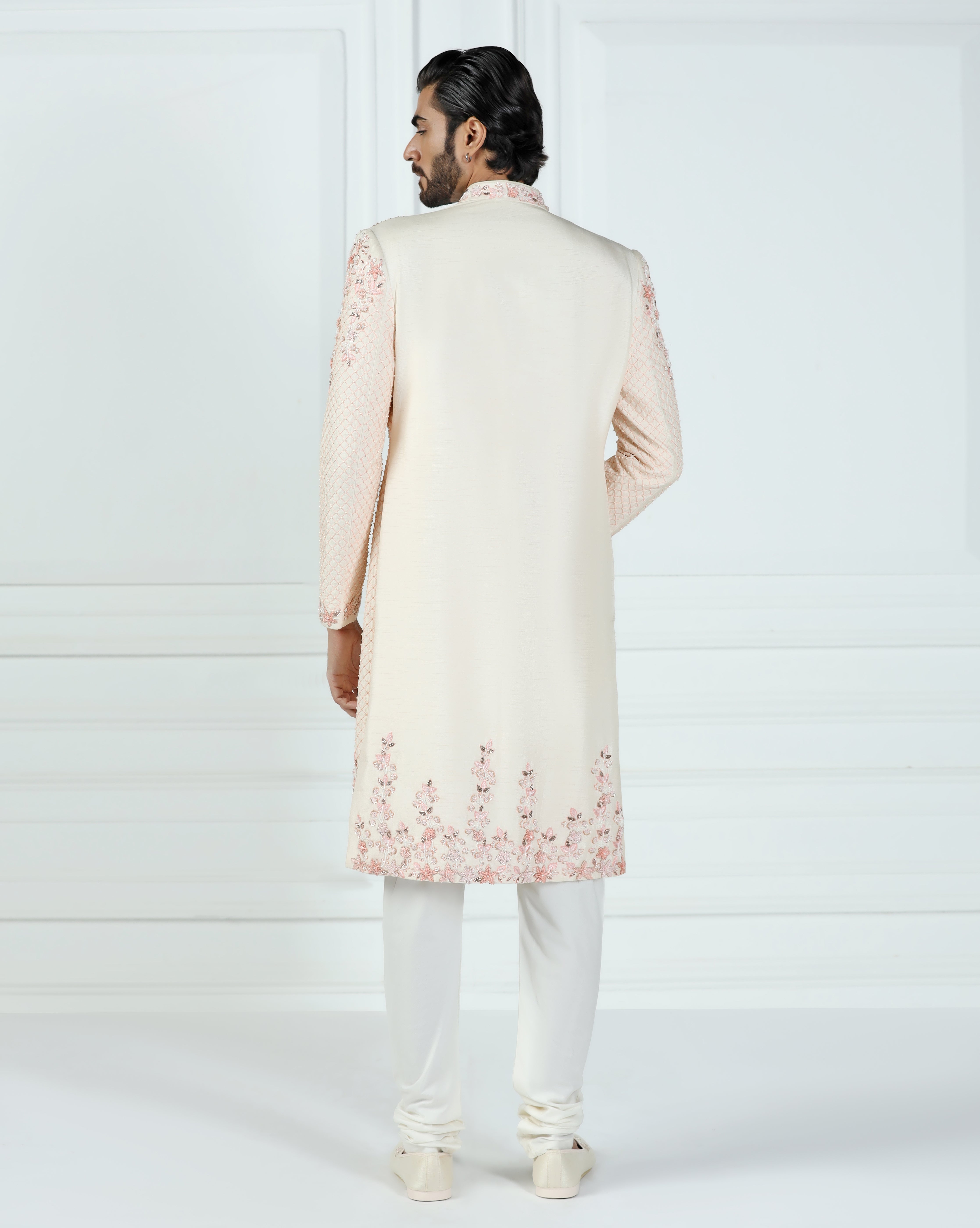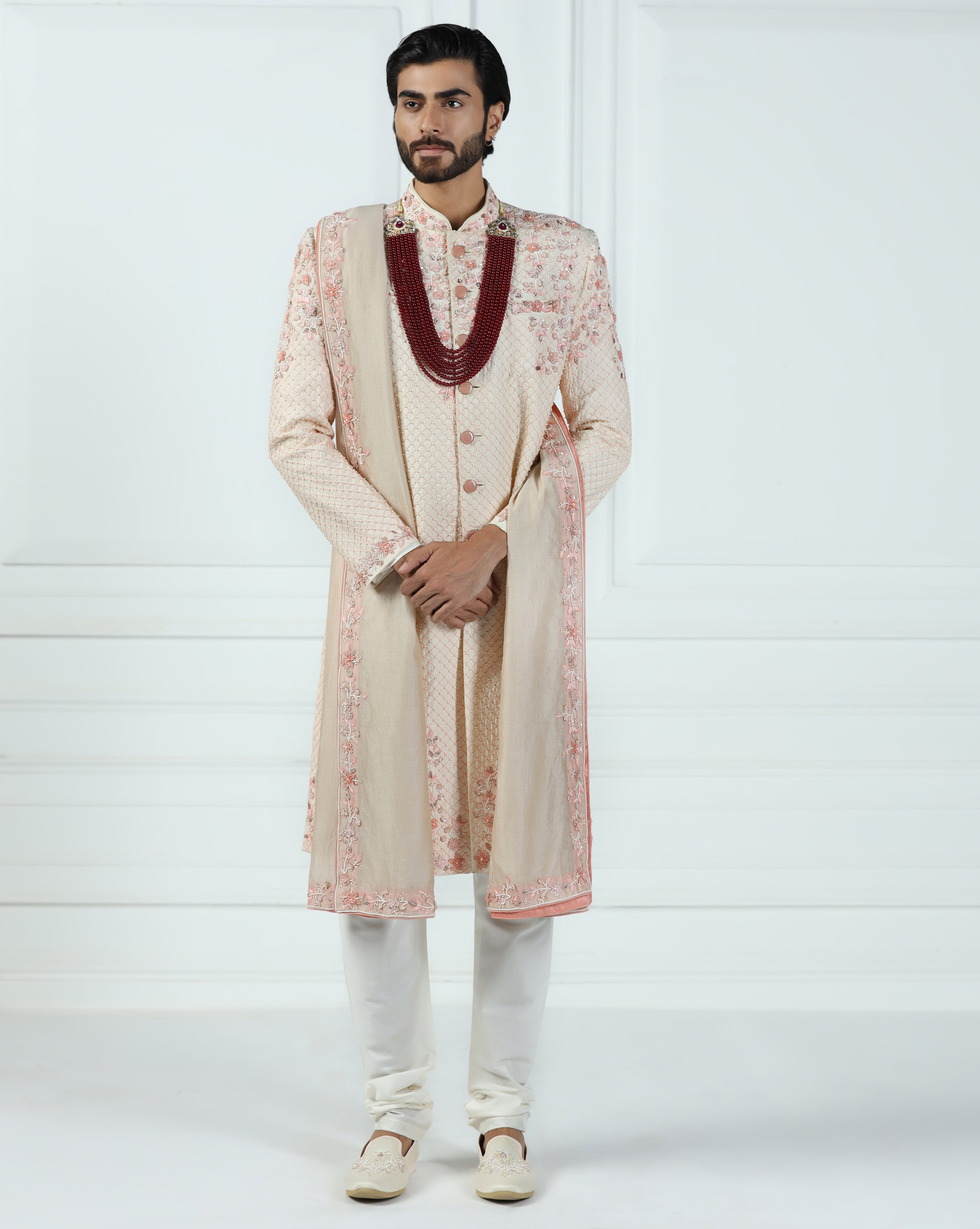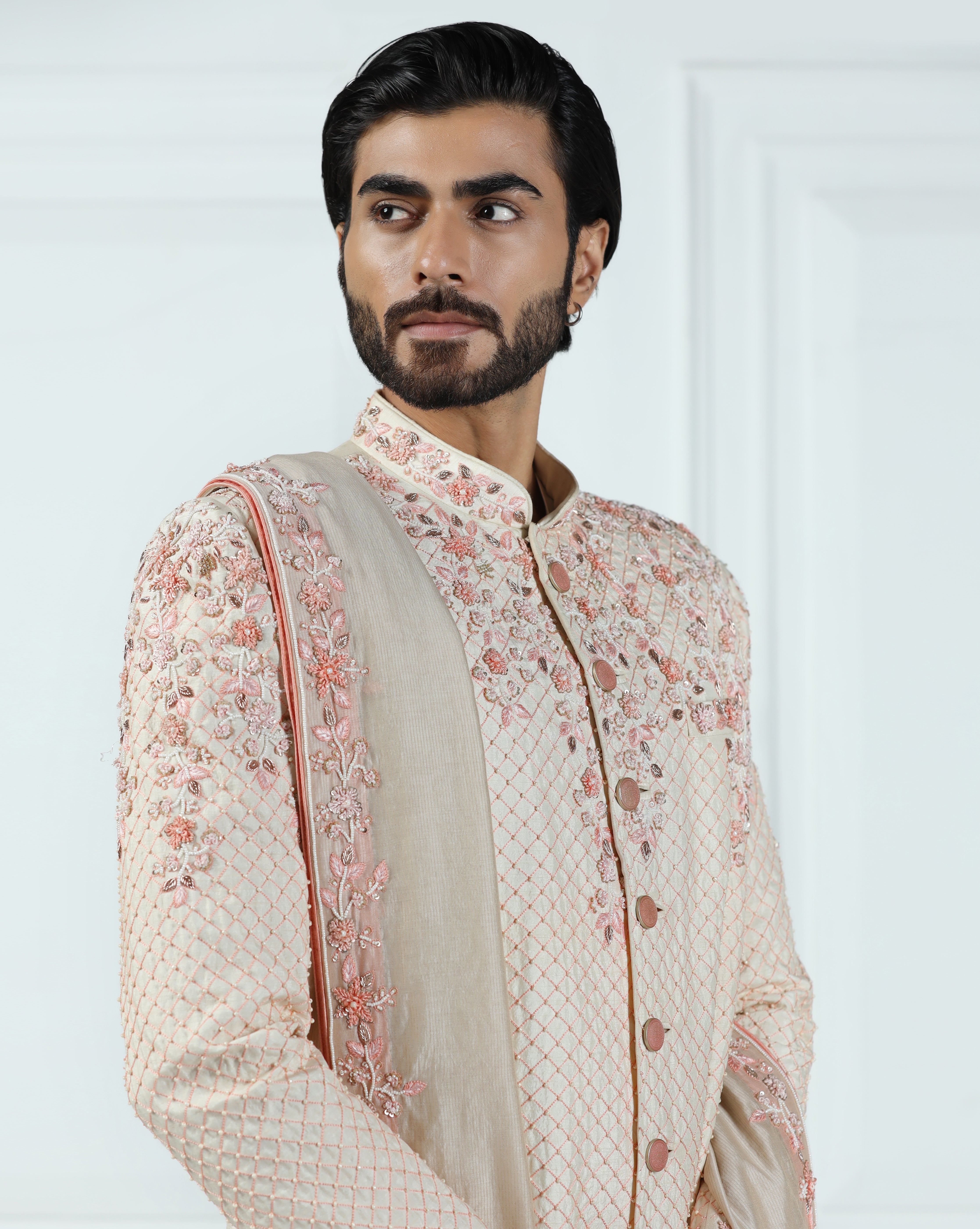 Featuring a malibu peach sherwani in viscose silk embellished using sequins, thread and french wire. This sherwani is paired with a hand embroidered stole, jooti, kurta, churidar pyjama and maala. This is a six piece set.