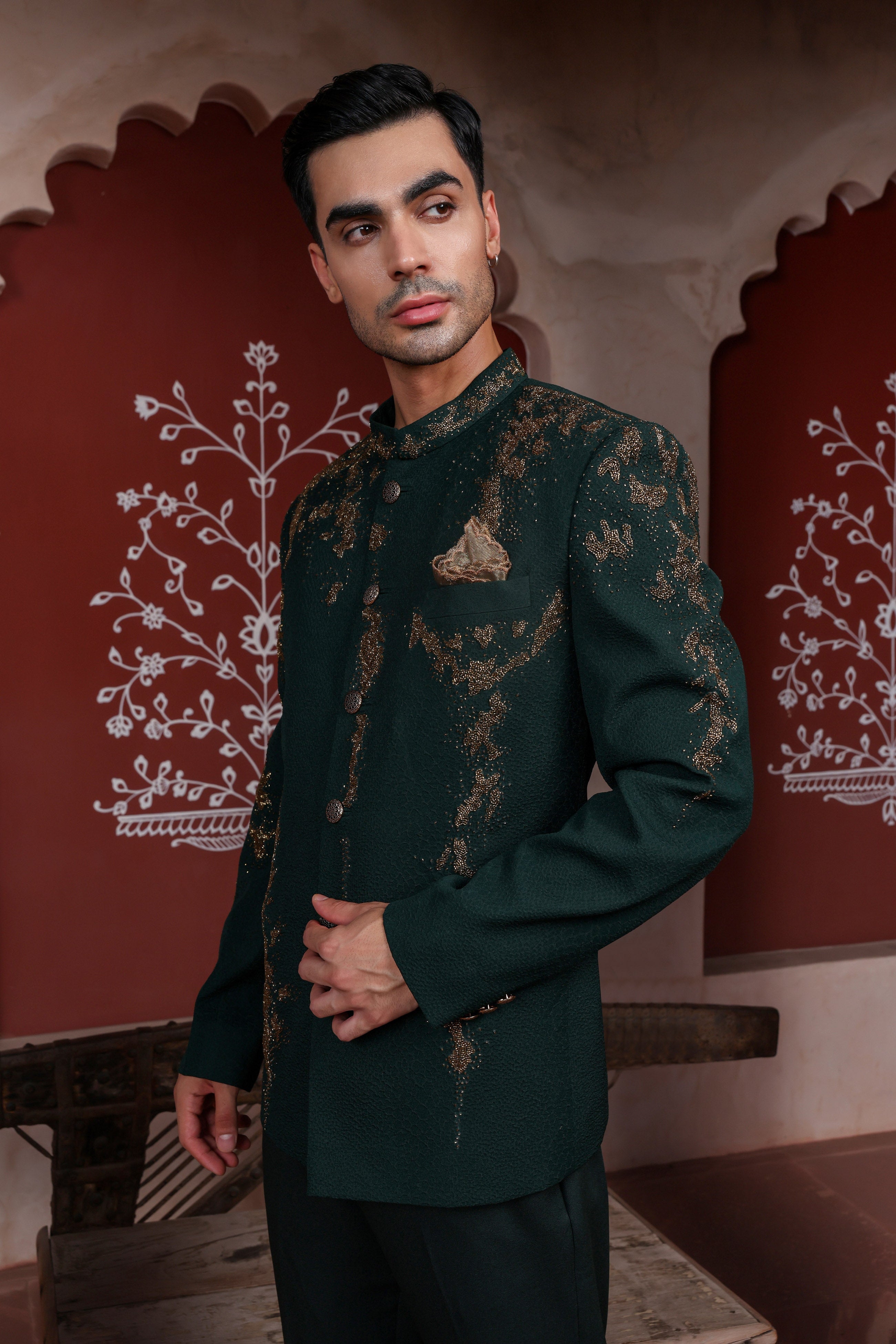 Featuring a hunter green bandhgala in lycra jacquard embellished using antique coloured beads. This is a two piece set featuring bandhgala and trouser.