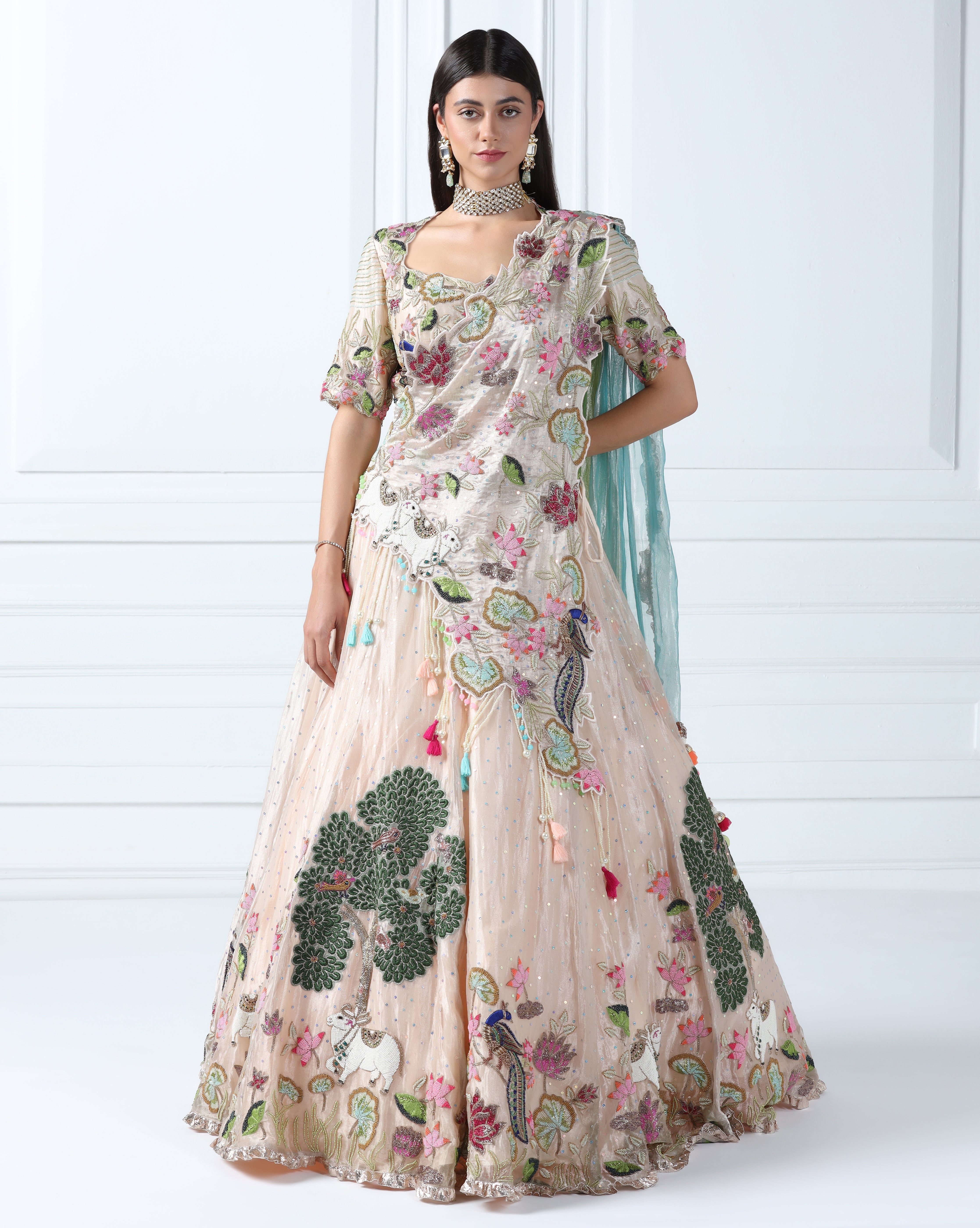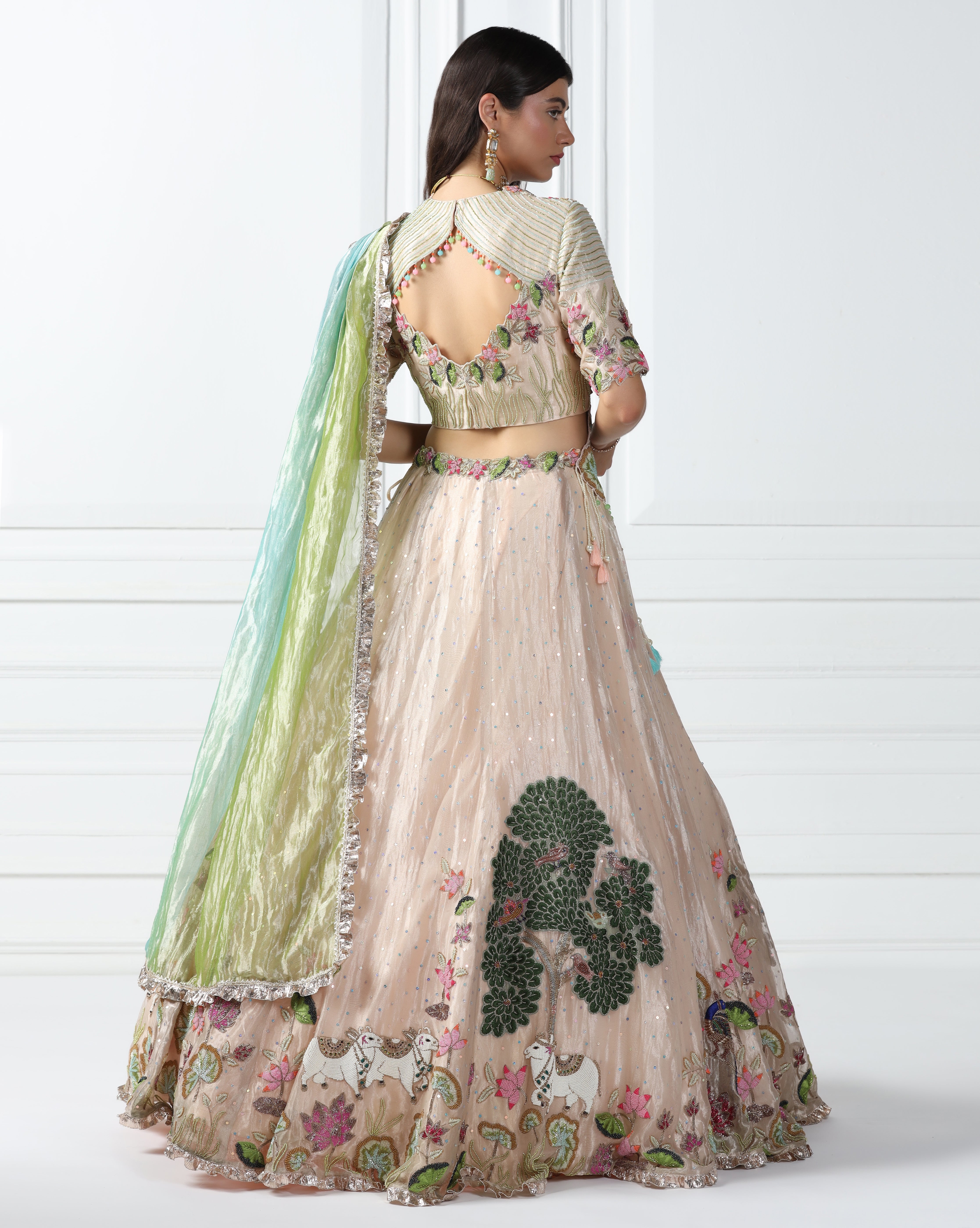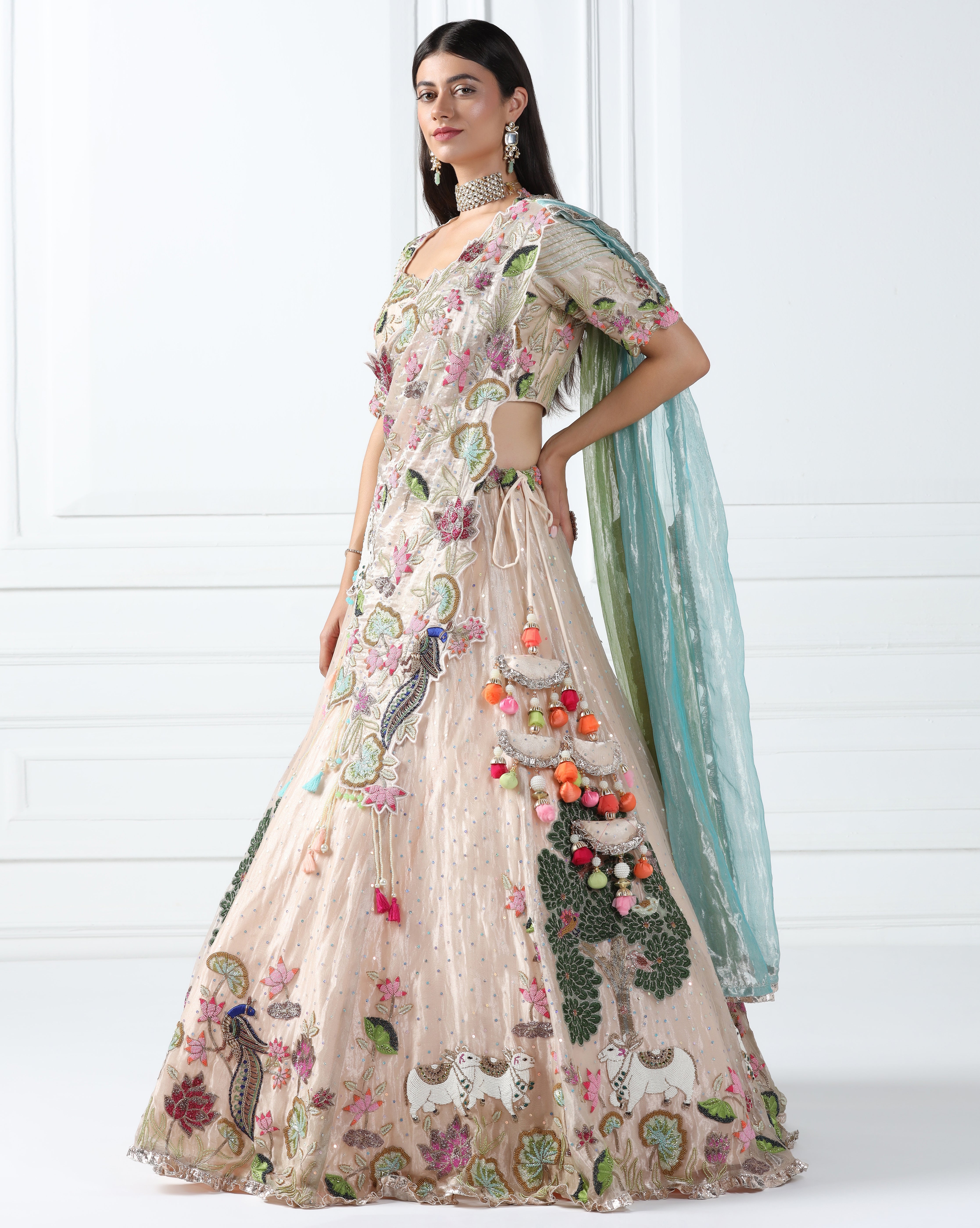 Featuring an icey peach lehenga in tissue fabric embellished using beads, sequin and thread. This lehenga features 'Pichwai' art motifs. This lehenga is paired with a coordinated embroidered blouse and an embellished asymmetric dupatta. This is a three piece outfit including lehenga, blouse and dupatta.